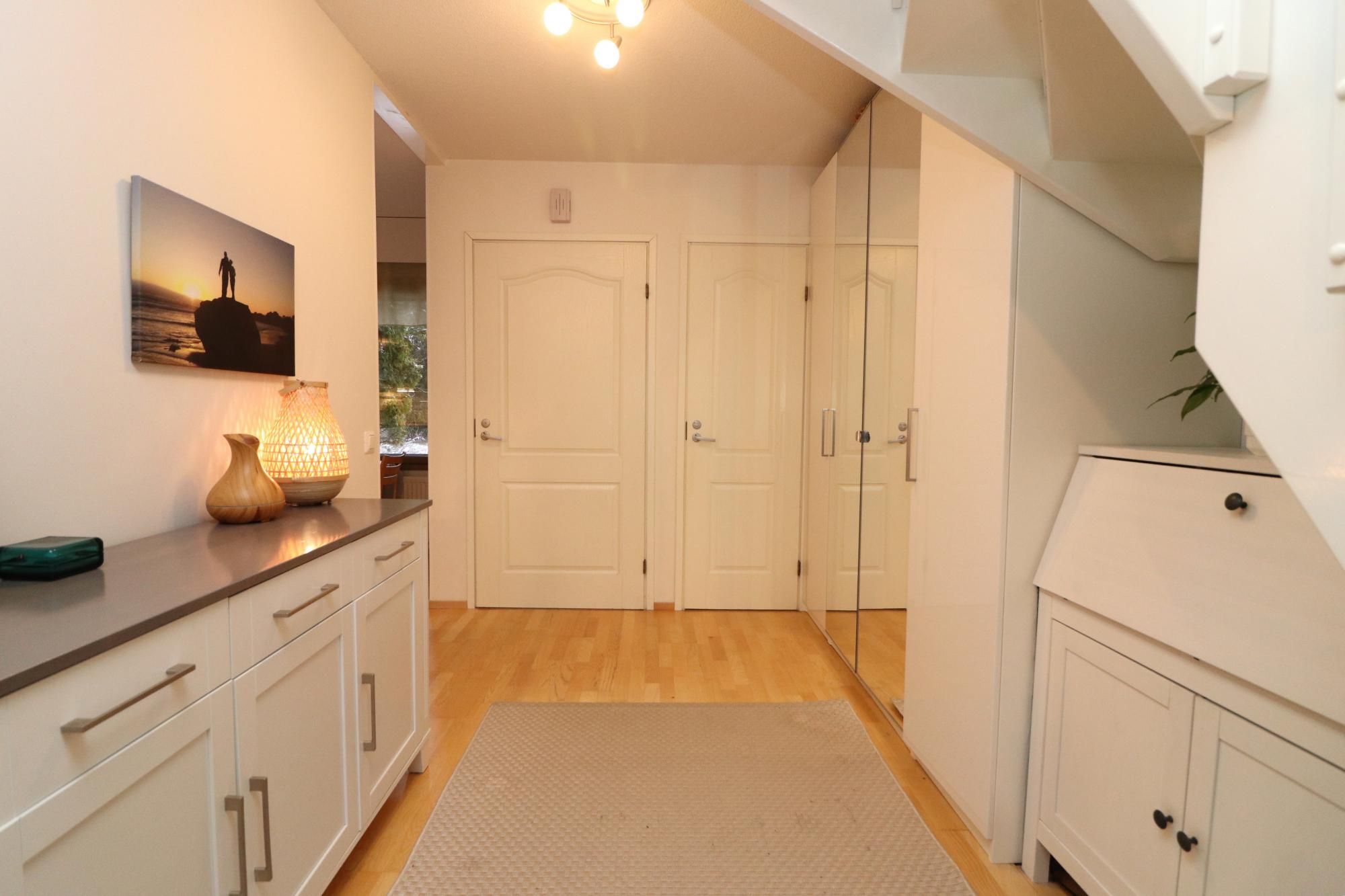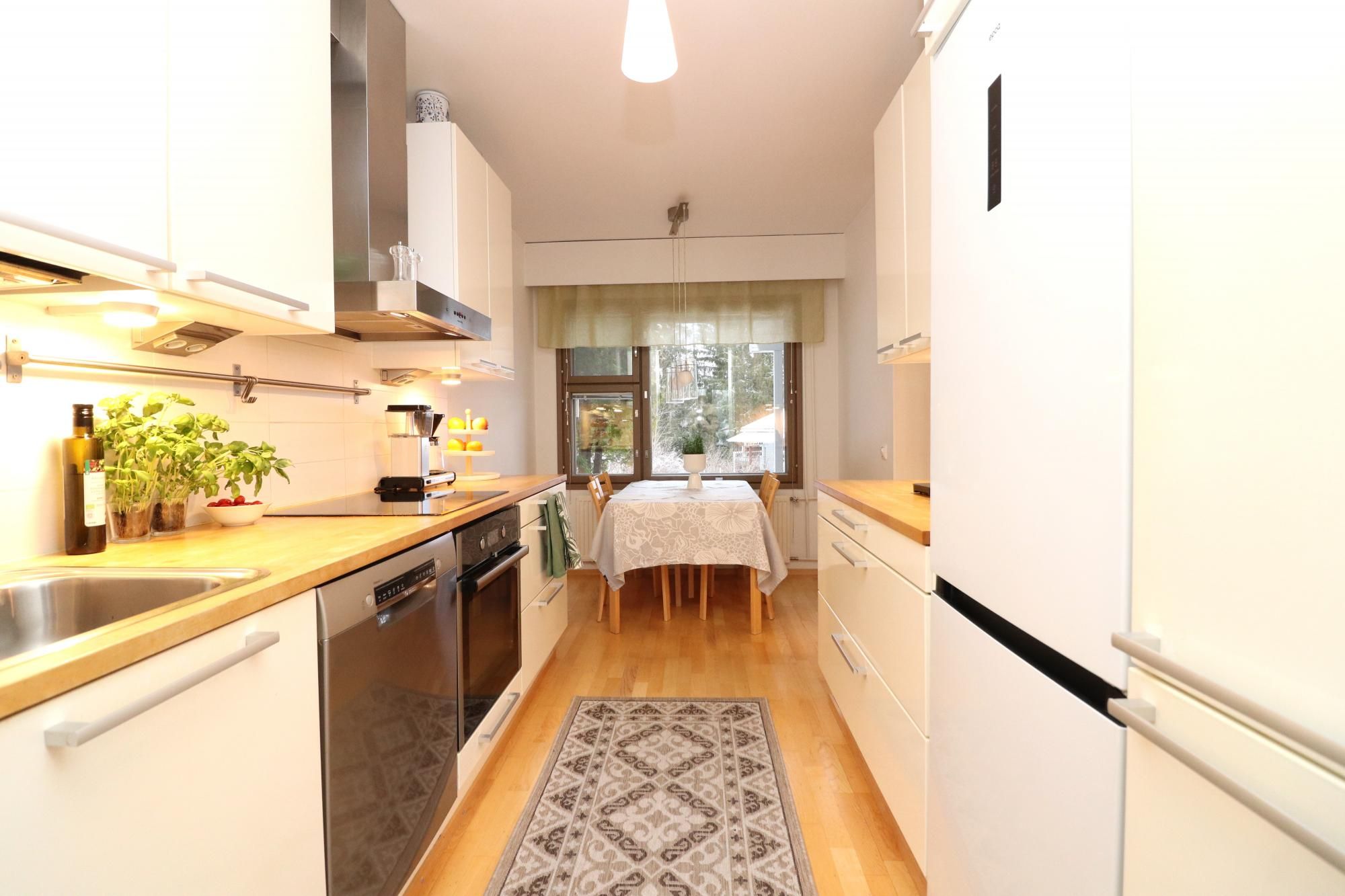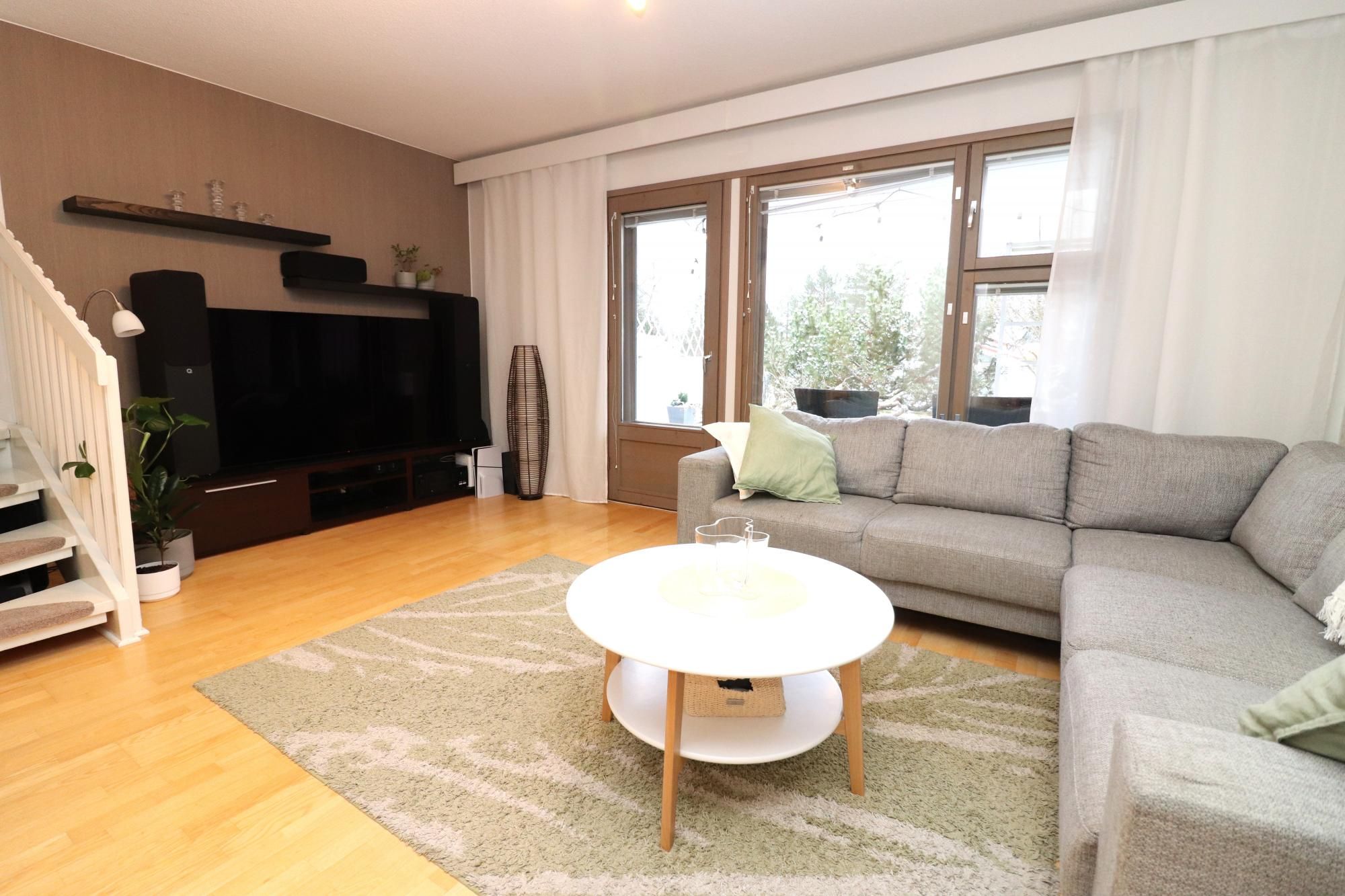 Kaunis kaksikerroksinen rivitalokolmio rauhallisella asuinalueella. Asuntoa on remontoitu tyylikkäin materiaalivalinnoin vuosien aikana, kylpyhuone on saanut täysin uuden ilmeen viime vuonna. Alakerrassa keittiö, olohuone, erillinen wc sekä käynti omalle pihalle jossa terassi. Yläkerrassa kaksi makuuhuonetta sekä kylpyhuone ja sauna. Keittiössä jääkaappi/pakastin, liesi/liesituuletin, astianpesukone, runsaasti kaappi- ja laskutilaa sekä hyvin tilaa ruokapöydälle. Ilmalämpöpumppu sijaitsee toisessa makuuhuoneessa tuoden helpotusta lämpimiin päiviin. Huoneistolle kuuluu oma pistokkeellinen autopaikka, vuokralaisen käytössä myös ulkovarasto. Rauhallinen asuinalue, josta hyvät kulkuyhteydet joka suuntaan: nopeat siirtymät moottoritielle, kaikki palvelut ja kauppakeskus Matkus muutaman minuutin ajomatkan päässä. Sijainti järven tuntumassa ja mahdollisuus vaikkapa omaan venepaikkaan! Huoneisto vuokrataan mielellään pidemmäksi aikaa, mutta kuitenkin vähintään vuodeksi.