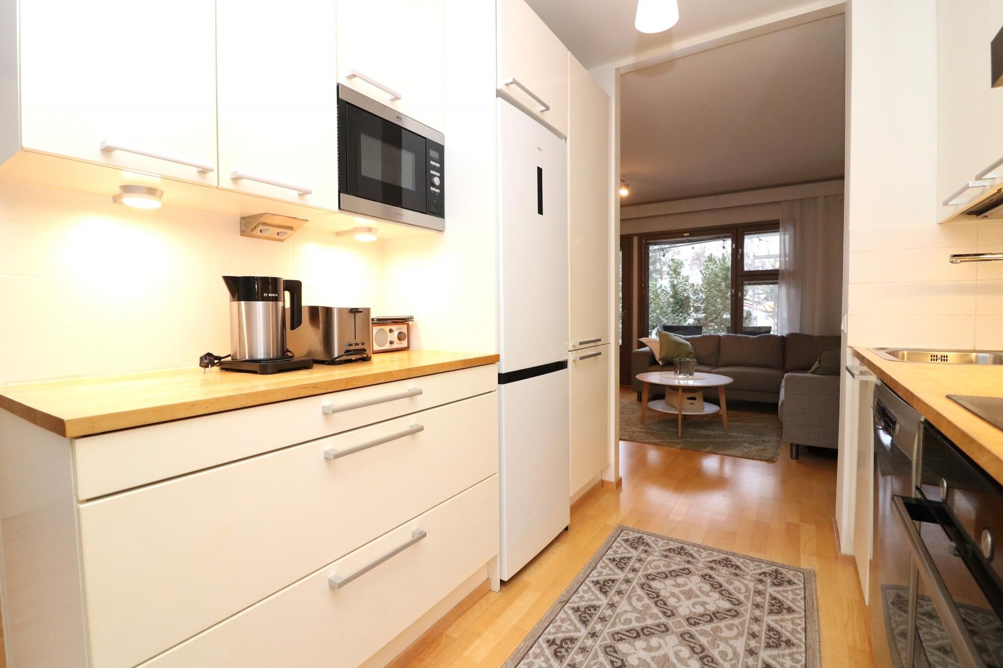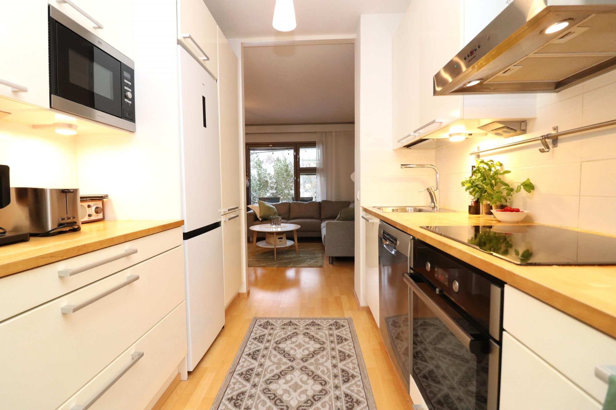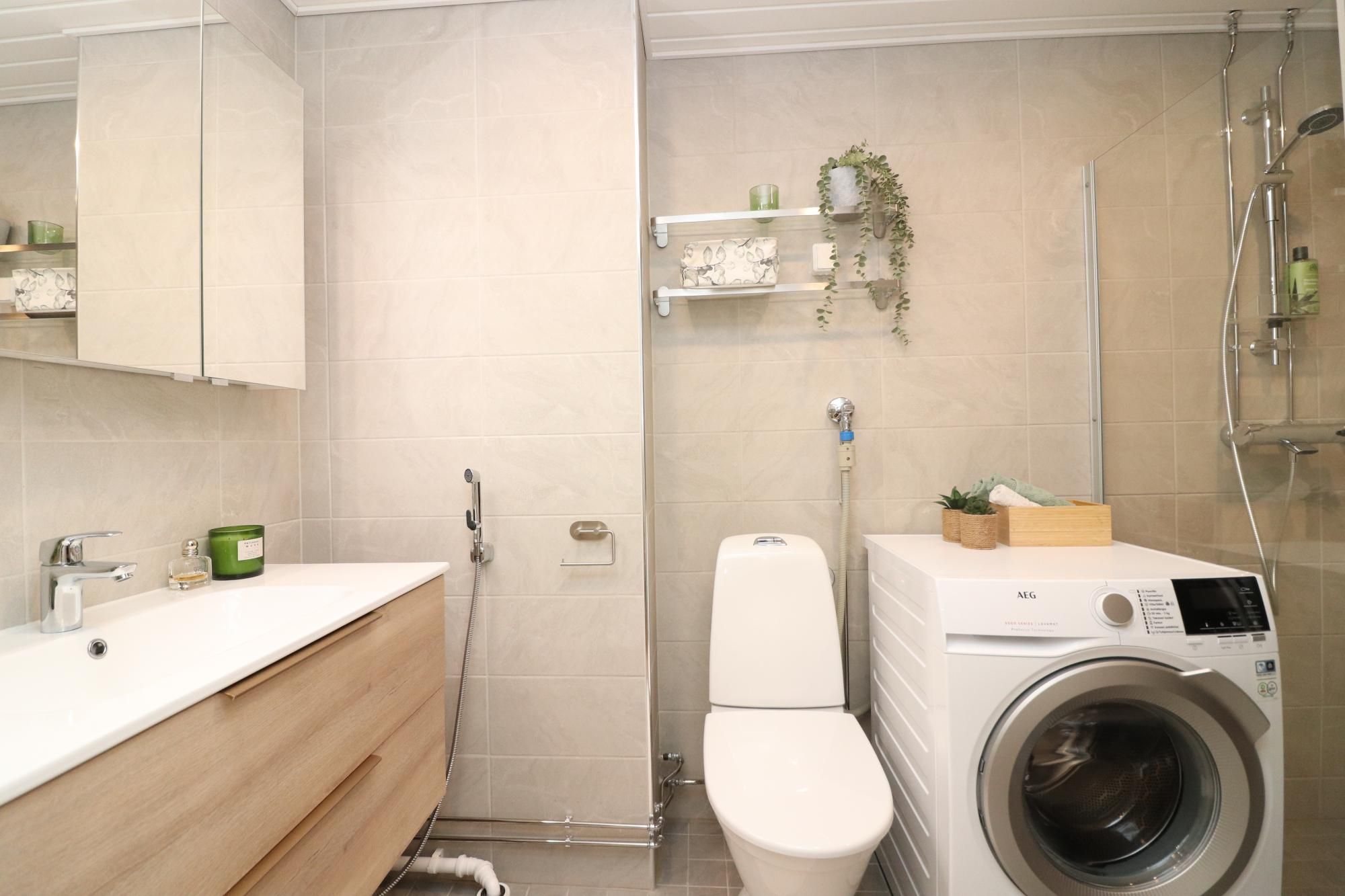 Kaunis kaksikerroksinen rivitalokolmio rauhallisella asuinalueella. Asuntoa on remontoitu tyylikkäin materiaalivalinnoin vuosien aikana, kylpyhuone on saanut täysin uuden ilmeen viime vuonna. Alakerrassa keittiö, olohuone, erillinen wc sekä käynti omalle pihalle jossa terassi. Yläkerrassa kaksi makuuhuonetta sekä kylpyhuone ja sauna. Keittiössä jääkaappi/pakastin, liesi/liesituuletin, astianpesukone, runsaasti kaappi- ja laskutilaa sekä hyvin tilaa ruokapöydälle. Ilmalämpöpumppu sijaitsee toisessa makuuhuoneessa tuoden helpotusta lämpimiin päiviin. Huoneistolle kuuluu oma pistokkeellinen autopaikka, vuokralaisen käytössä myös ulkovarasto. Rauhallinen asuinalue, josta hyvät kulkuyhteydet joka suuntaan: nopeat siirtymät moottoritielle, kaikki palvelut ja kauppakeskus Matkus muutaman minuutin ajomatkan päässä. Sijainti järven tuntumassa ja mahdollisuus vaikkapa omaan venepaikkaan! Huoneisto vuokrataan mielellään pidemmäksi aikaa, mutta kuitenkin vähintään vuodeksi.