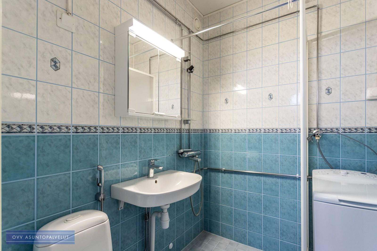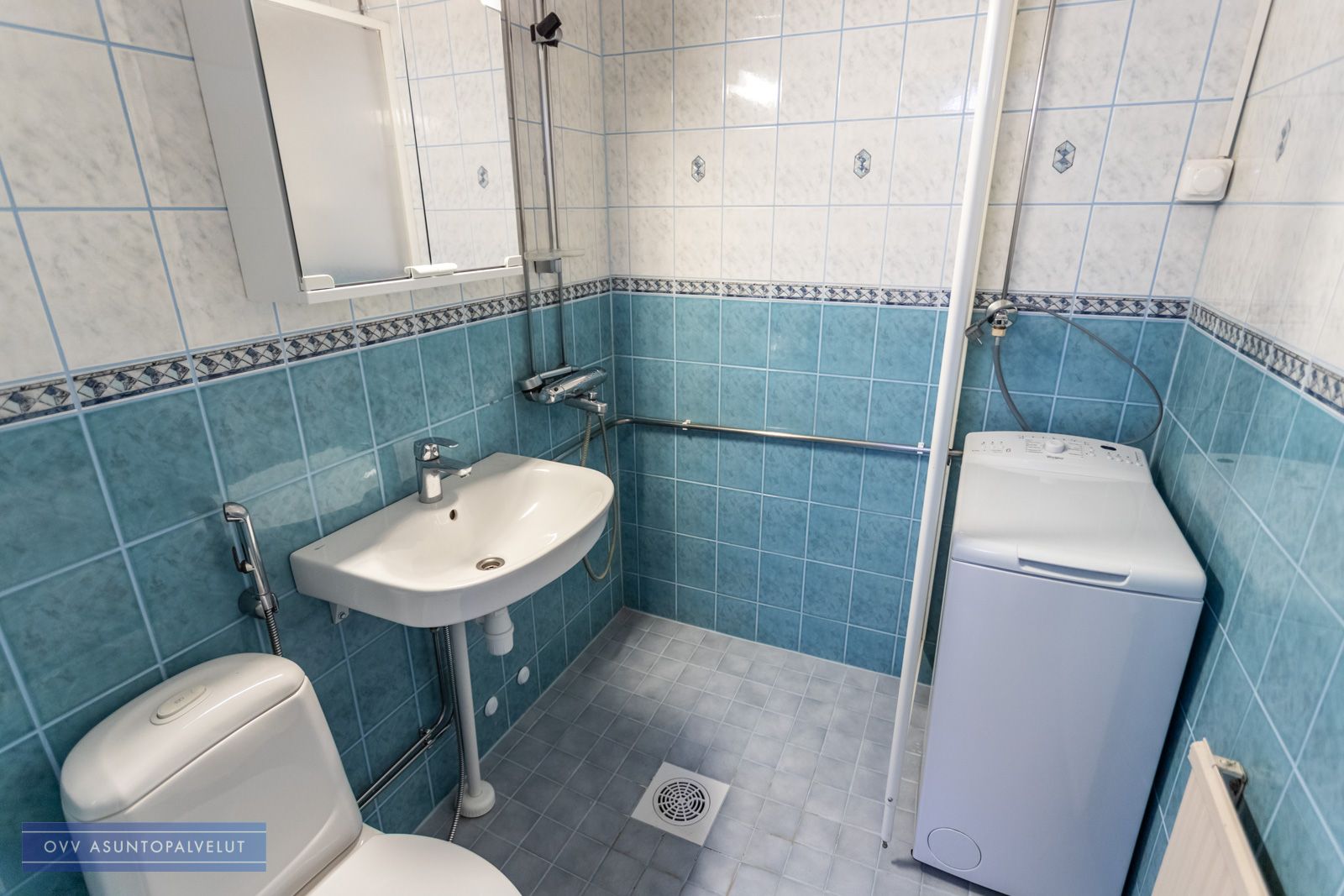 Kylpyhuoneesta löytyy hyvin tilaa pyykinpesukoneelle. Asunnossa valmiiksi pyykinpesukone vuokralaisen käyttöön tai voit tuoda tarvittaessa oman koneen.