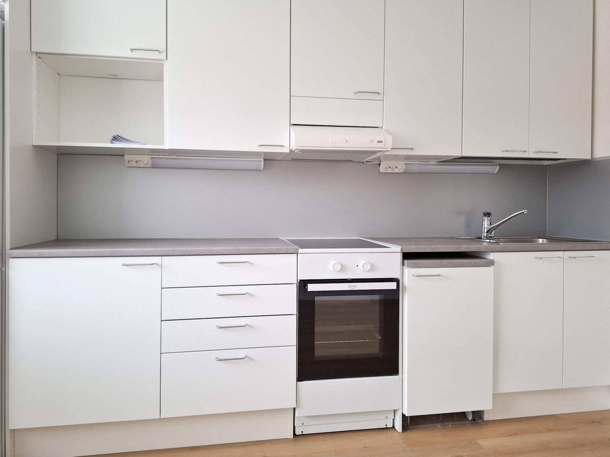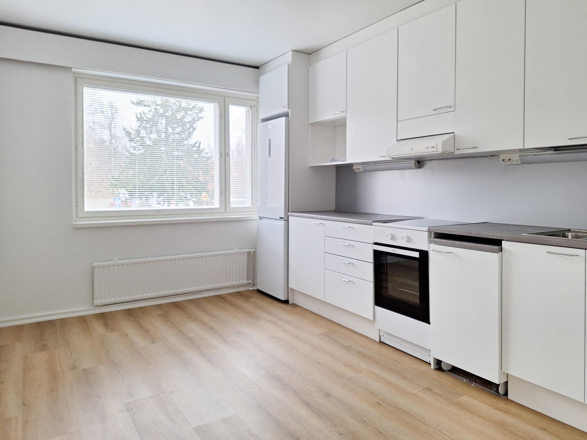 Tilava keittiö on hyvin varusteltu, liitäntä 45 cm astianpesukoneelle, keraaminen liesi ja jääpakastinkaappi.