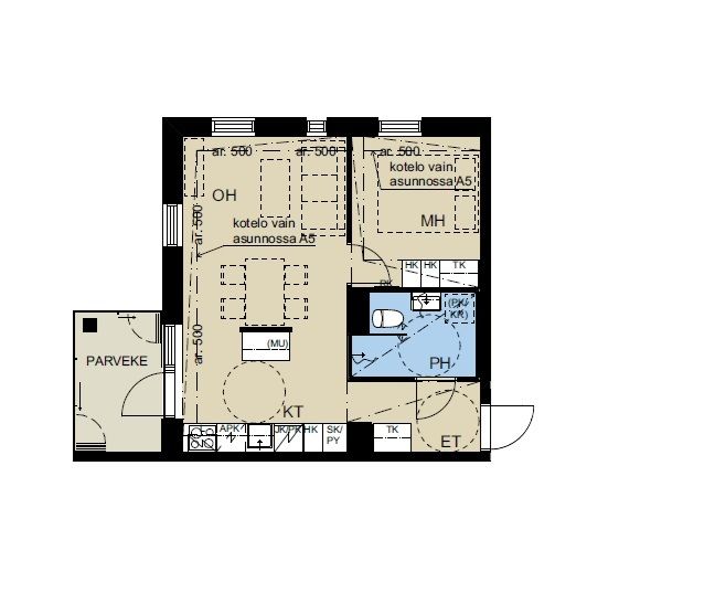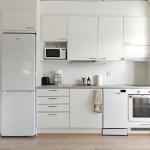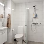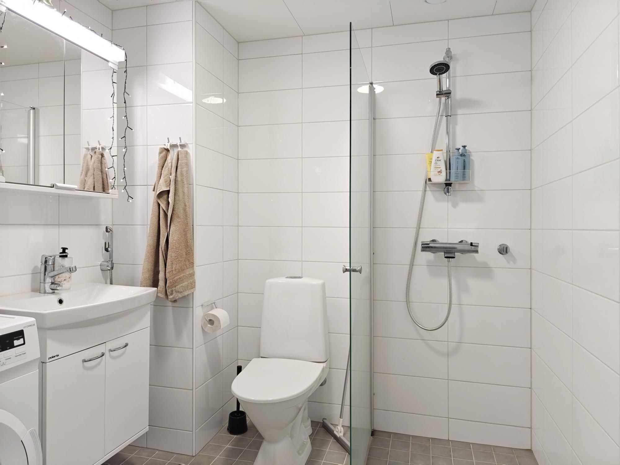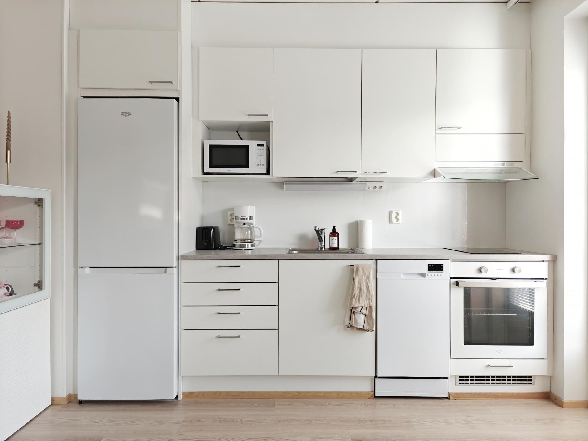 Lattiat laminaattia, seinät maalattu. Keittiössä keraaminen liesi, jääpakastinkaappi sekä astianpesukone. Kaakeloitu kylpyhuone, tila ja liitäntä pesukoneelle.