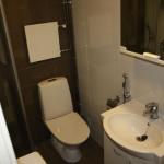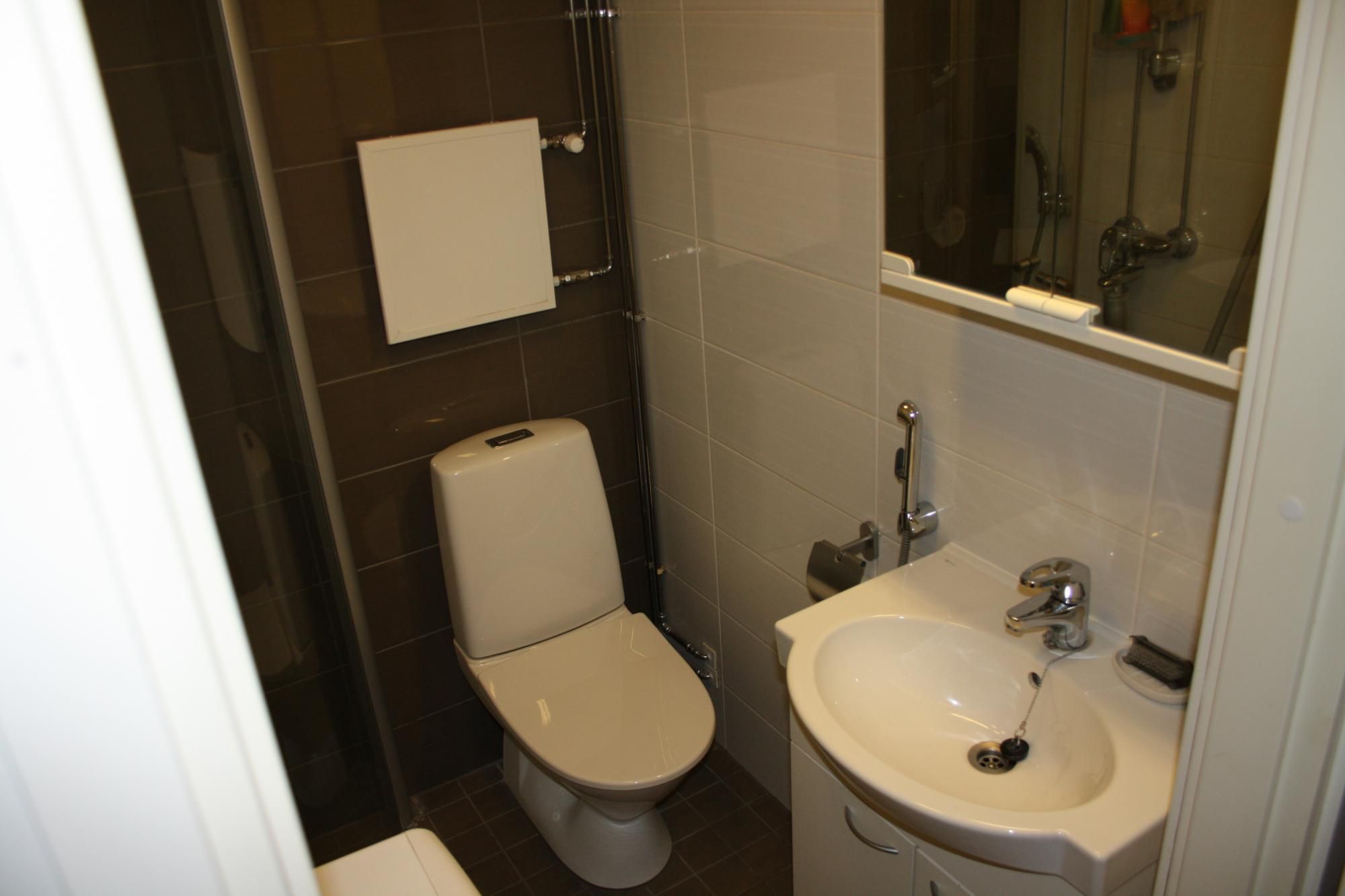 Kylpyhuoneeseen mahtuu kapea pyykinpesukone.