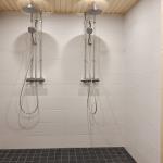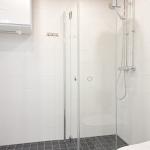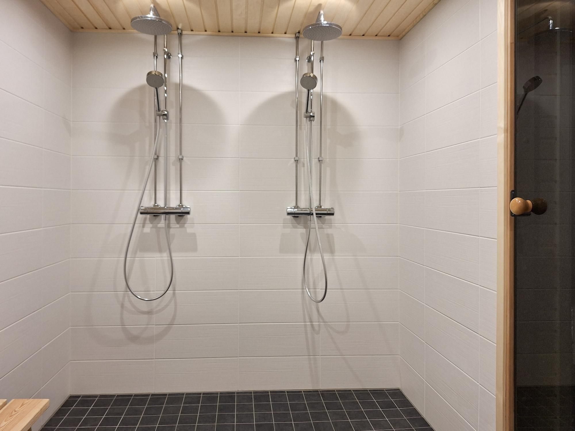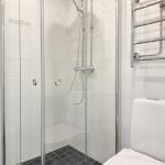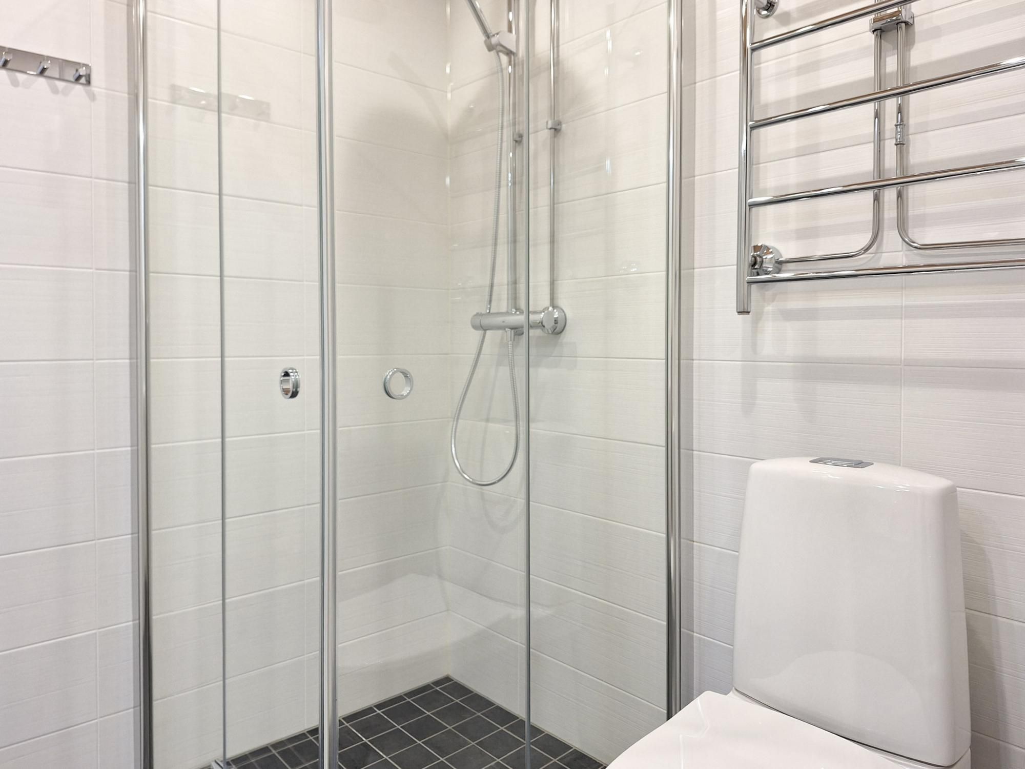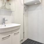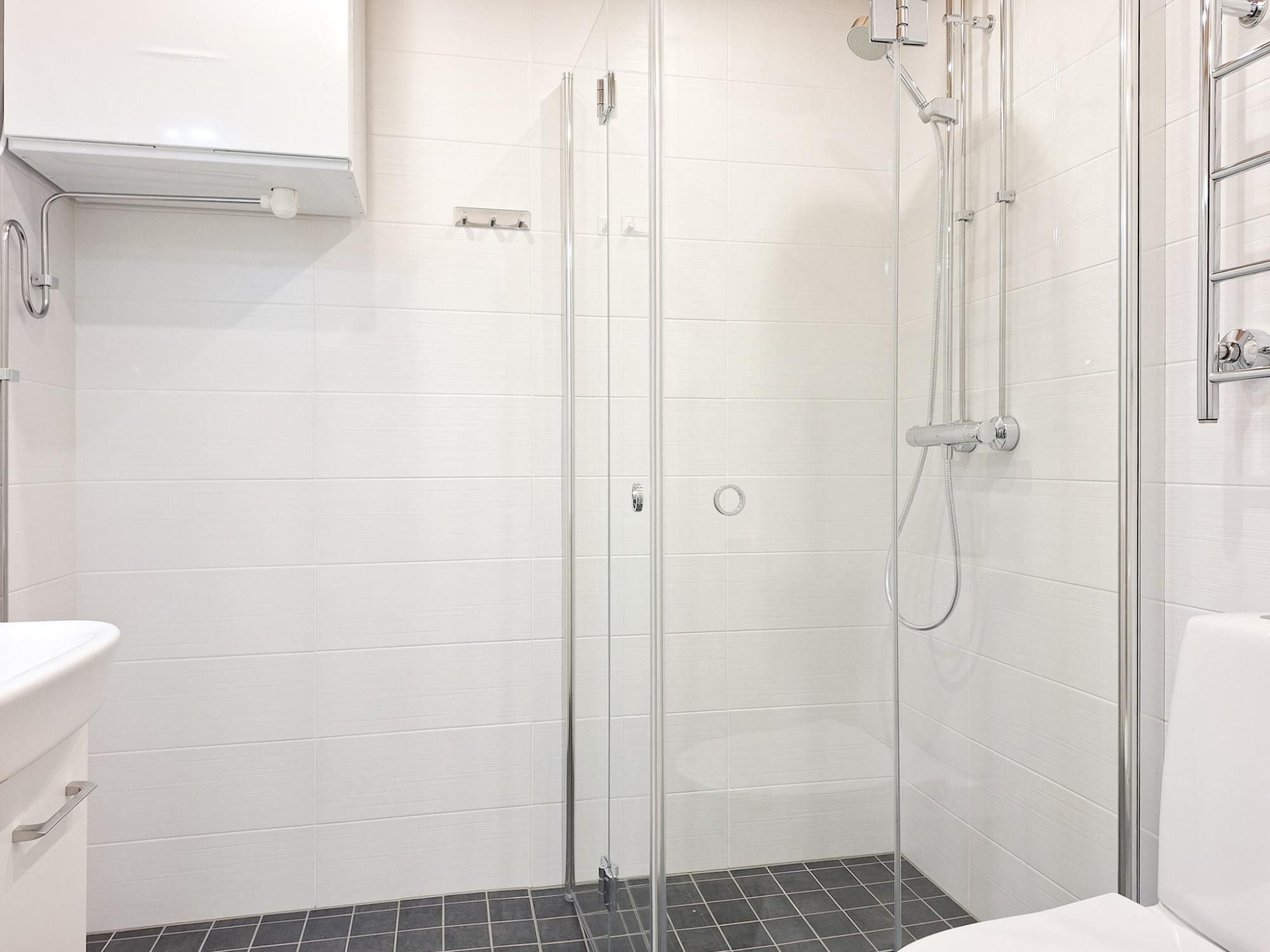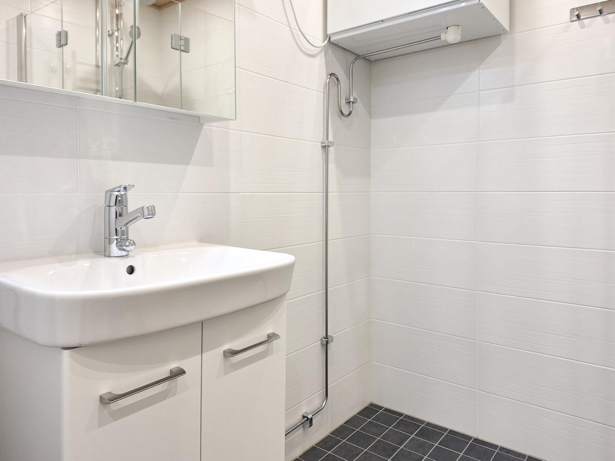 Kylpyhuoneessa tavarat pysyvät järjestyksessä peili- ja allaskaapistossa, liitäntä ja tilavaraus pyykinpesukoneelle on.