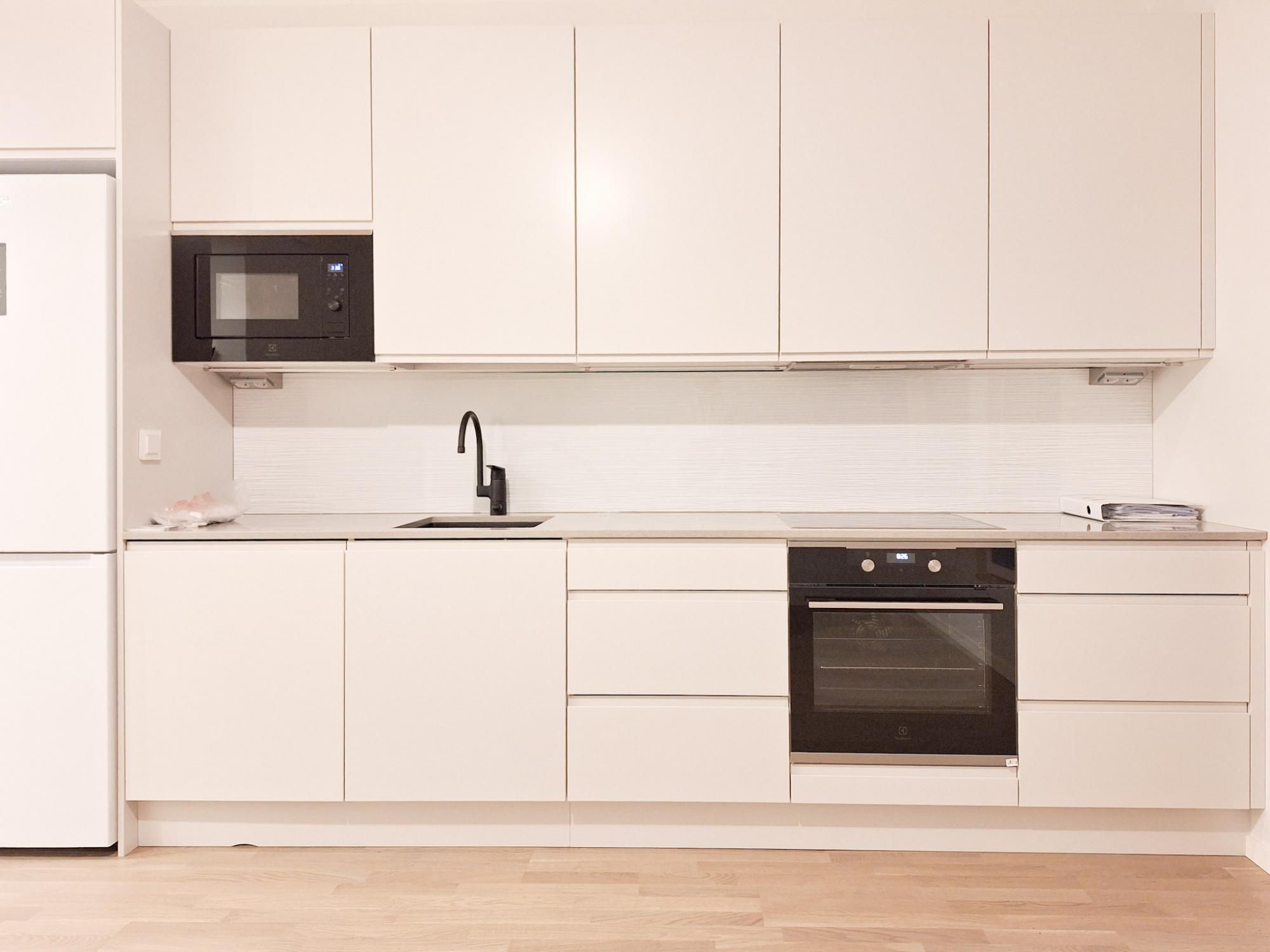 Laadukkaasti sisustetun keittotilan varusteina on kalusteisiin integroidut astianpesukone, jääkaappipakastin, induktioliesi ja liesituuletin sekä mikro.
