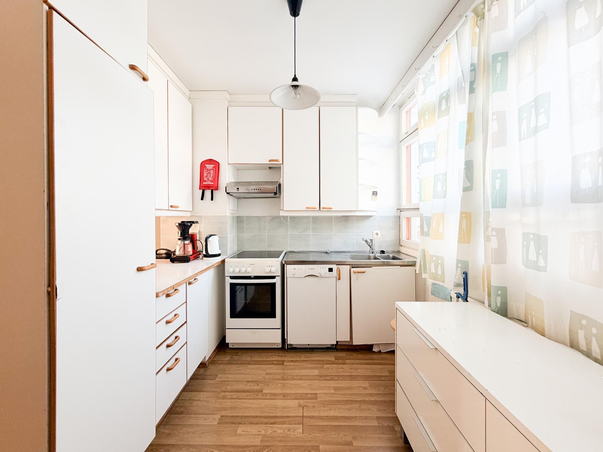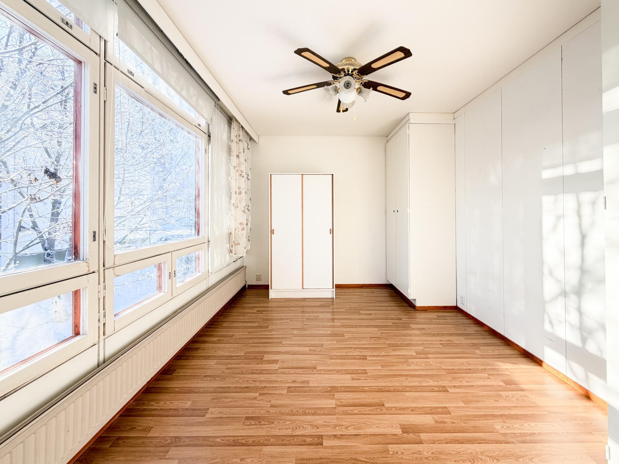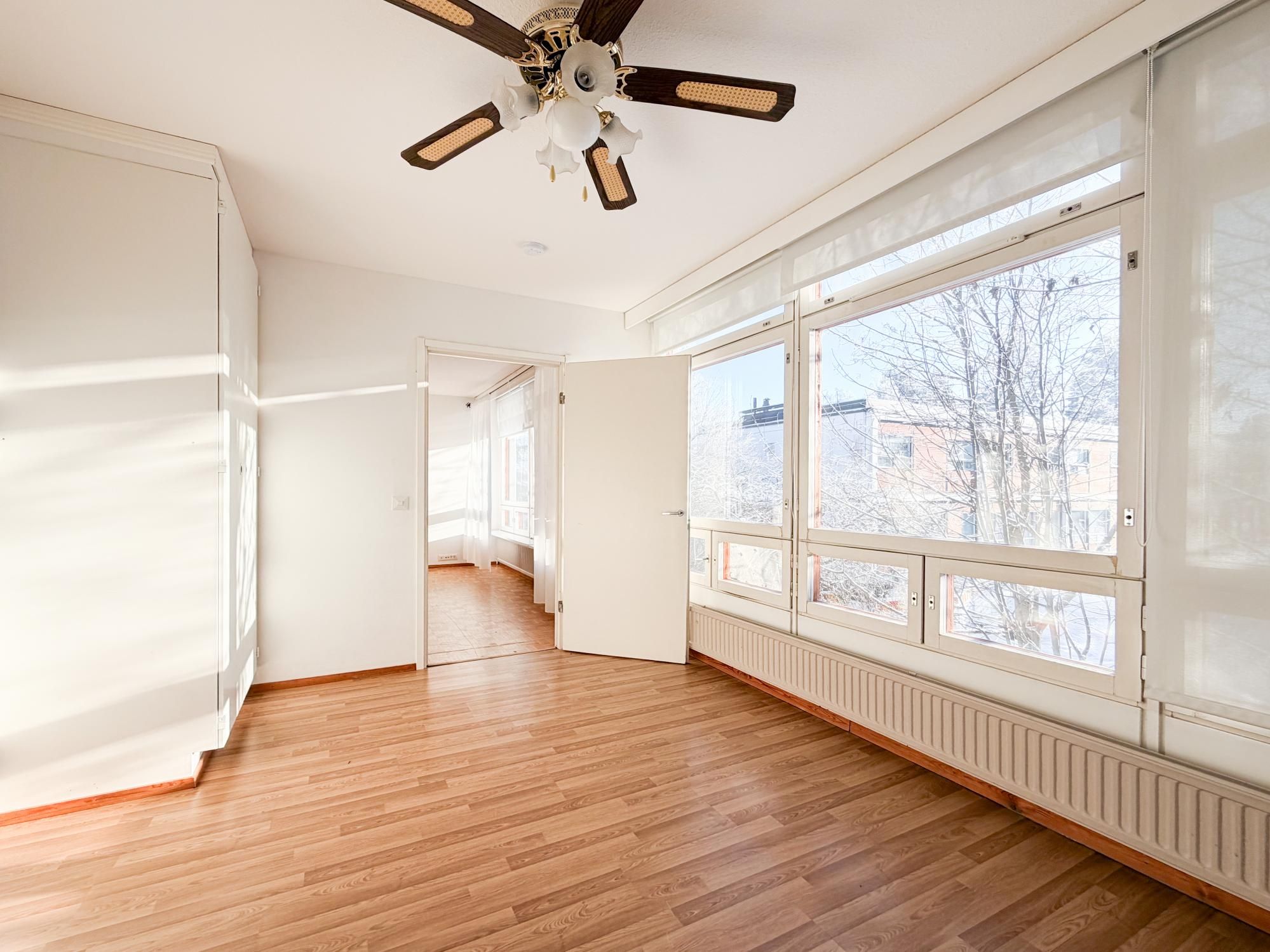 Valoisa läpitalon asunto, jossa suuret ikkunat ja tilavat huoneet. Remontoitu kylpyhuone ja erillinen wc.
