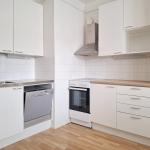 Keittiön varusteina on astianpesukone, liesi ja jääkaappipakastin. Mikrolle on oma paikka yläkaapistossa.