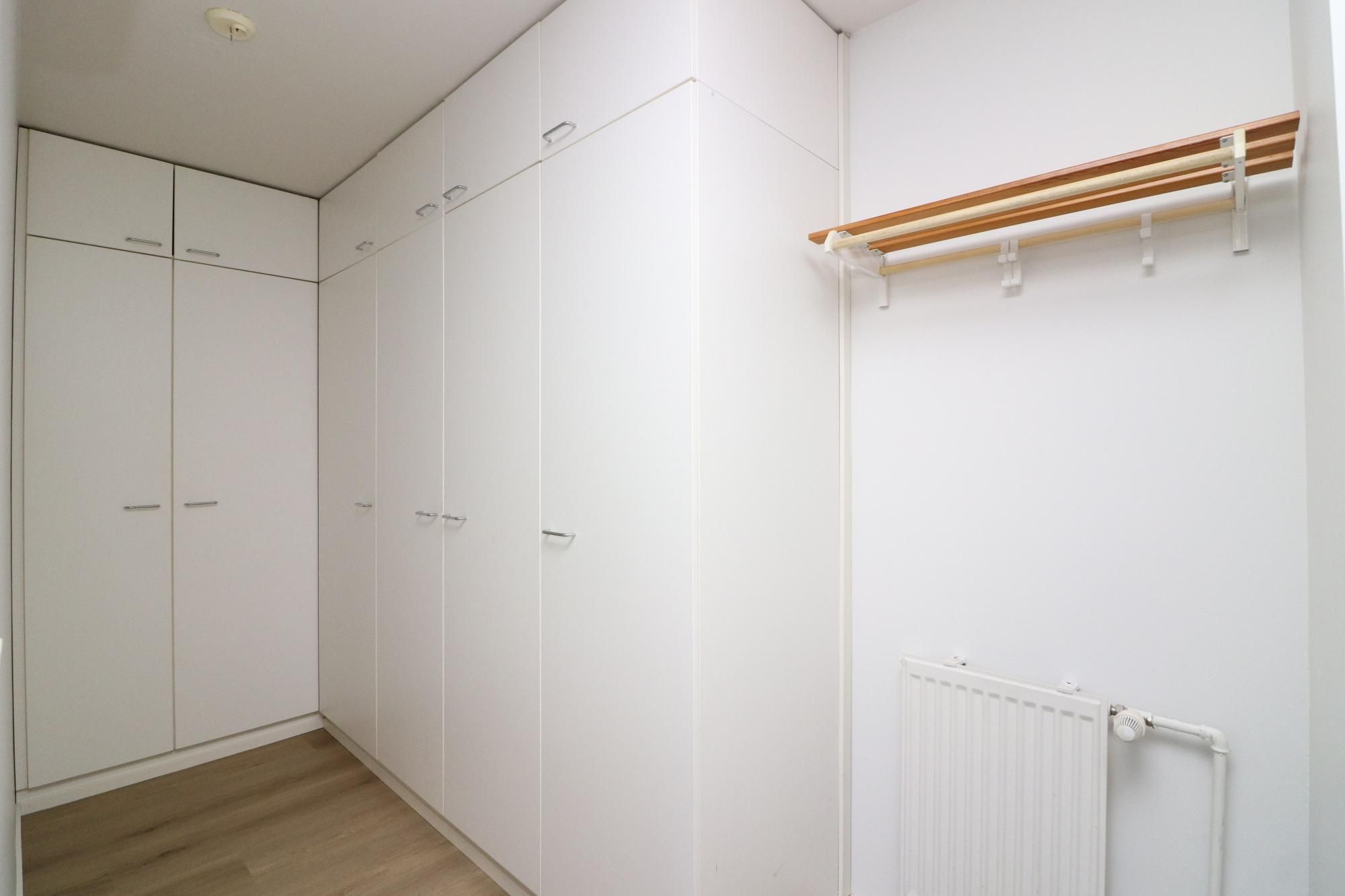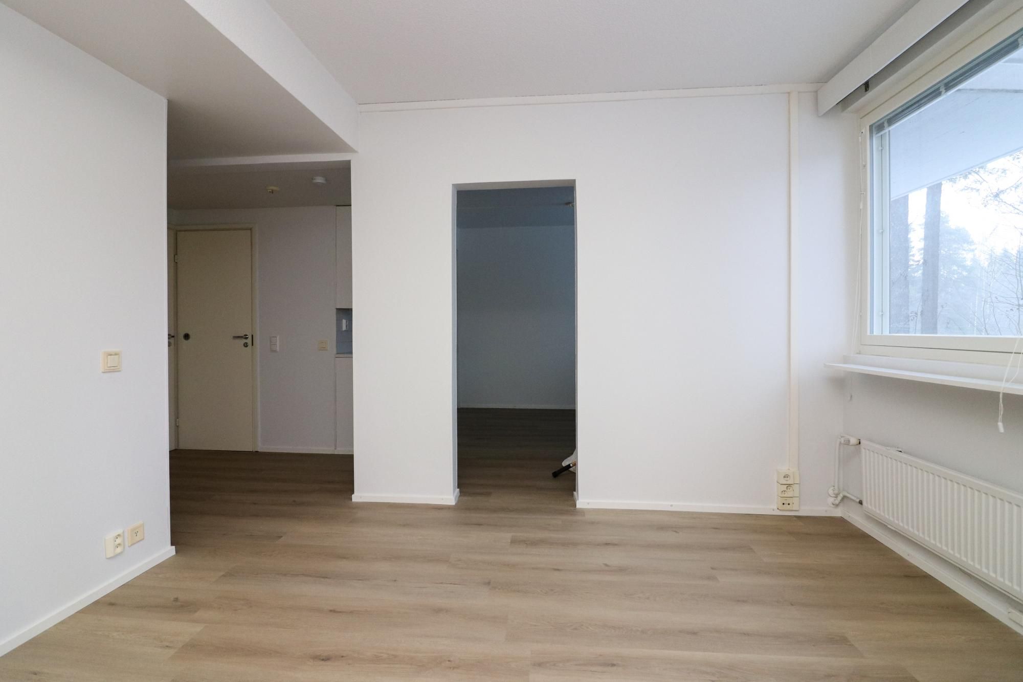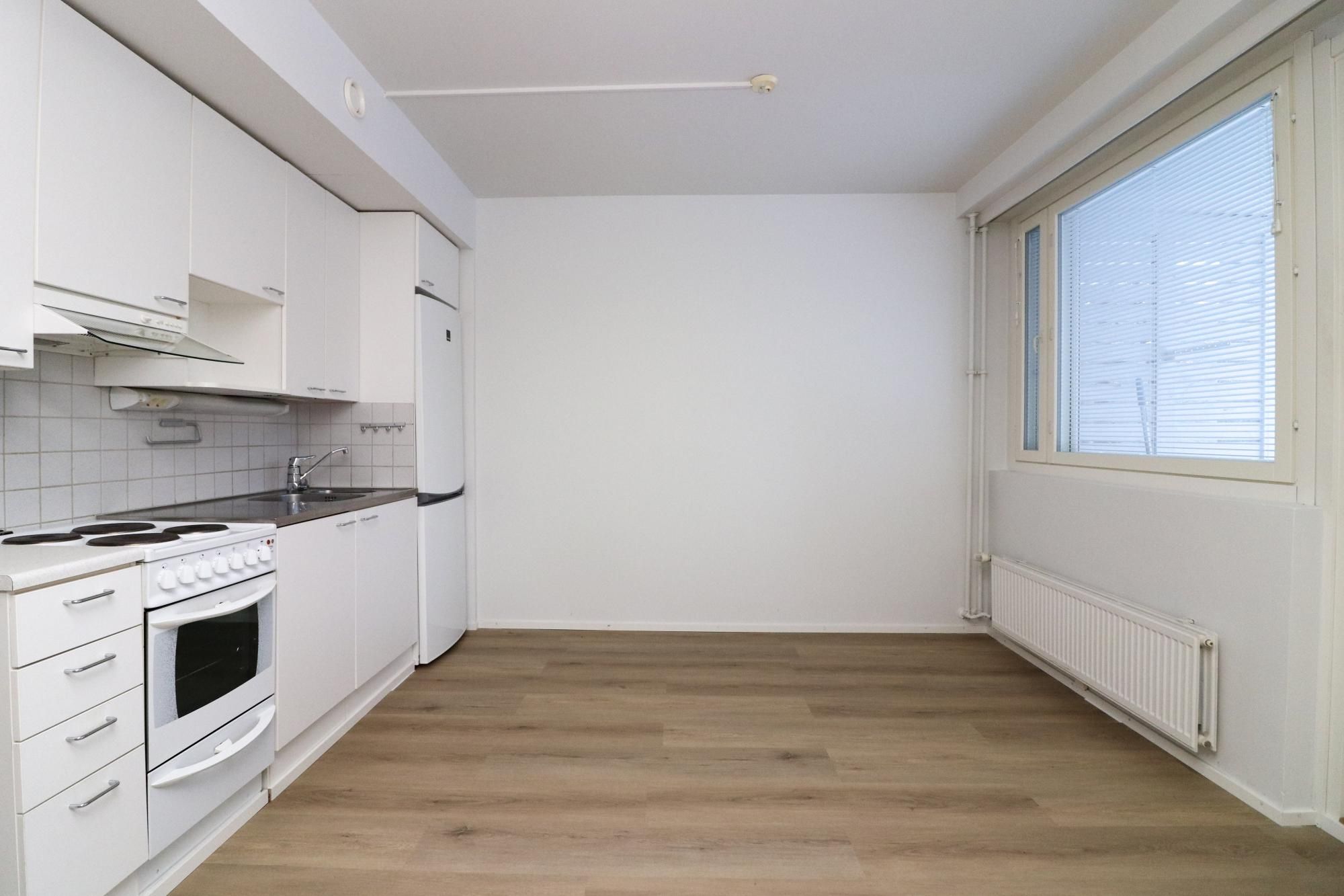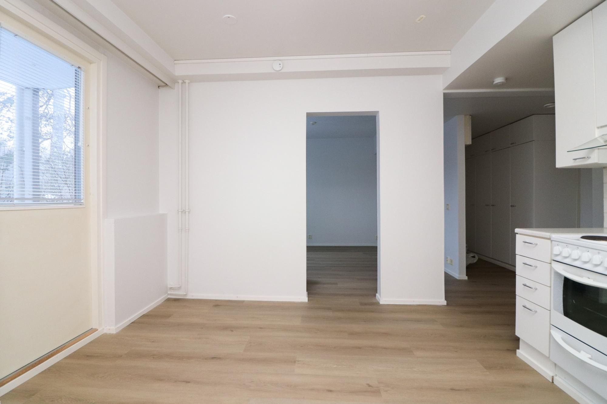 Keittiön varusteluun kuuluu vaaleat kaapistot, uuni, liesi, liesituuletin sekä jääkaappipakastin. Keittiöstä on käynti omalle terassille. Asunnosta löytyy erittäin hyvin säilytystilaa kaapistoina. Tilavassa kylpyhuoneessa myös liitäntä pyykinpesukoneelle. Asunto kuvattu 01/2026.