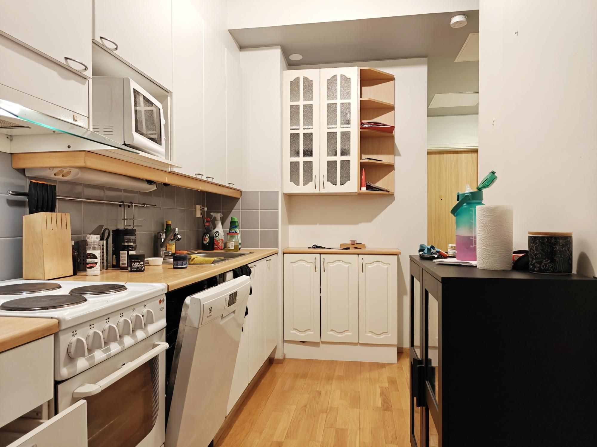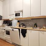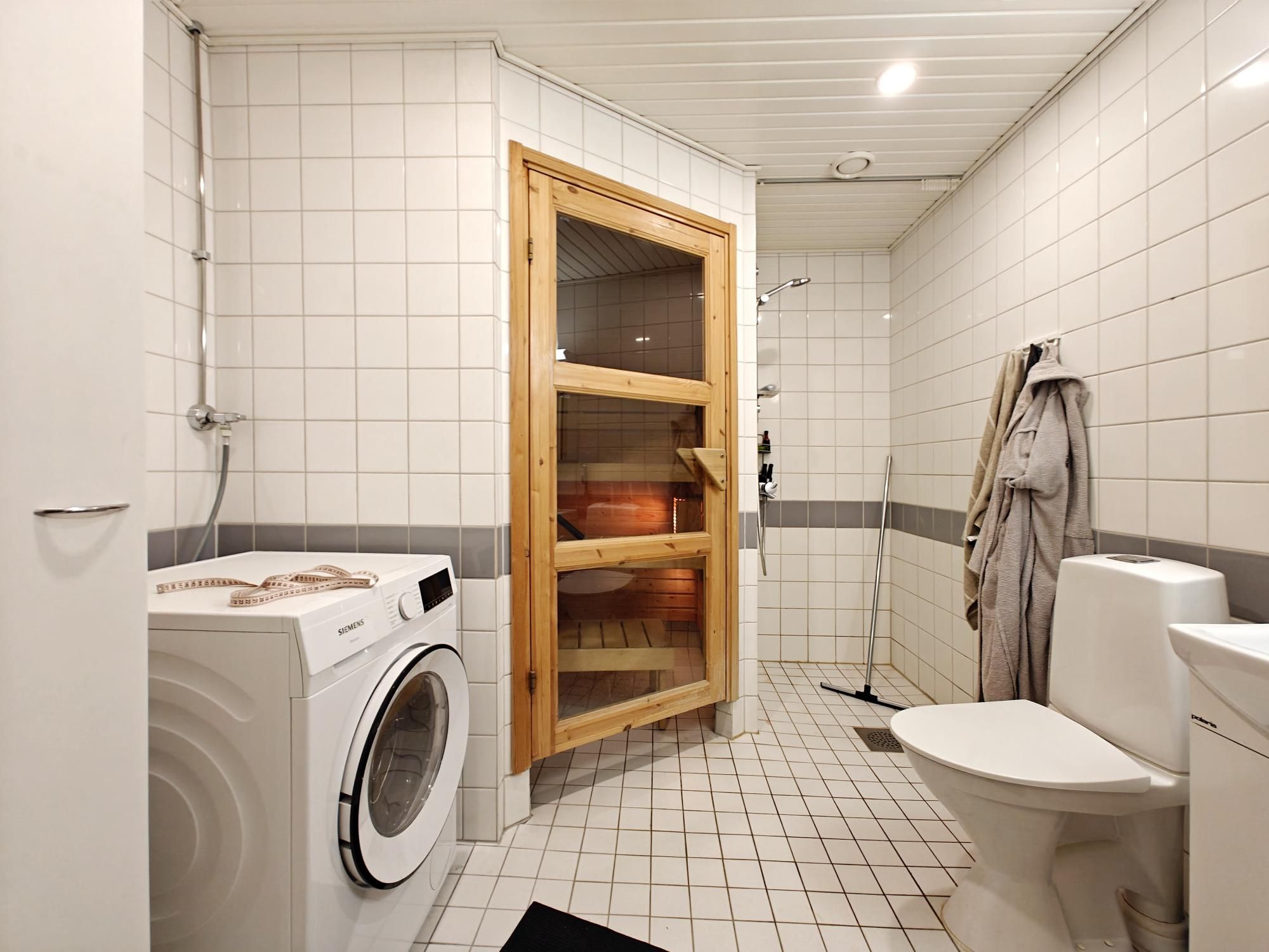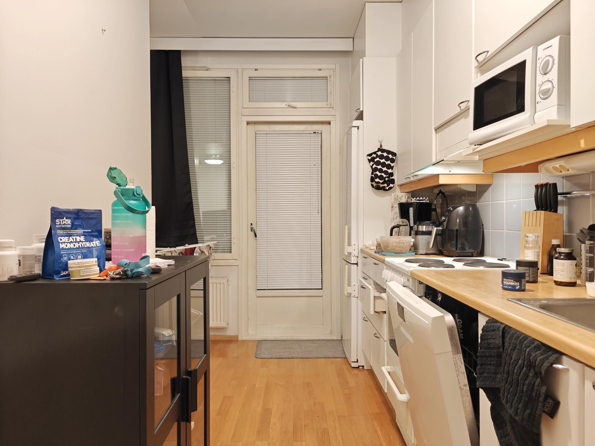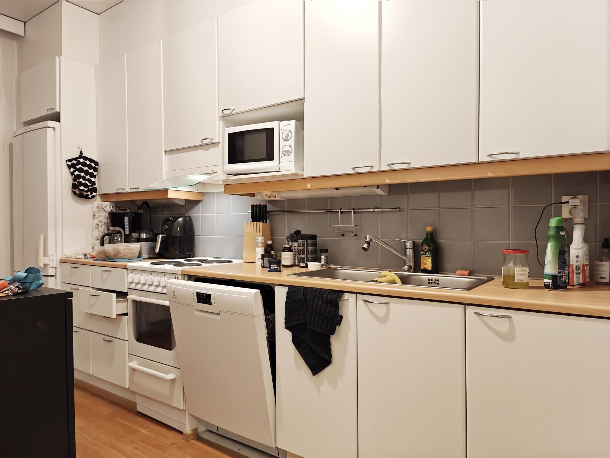 Keittiössä paljon kaappi- sekä laskutilaa ja astianpesukone vuokralaisen käytettävissä. Tilavassa kylpyhuoneessa tila sekä liitäntä isommallekin pyykinpesukoneelle ja vaikka pesutornille.