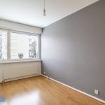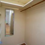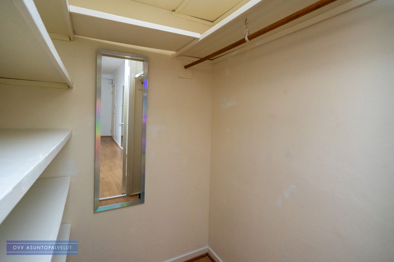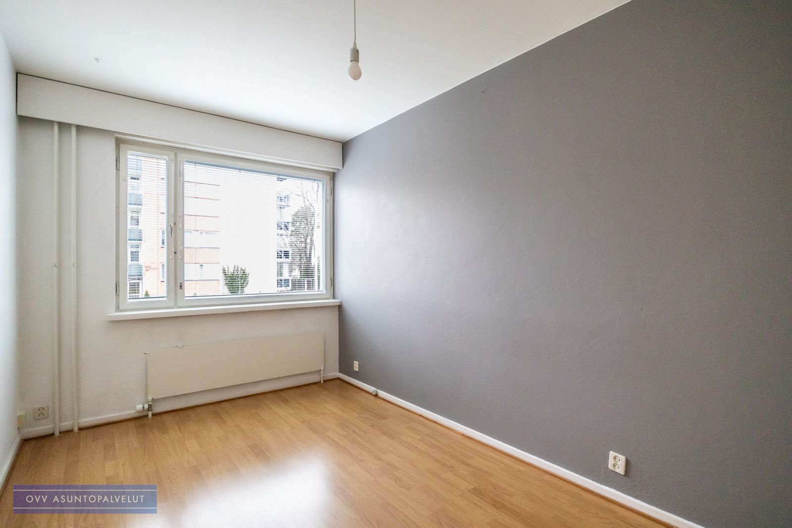 Makuuhuoneessa on kiinteitä kaapistoja ja ikkunanäkymä myös Urheilukadun suuntaan. Eteisestä käynti tilavaan vaatehuoneeseen.