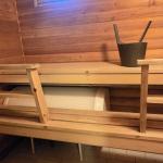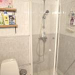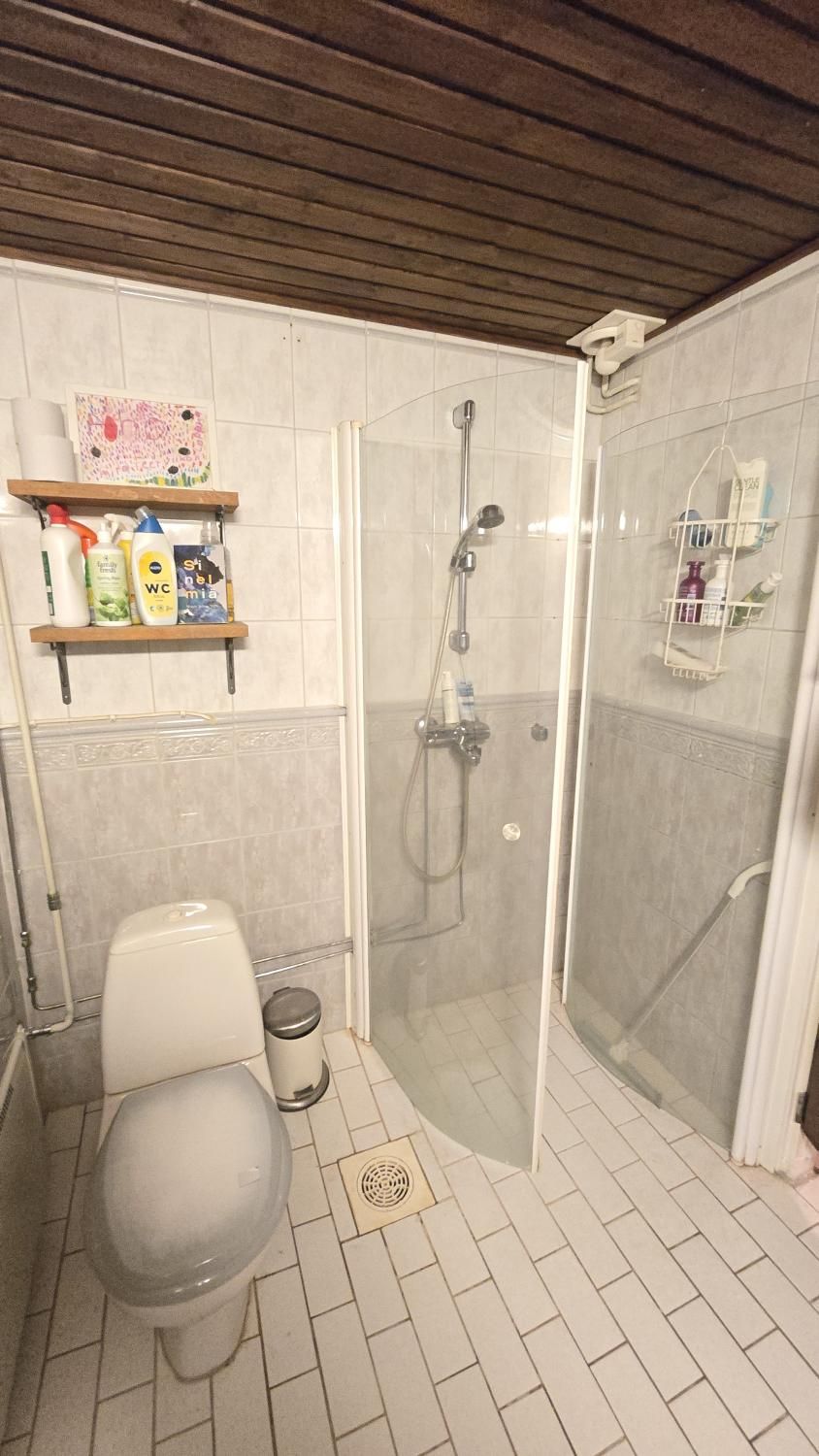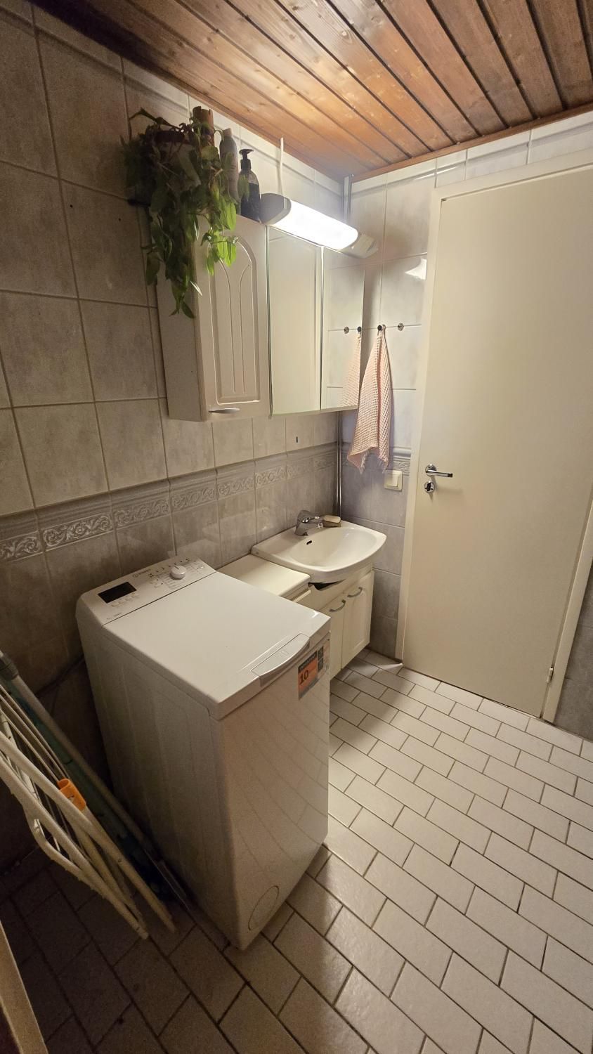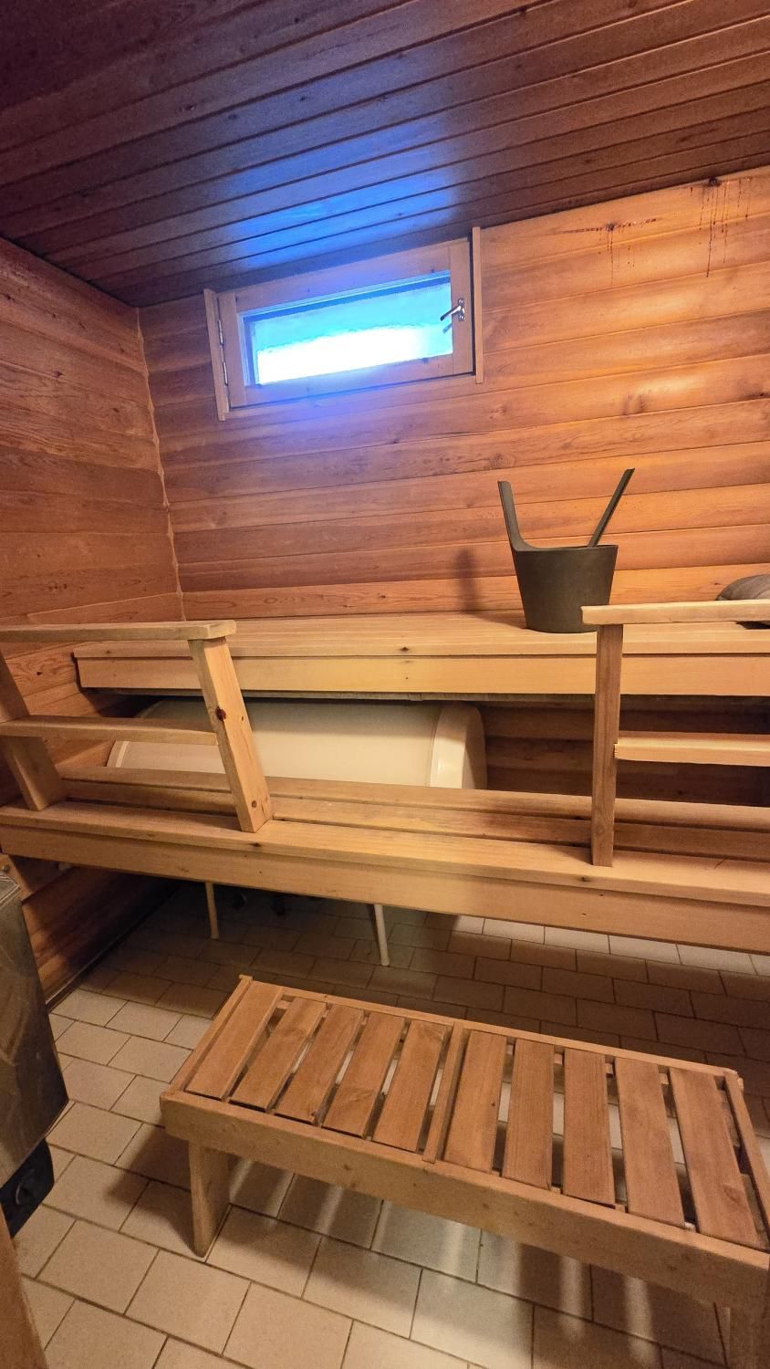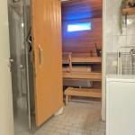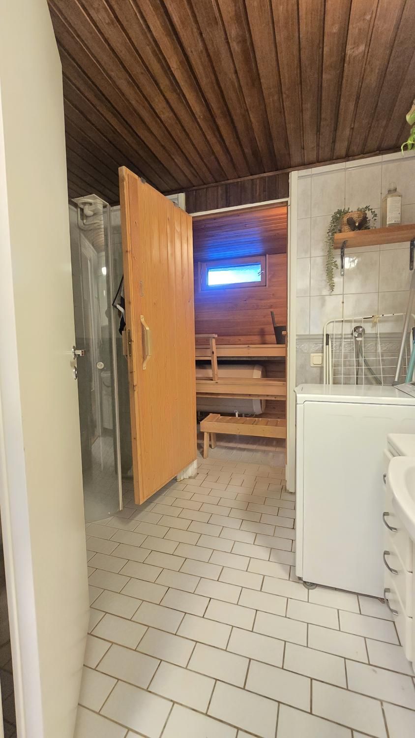 Kylpyhuoneessa paikka pyykinpesukoneelle. Saunassa sähkökiuas.