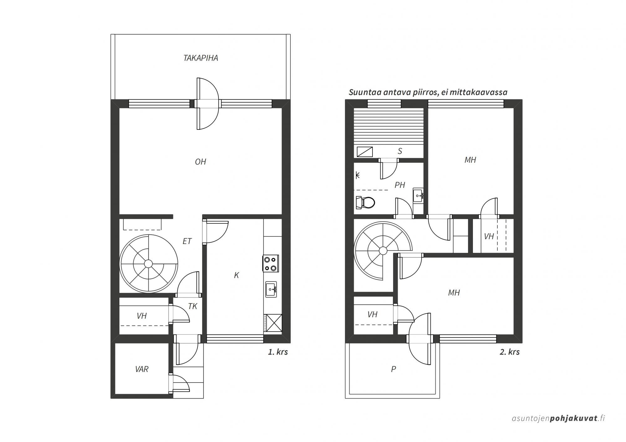 Yläkerrassa kaksi makuuhuonetta, joissa molemmissa tilava vaatehuone, kylpyhuone, sauna ja parveke. Yläkerta remontoitu 2019.
