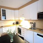 Keittiössä jää/pakastinkaappi, keraaminen liesi, liesituuletin ja astianpesukone.