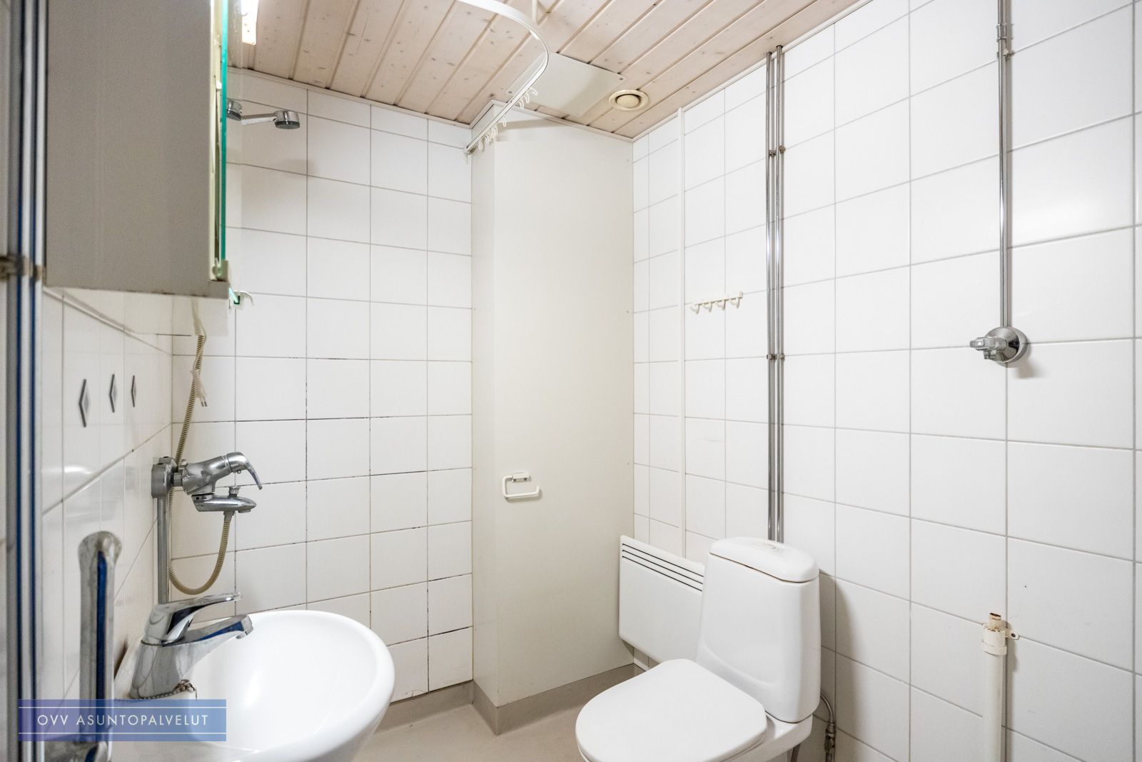 Kylpyhuoneesta löytyy paikka ja liitännät pyykinpesukoneelle. Taloyhtiön kylpyhuoneet uusittu 2000-luvulla nykyaikaisiksi.