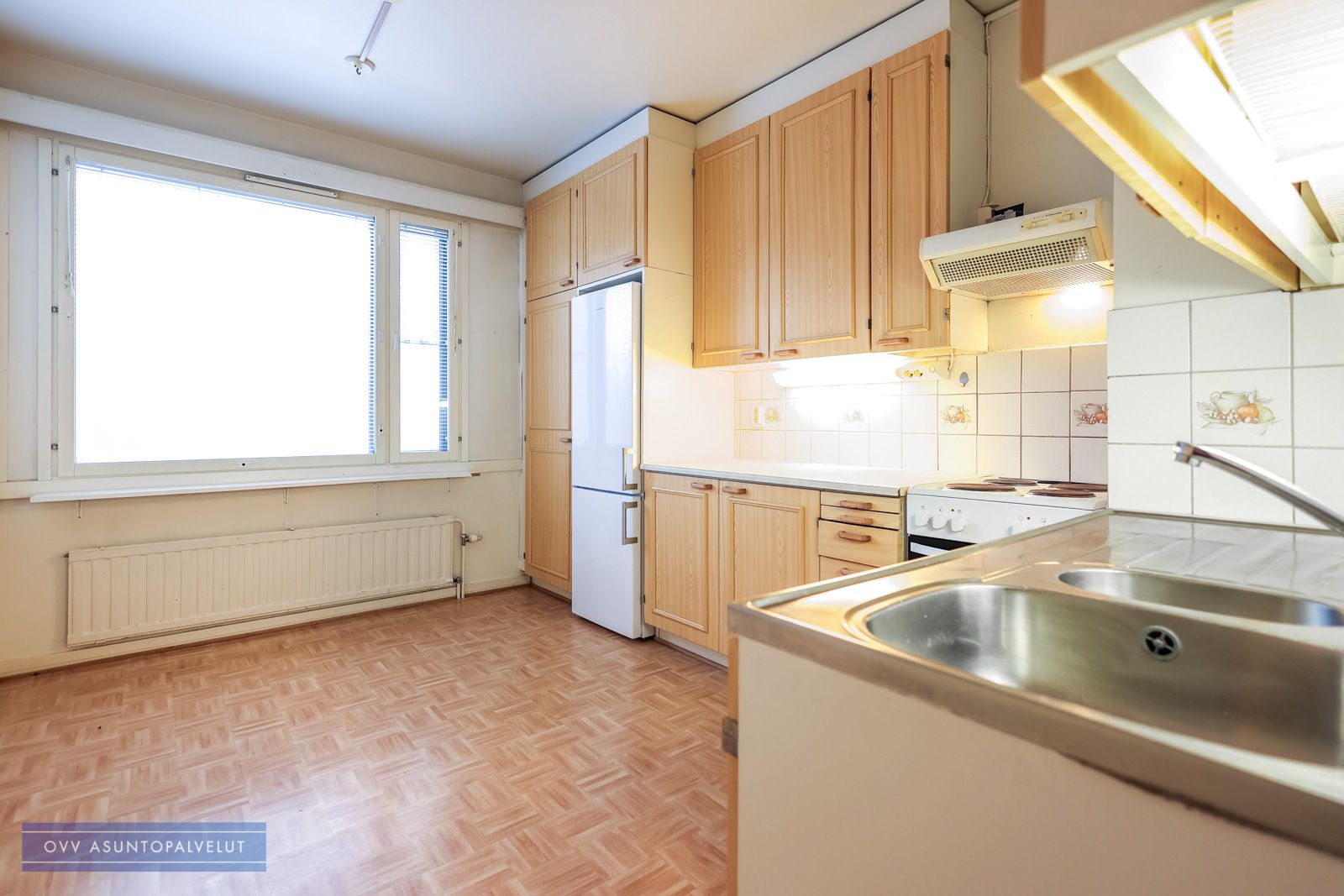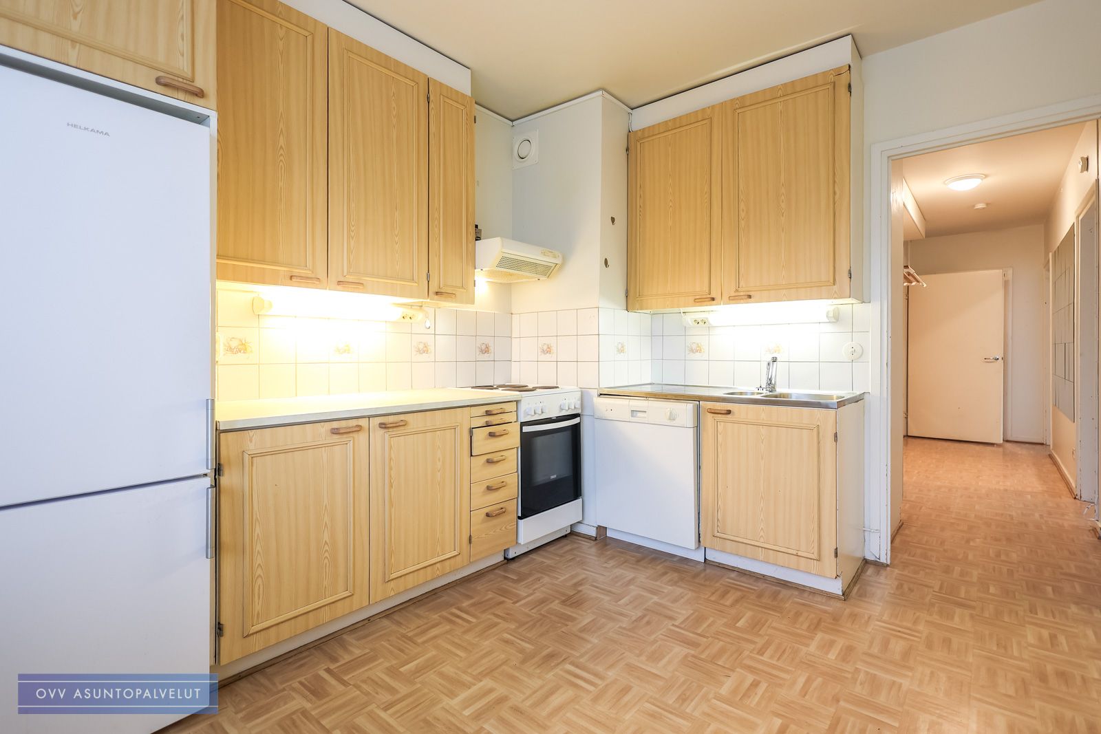 Suuresta keittiöstä löytyy runsaasti kaappitilaa ja arkea helpottamaan valmiiksi asennettu astianpesukone. Keittiöön mahtuu hyvin isompikin ruokailuryhmä. Olohuoneeseen tulvii valoa kahdesta eri ikkunasta.