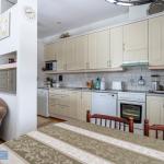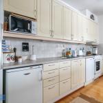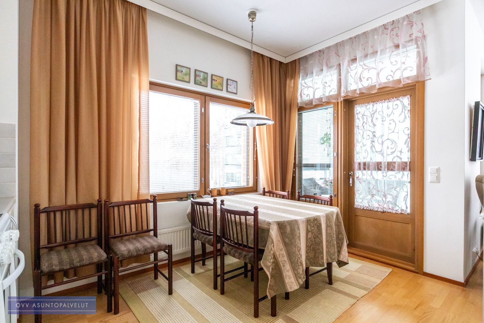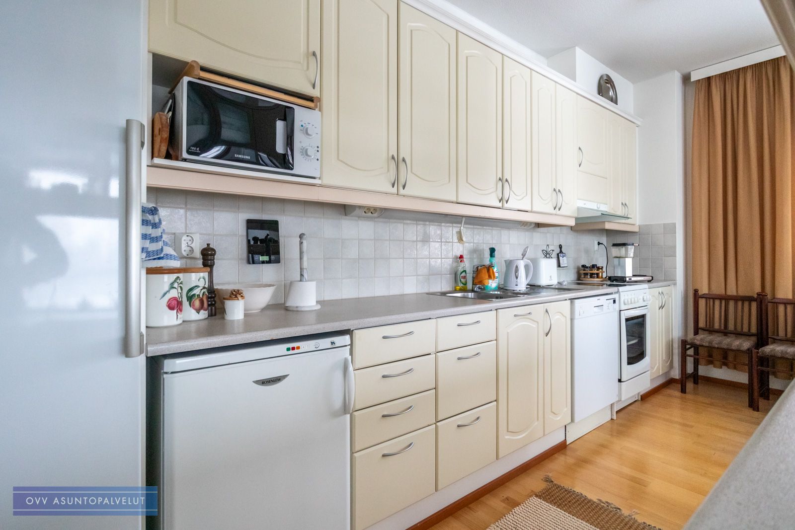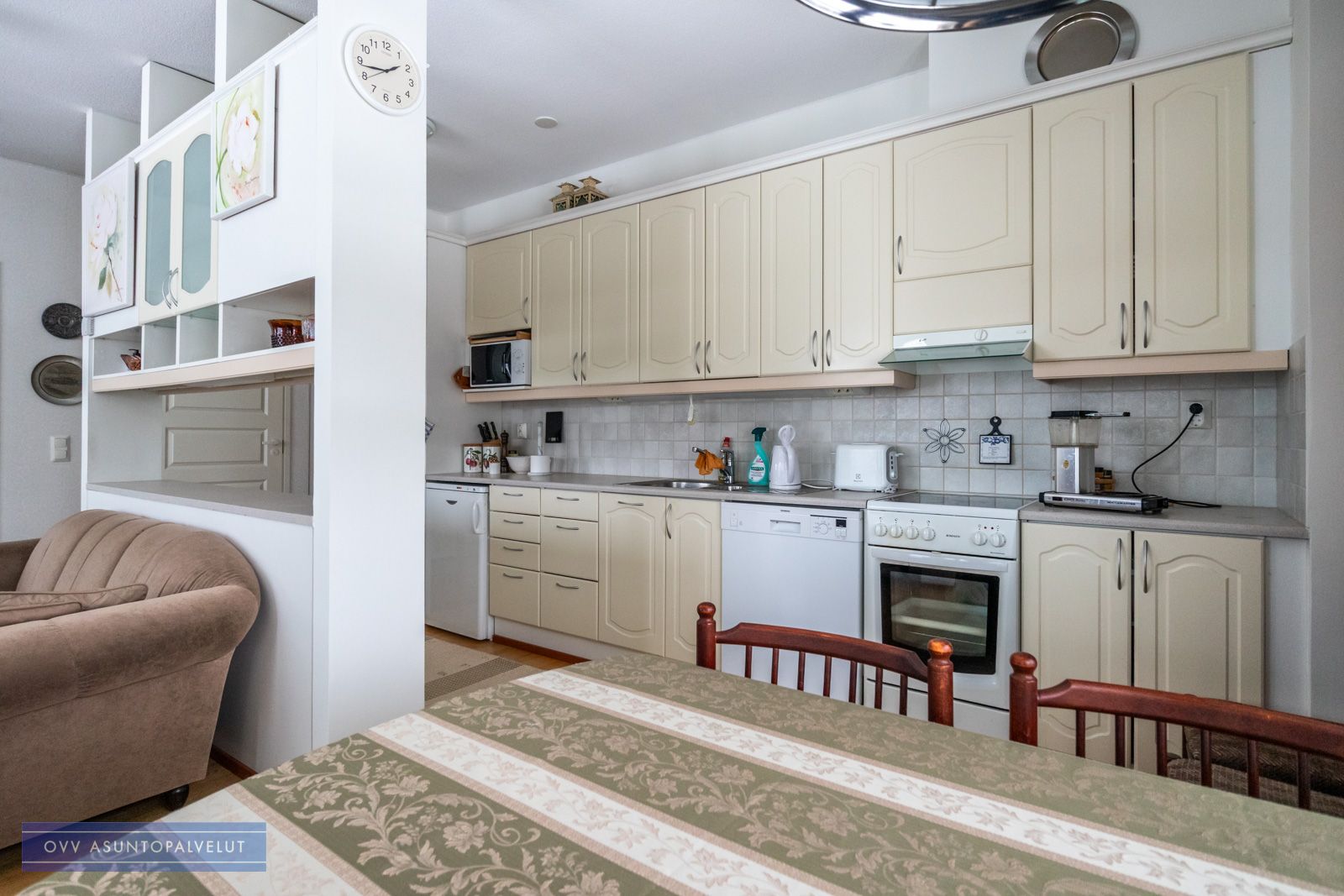 Keittiön yhteydessä ruokailutila, jonka vierestä käynti tilavalle lasitetulle parvekkeelle. Keittiöstä itsestään löytyy reilusti kaappitilaa ja nykyaikaiset kodinkoneet.