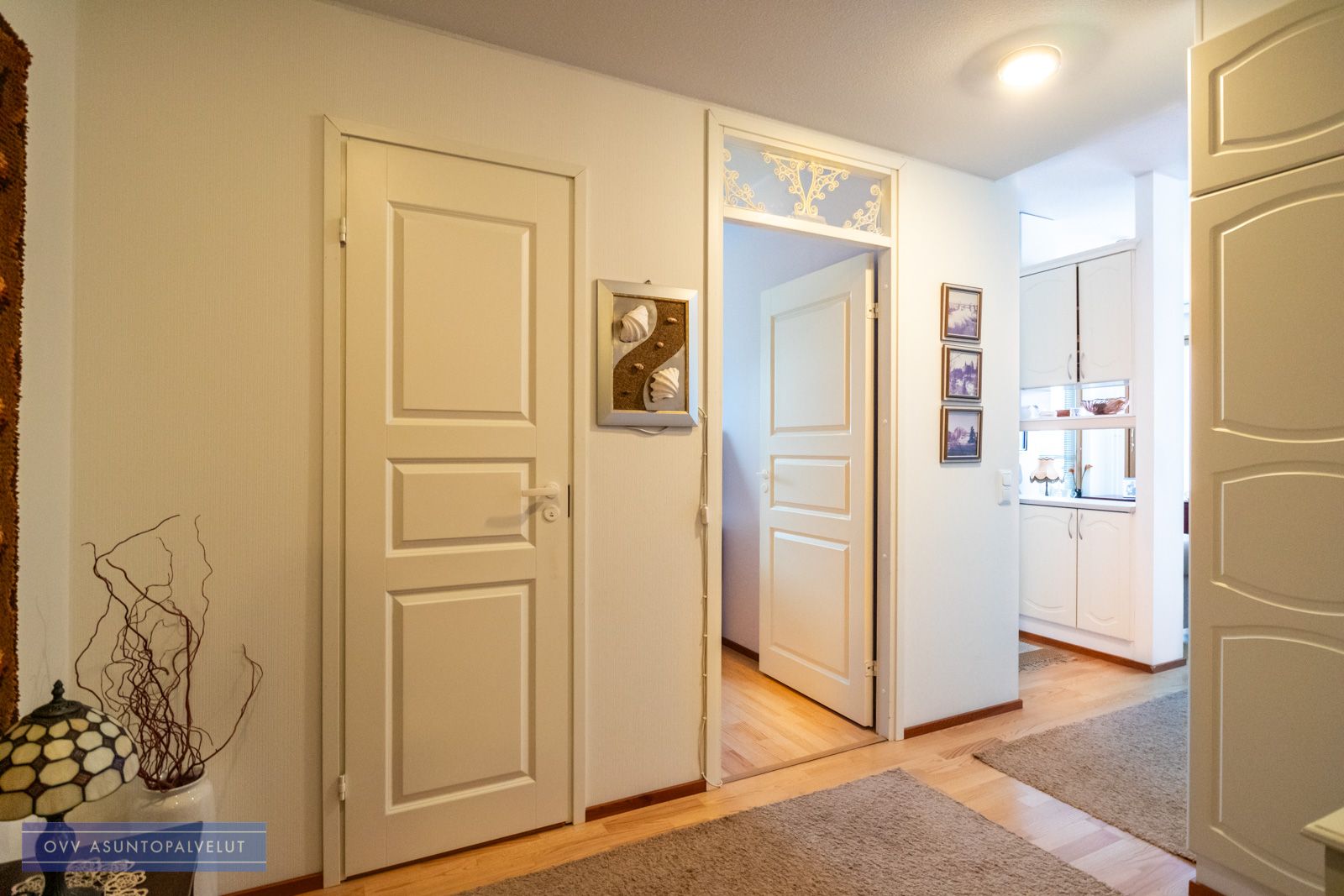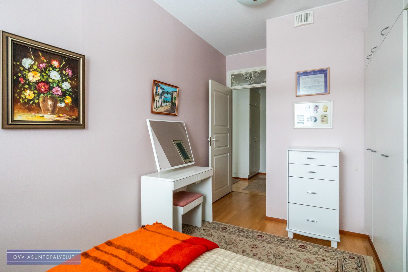 Makuuhuoneessa on paljon kaapistoja, joiden välissä tila parisängylle. Eteisestä löytyy lisää säilytystilaa sekä lisäksi on vielä erillinen vaatehuone.