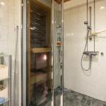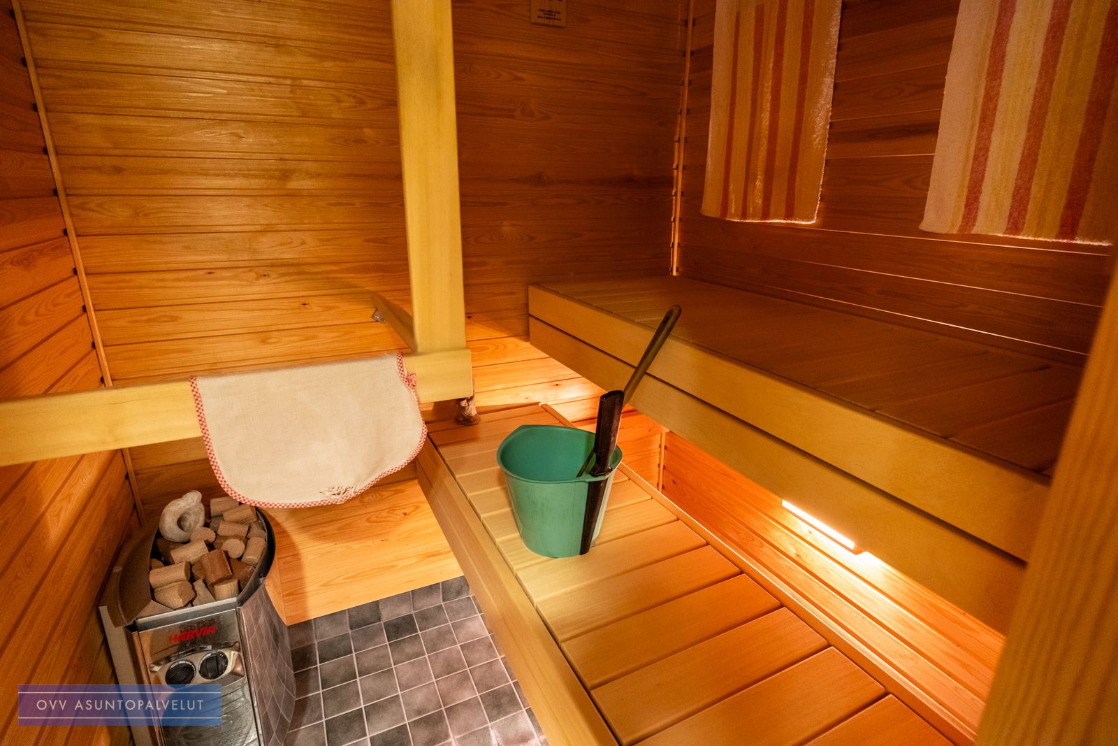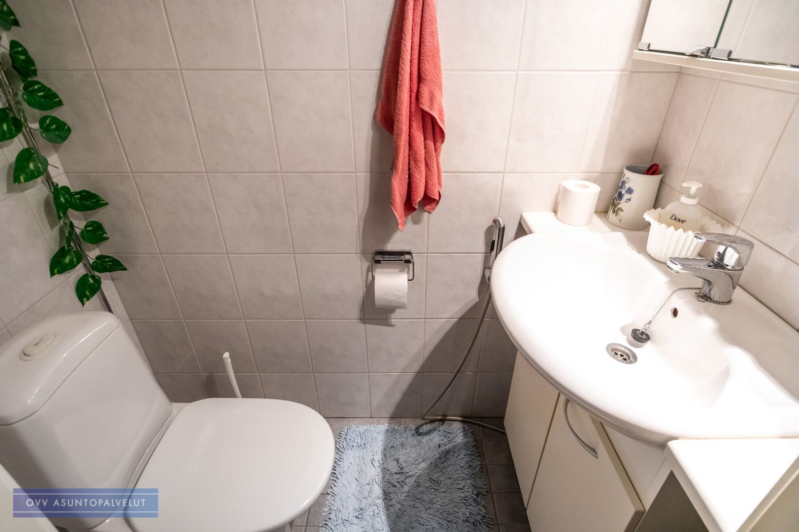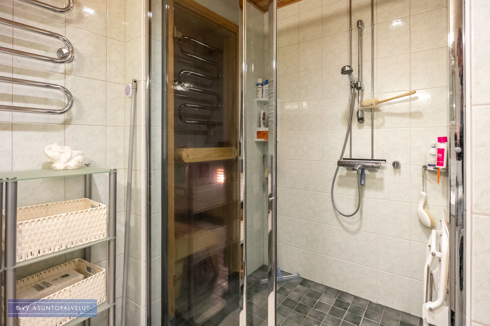 Kylpyhuoneessa on paljon tilaa ja tila on hyvin jaoteltu. Oma saunakin löytyy. Erillinen wc on eteisen yhteydessä makuuhuoneen vieressä.