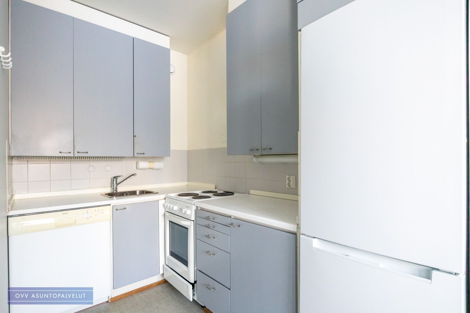 Tässä reilun kokoisessa yksiössä on avara pohjaratkaisu, jossa keittiöön mahtuu hyvin ruokailuryhmä. Keittiössä arkea helpottaa astianpesukone, jonka ansiosta astiat hoituvat vaivatta.