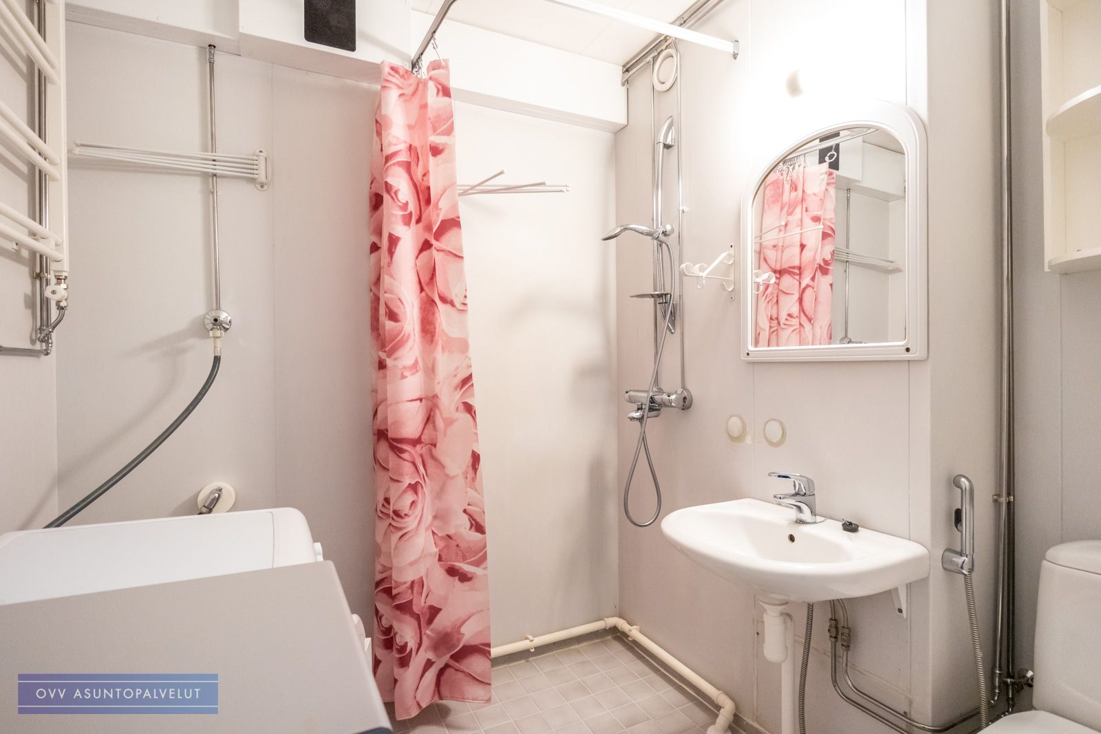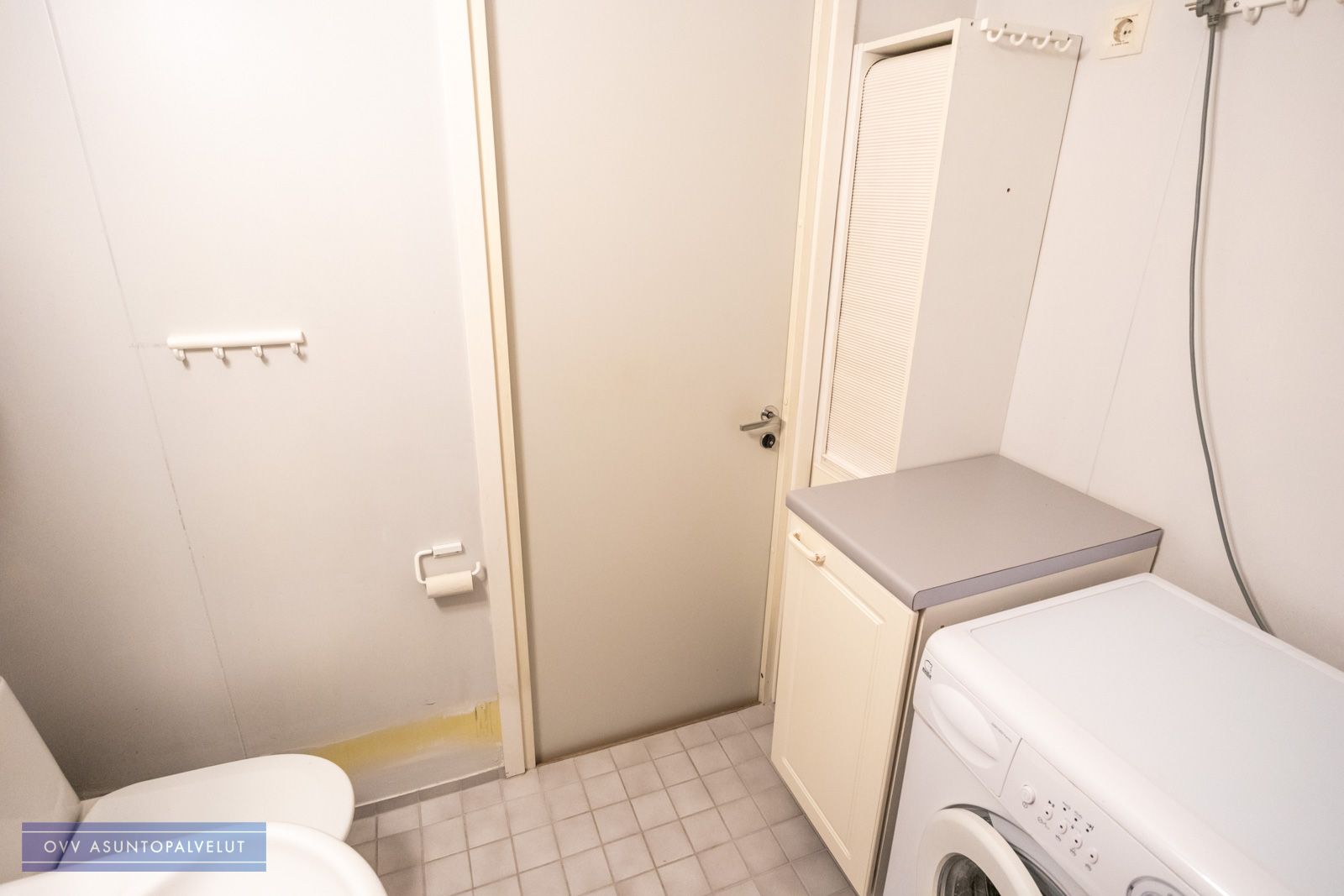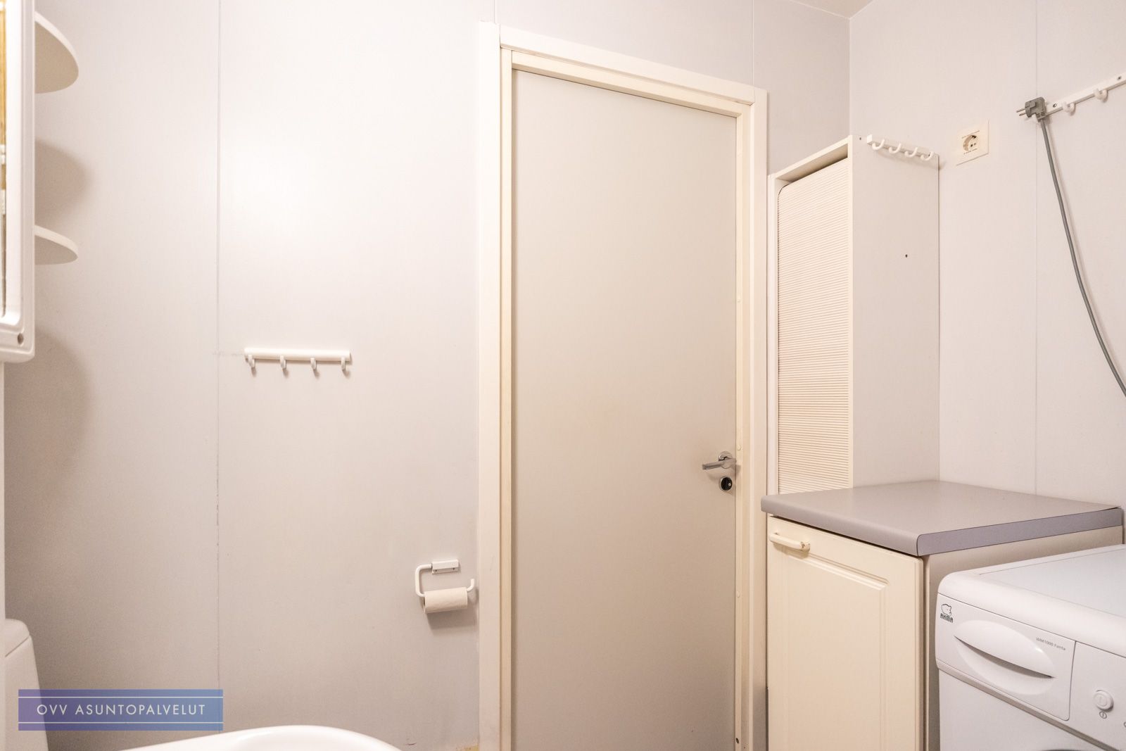 Tilavassa kylpyhuoneessa odottaa käyttöösi valmiiksi asennettu pyykinpesukone sekä reilusti säilytystilaa, mikä helpottaa arkea huomattavasti.