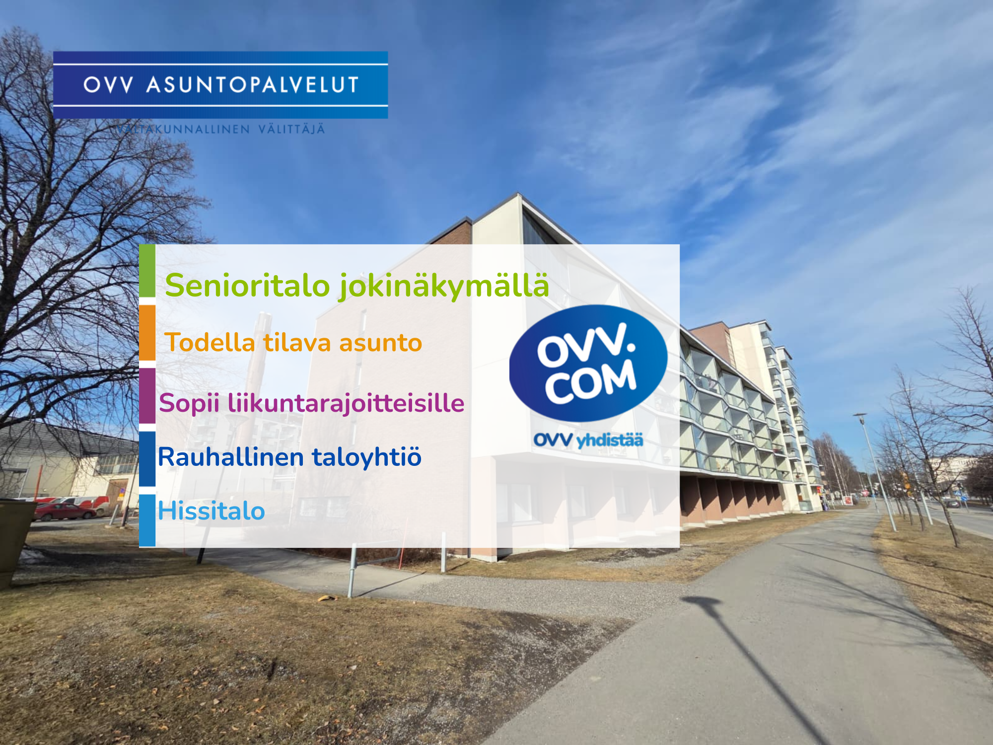 Huoneisto sijaitsee senioritalossa ja asunnon vuokralaisen tulee olla vähintään 58 vuotias.