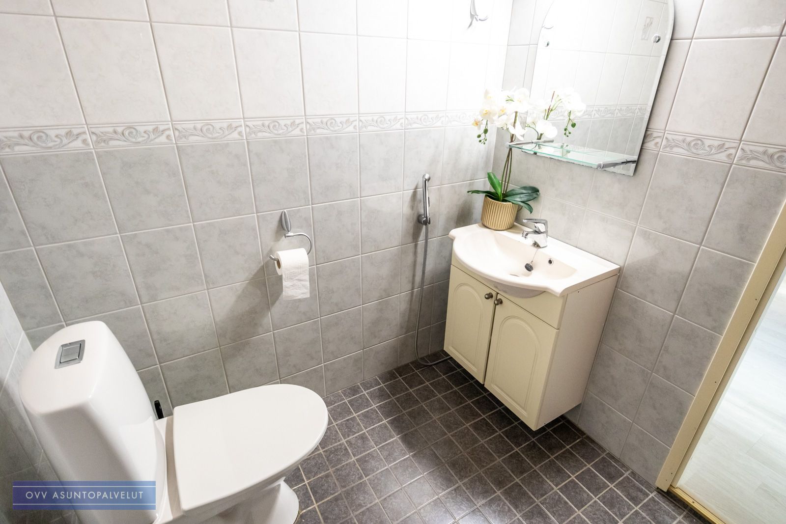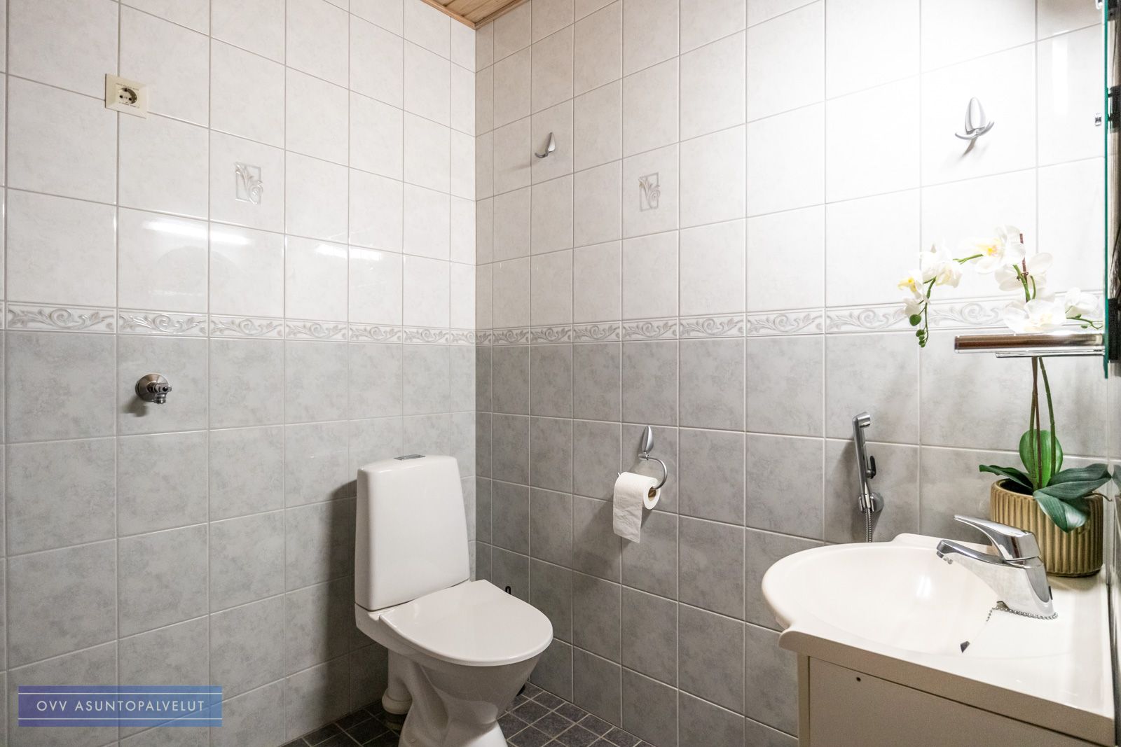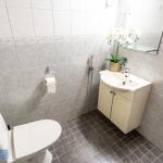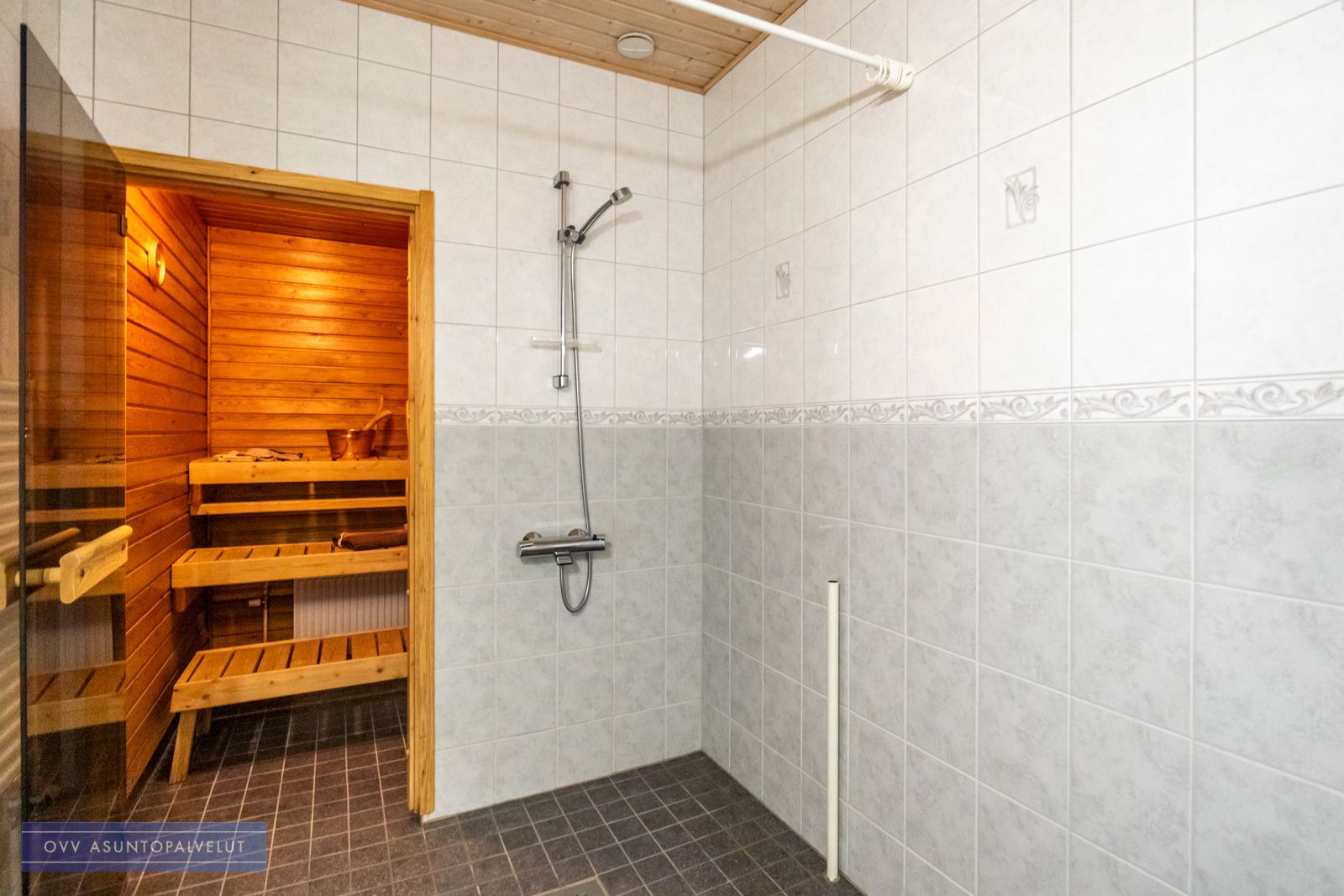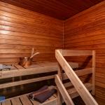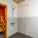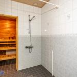 Kylpyhuoneesta löytyy oma sauna riittävästi tilaa muutoinkin. Luonnollisesti myös paikka ja liitäntä pyykinpesukoneelle.