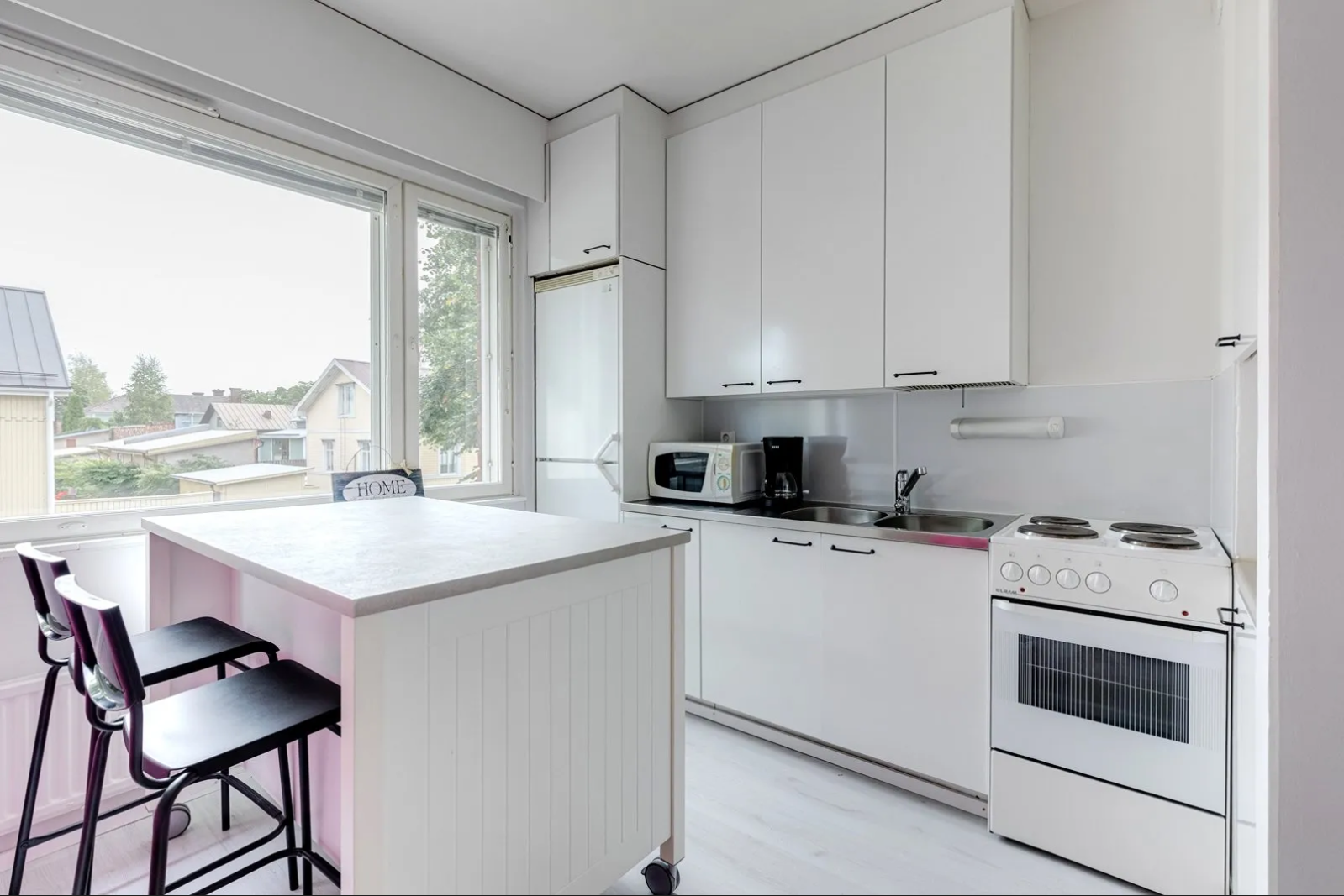 Tarjolla mukava ja toimiva asunto rauhallisella sijainnilla Porissa. Asunnossa on käytännöllinen pohjaratkaisu, jossa keittiön saareke syvennyksellä tarjoaa luontevan paikan tuoleille. Kuvissa näkyvät mustat baarituolit jäävät vuokralaiselle halutessaan.
