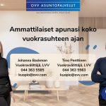 Vuokrasuhteessa noudatetaan myös alalla hyväksyttyä Hyvää Vuokratapaa. Vuokrasopimus toistaiseksi voimassa oleva, mutta mikäli vuokrasuhde kestää alle vuoden, tulee maksettavaksi 1kk:n vuokraa vastaava sopimussakko.