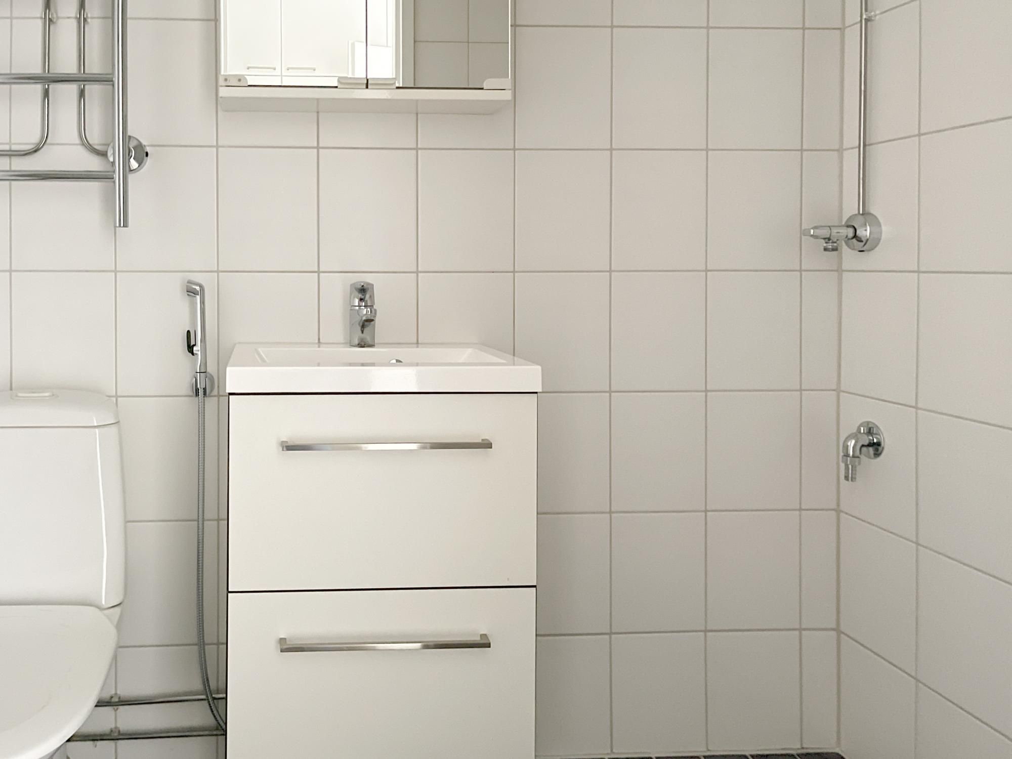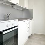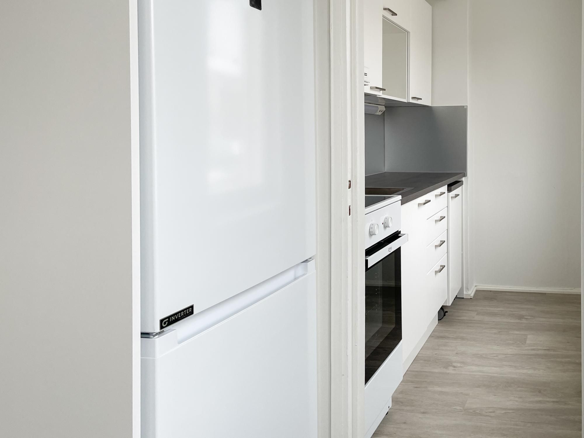 Remontoidussa keittokomerossa paikka kapealle tiskikoneelle ja reilun kokoisessa kylpyhuoneessa pesukoneliitäntä.