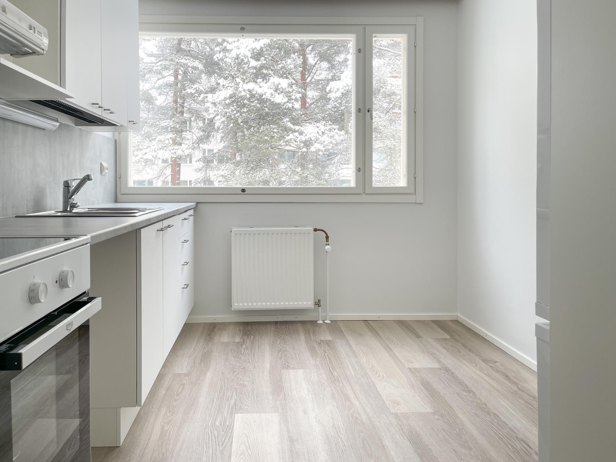 Vehreissä maisemissa ensimmäisen kerroksen valoisa ja siisti koti. Kylpyhuoneessa tila pesukoneelle ja sieltä löytyy ihana, vanhanajan henkeä huokuva istuma-allas. Astianpesukoneelle löytyy myös valmius.