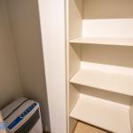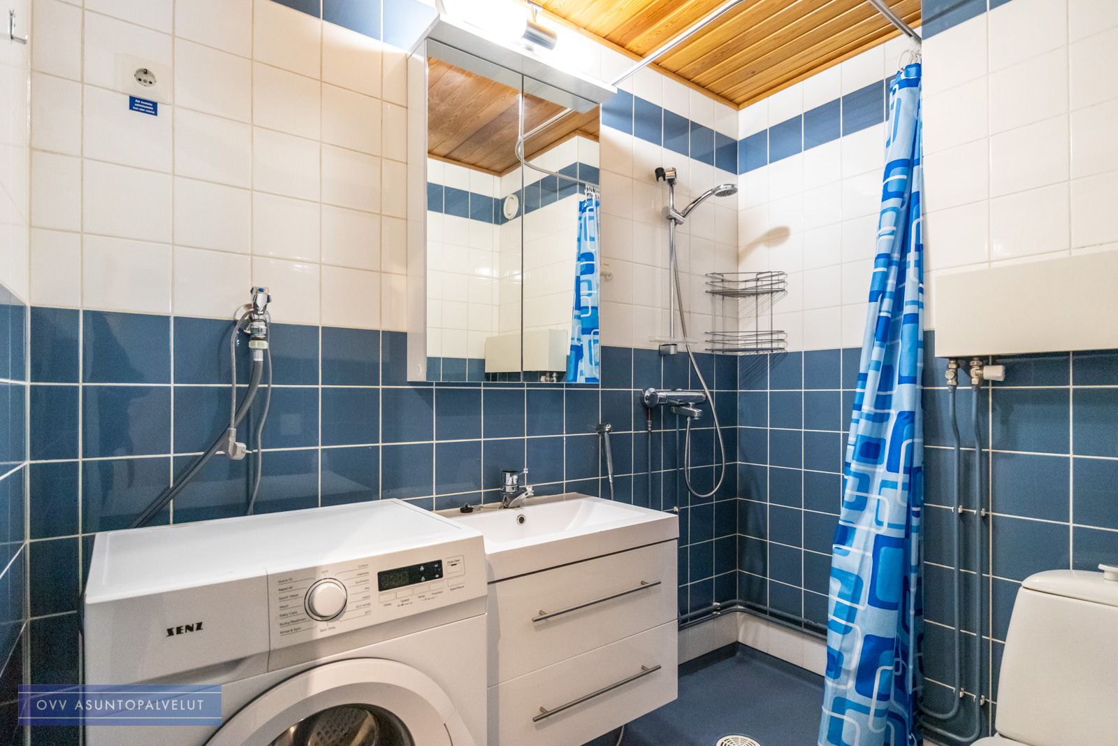 Tilavassa kylpyhuoneessa on paikka ja liitäntä pyykinpesukoneelle ja tällä hetkellä vuokranantaja puolesta pyykinpesukonekin valmiiksi tulevalle vuokralaiselle. Eteisessä myös erillinen vaatehuone ja lisäksi kiinteitä kaapistoja.
