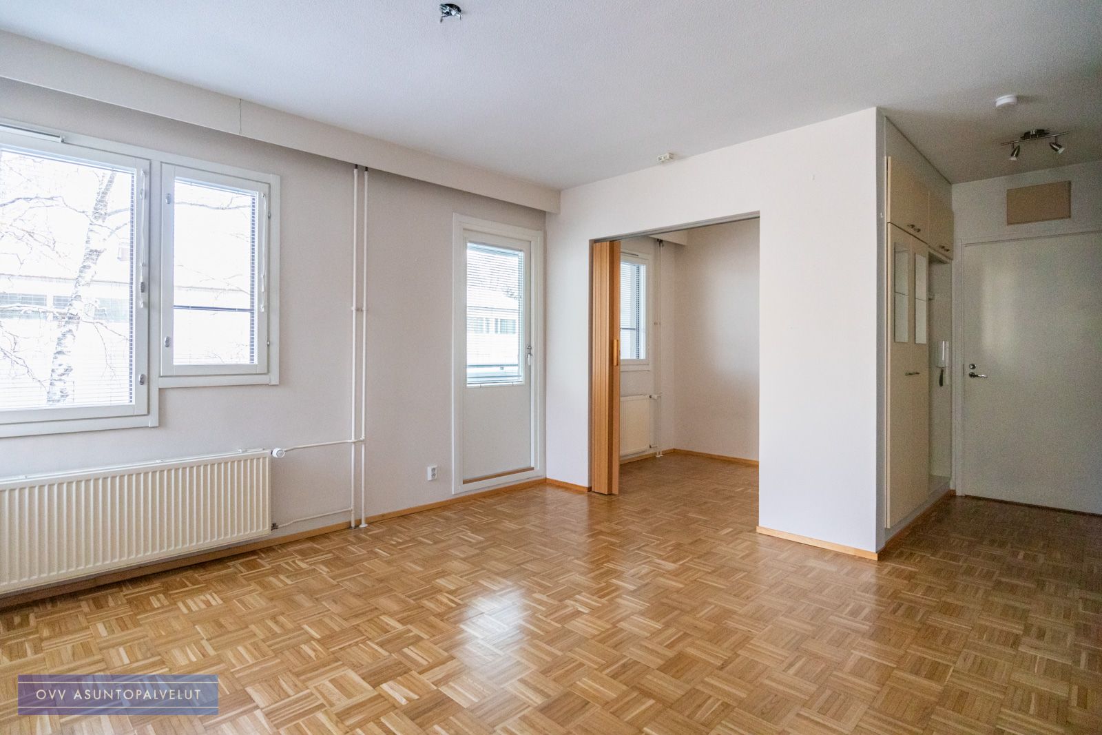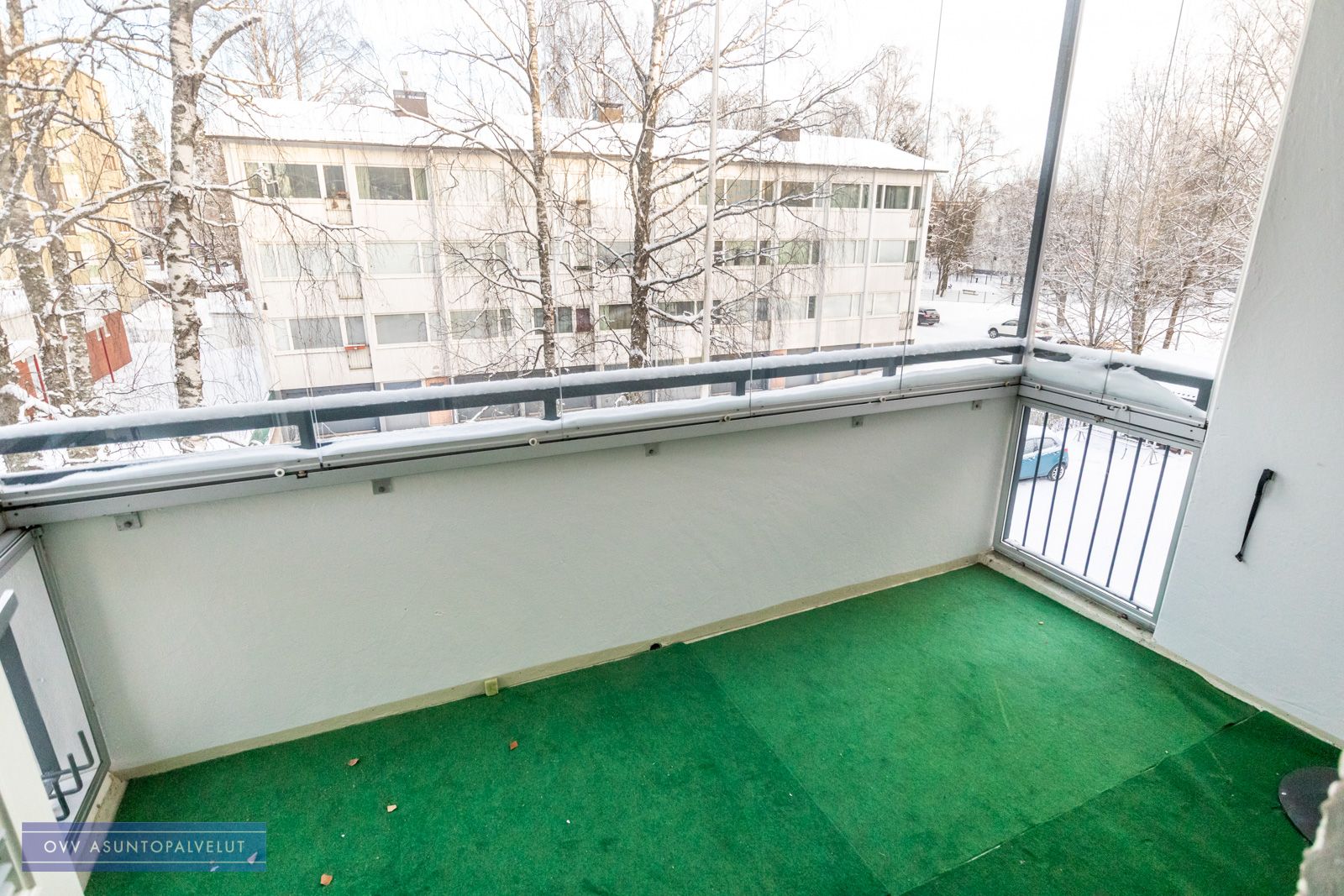Olohuoneesta käynti tilavalle lasitetulle parvekkeelle, josta rauhaisa näkymä. Olohuoneen vieressä makuuhuone.