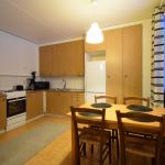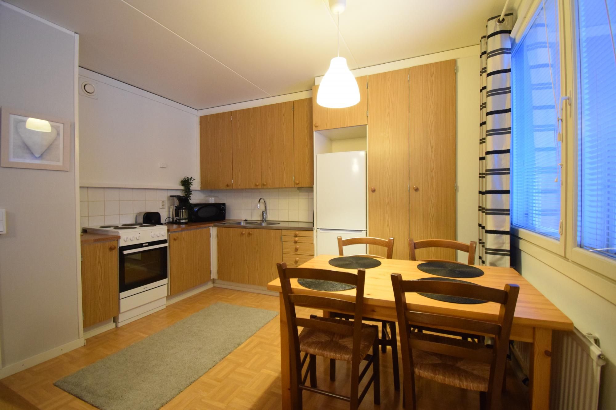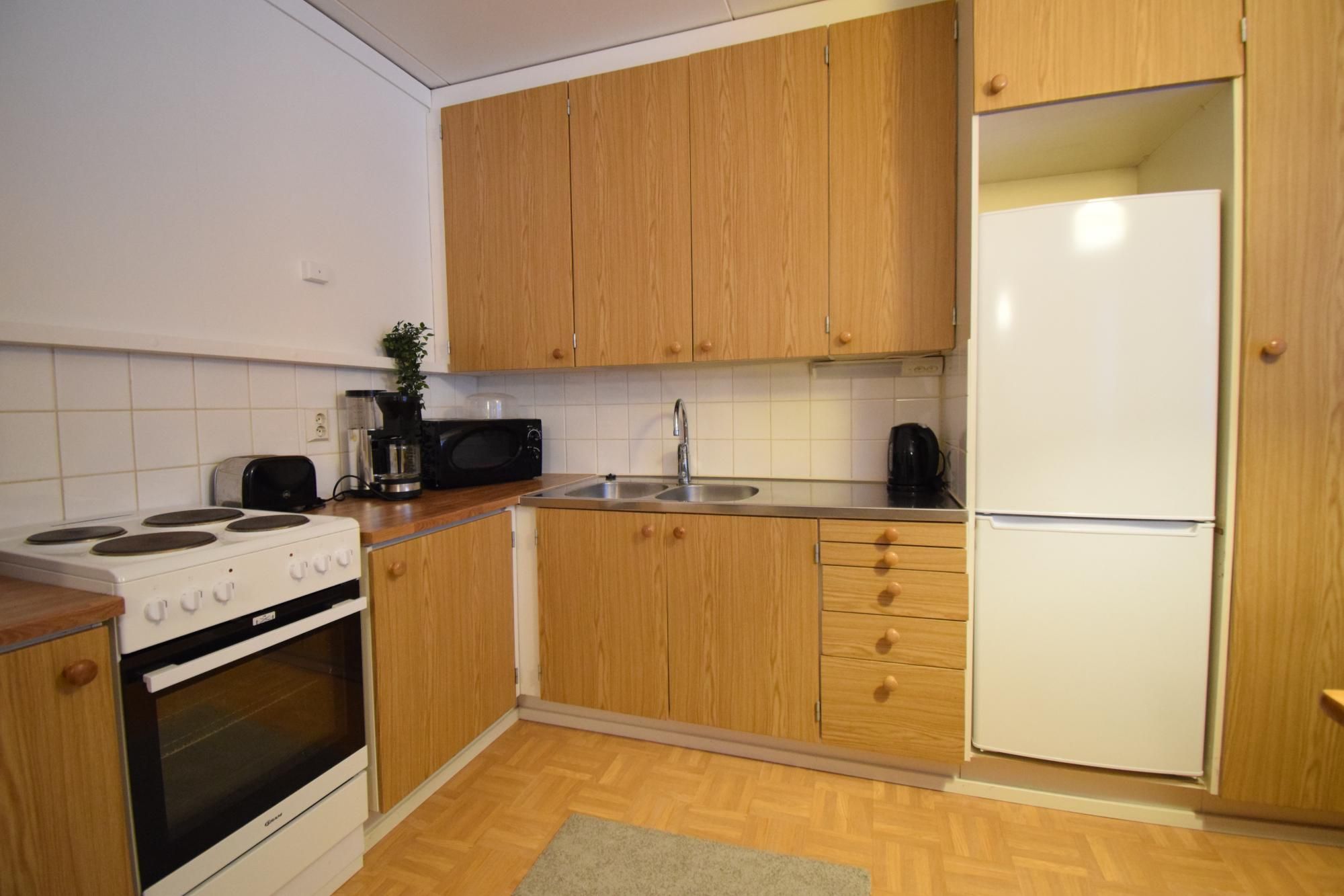 Ikkunoista näkymät talon puistoiselle takapihalle. Tilava keittiö, jossa jääkaappipakastin, liesi ja mikro.