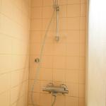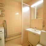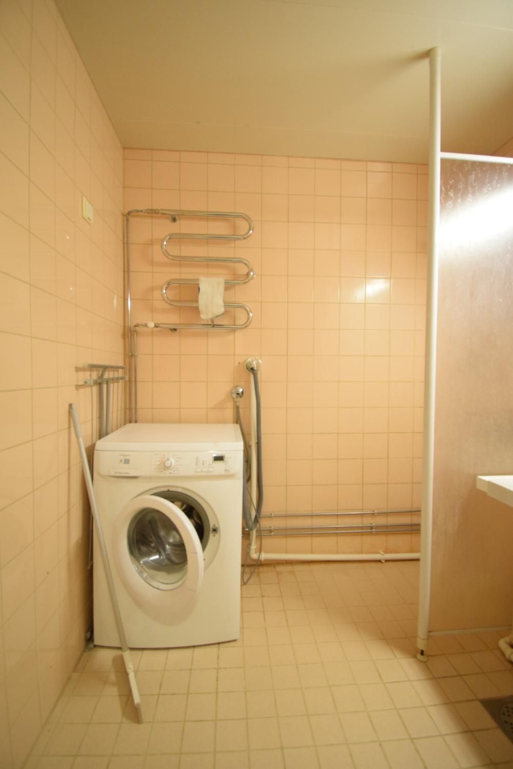 Kaakeloidusta kylpyhuoneesta löytyy allas- ja peilikaapit, suihkuseinä, rättipatteri ja pyykinpesukone.