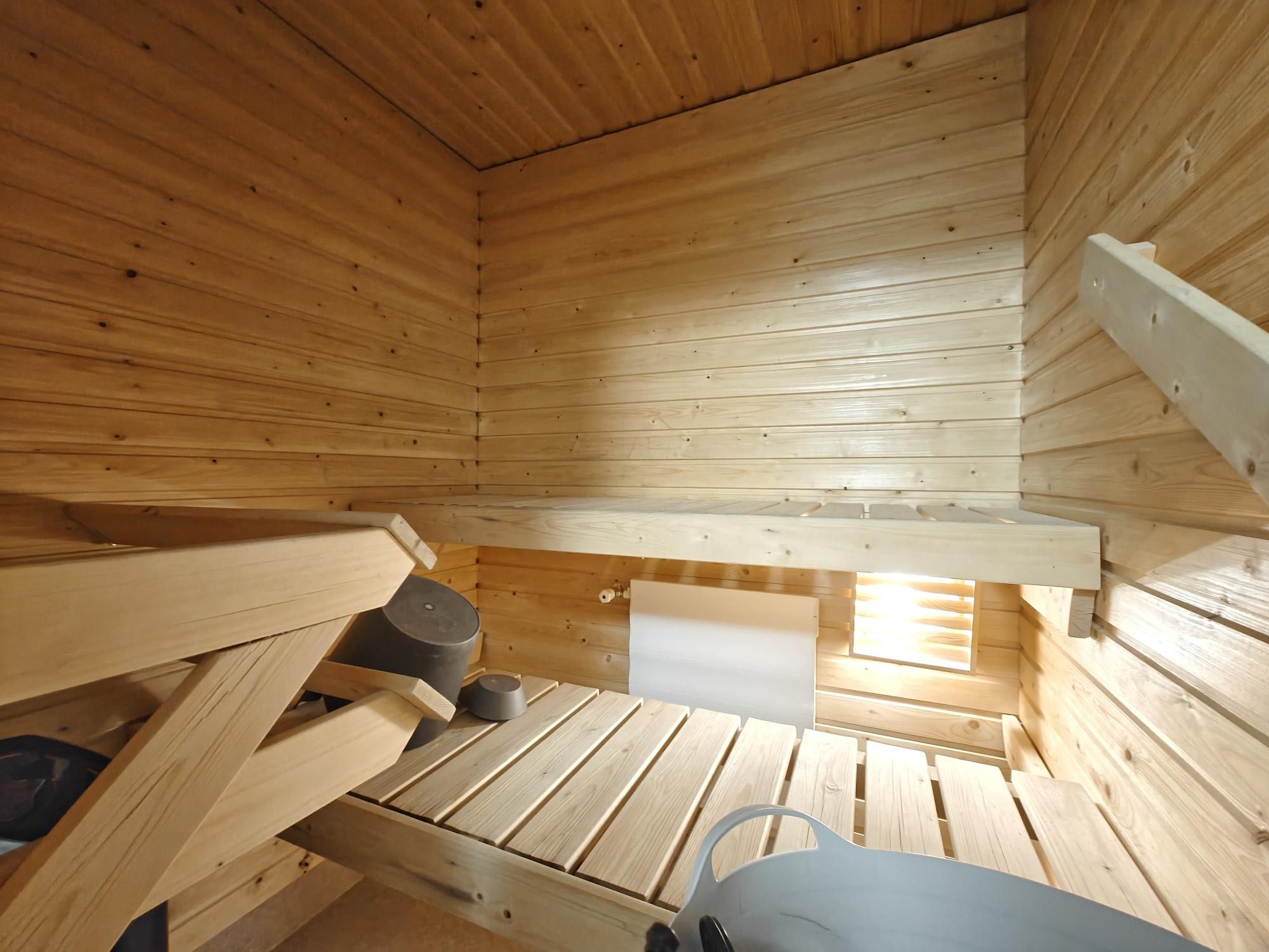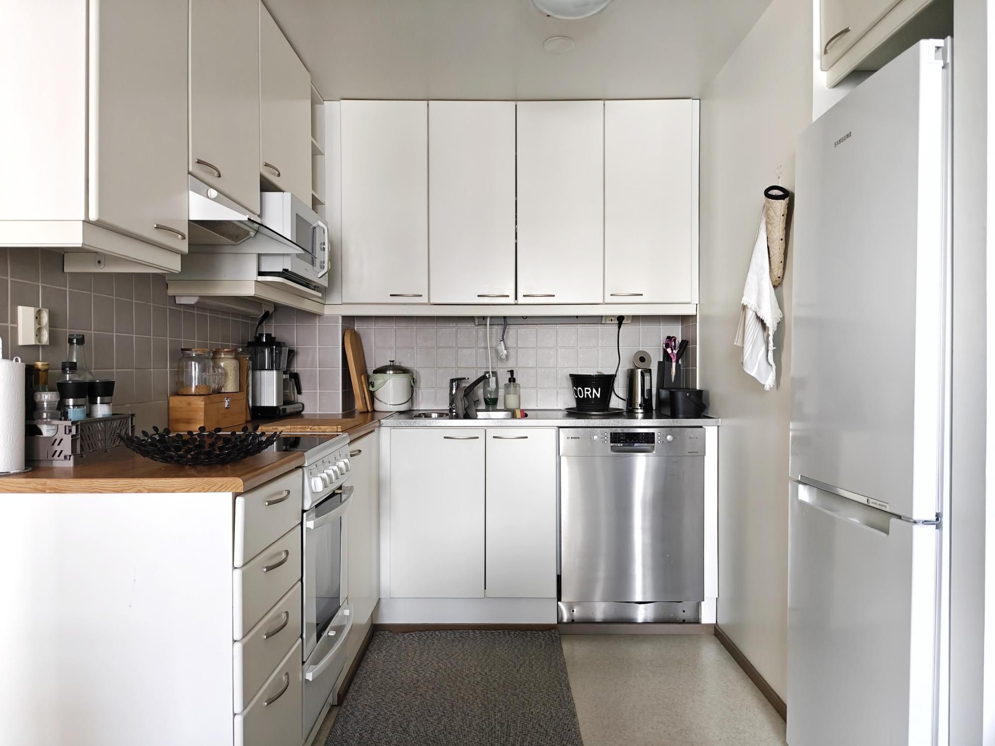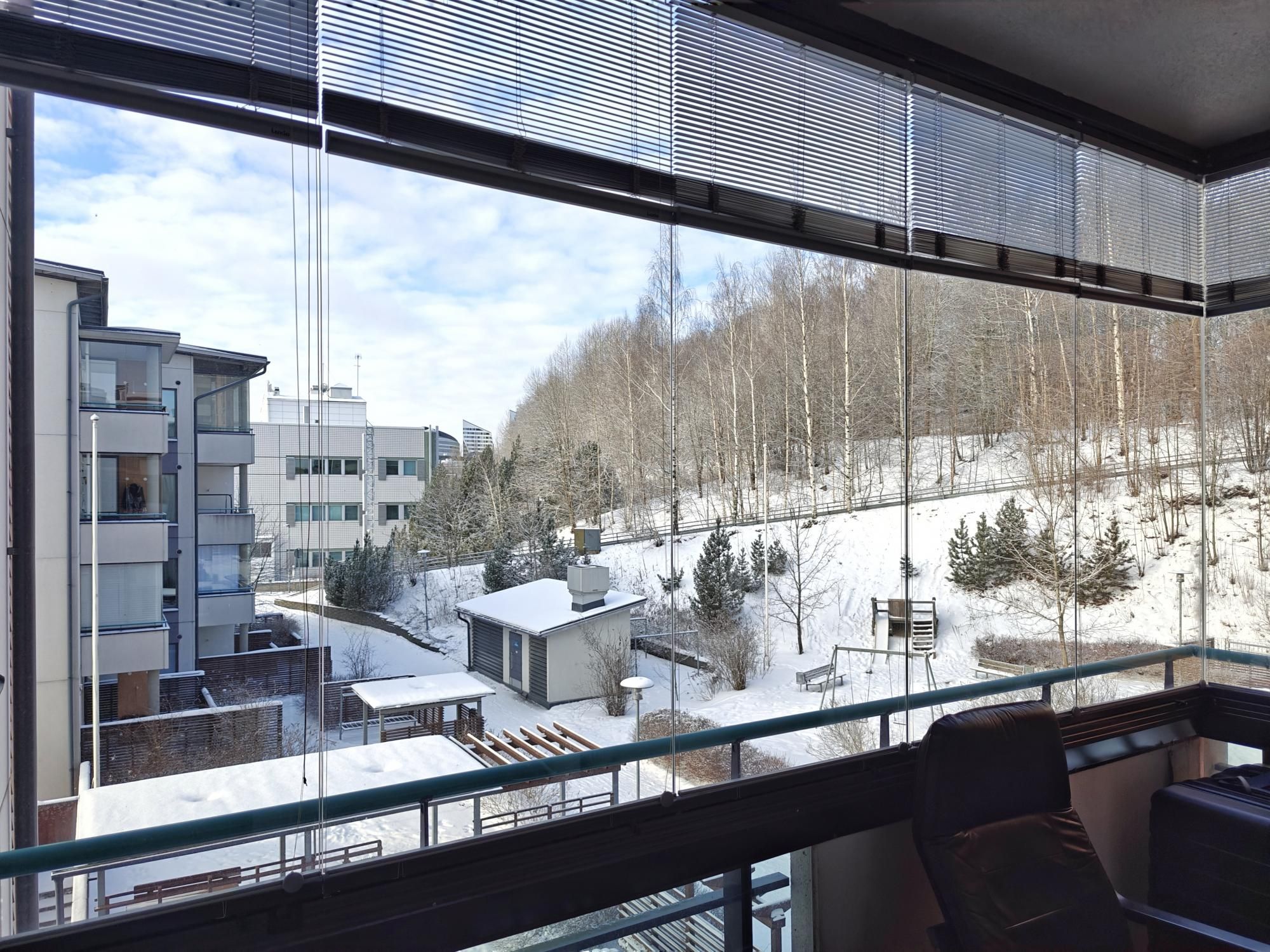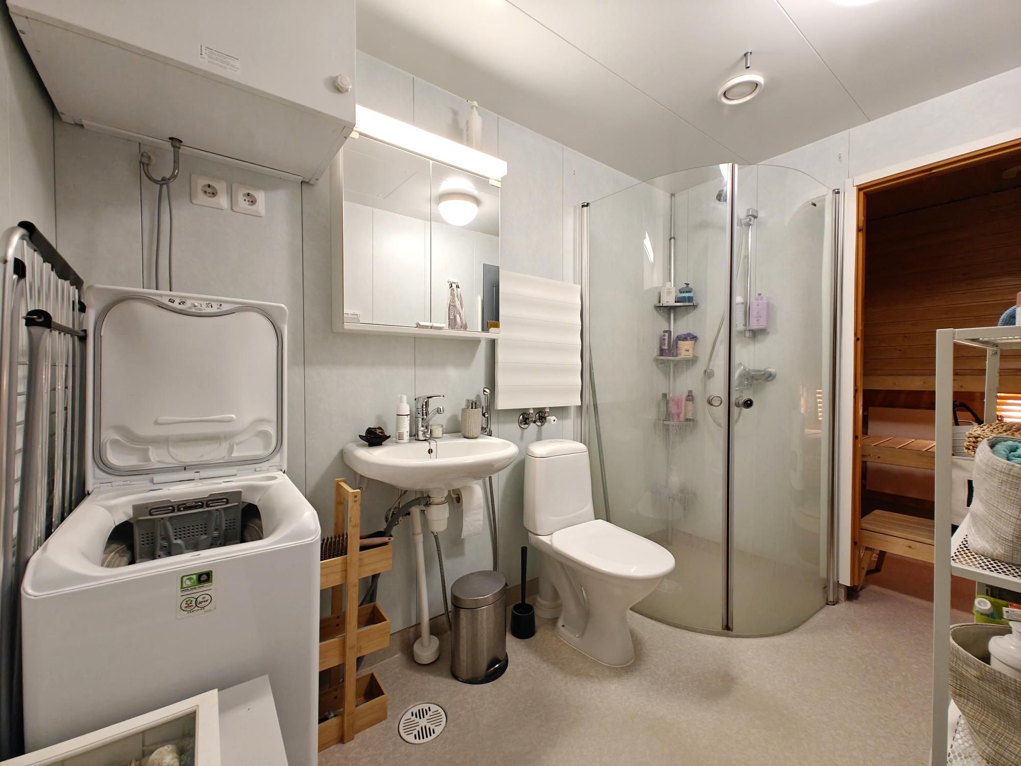 Keittiössä mukavasti säilytystilaa, astianpesukone, jääkaappipakastin, keraaminen liesi ja liesituuletin. Makuuhuoneen yhteydessä vaatehuone. Kylpyhuoneessa paikka ja liitäntä pyykinpesukoneelle sekä oma sauna. Iso lasitettu parveke sälekaihtimilla.