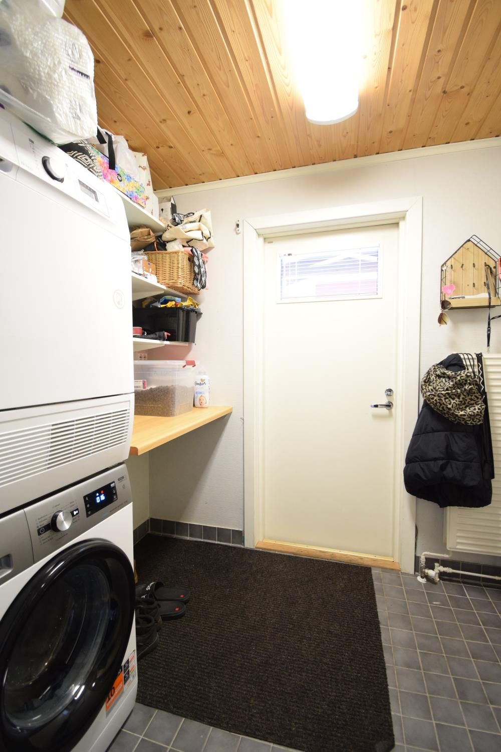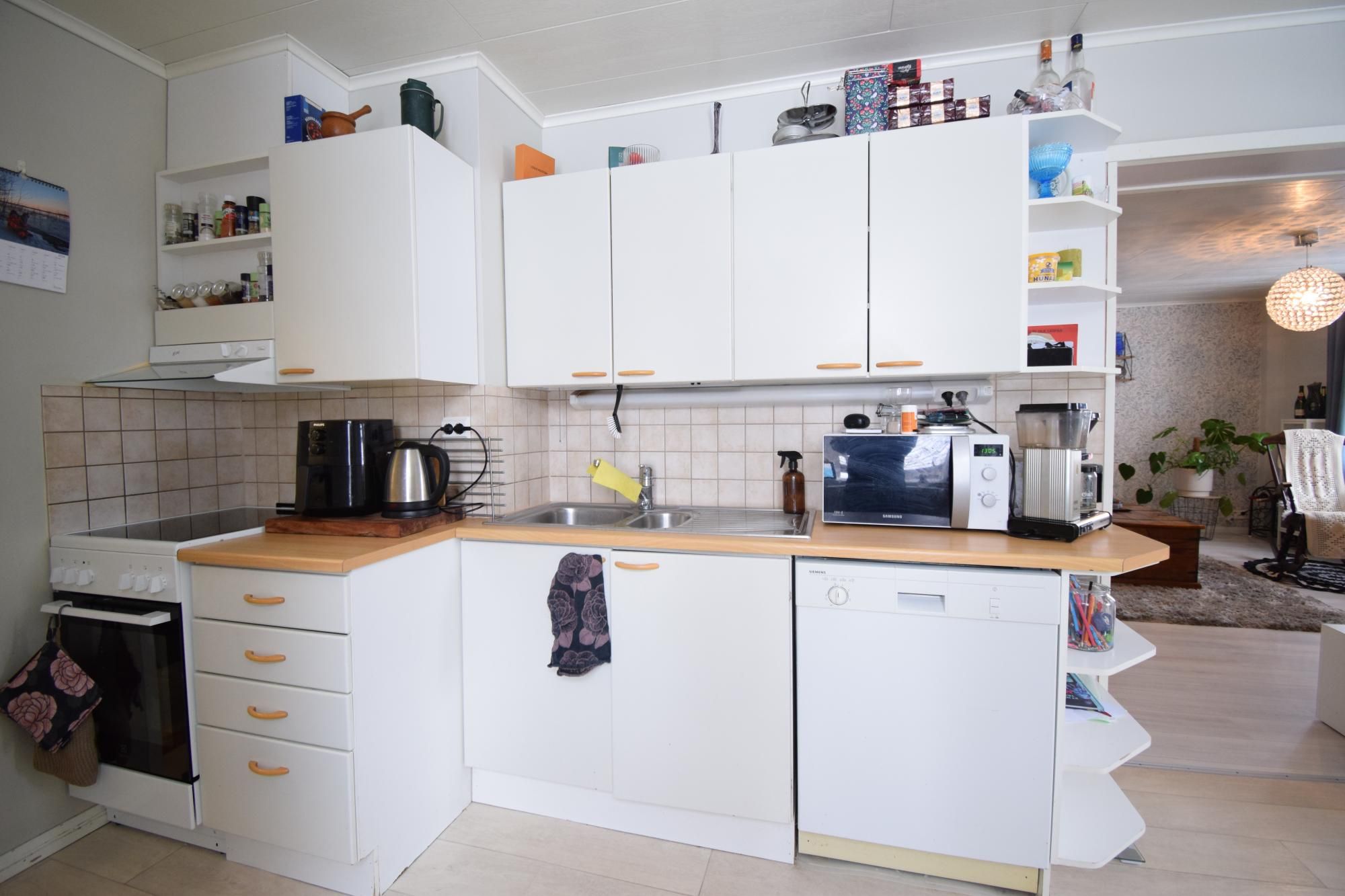 Asunnossa on yhteensä kolme makuuhuonetta, lisäksi tilava olohuone, keittiö sekä kylpyhuone, jossa on suihku ja pesukoneliitäntä. Keittiöstä löytyvät jääkaappipakastin, asitianpesukone, liesi ja liesituuletin.