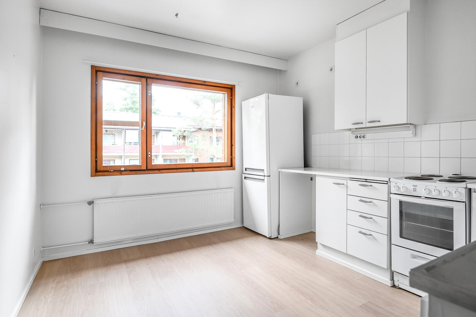 Vuokrattavana siistikuntoinen läpitalon koti, jossa on vaaleat pinnat ja tilavat huoneet, Keittiön varustuksena jääkaappipakastin ja tilaa myös ruokapöydälle. Kylpyhuoneessa on liitäntä pyykinpesukoneelle.