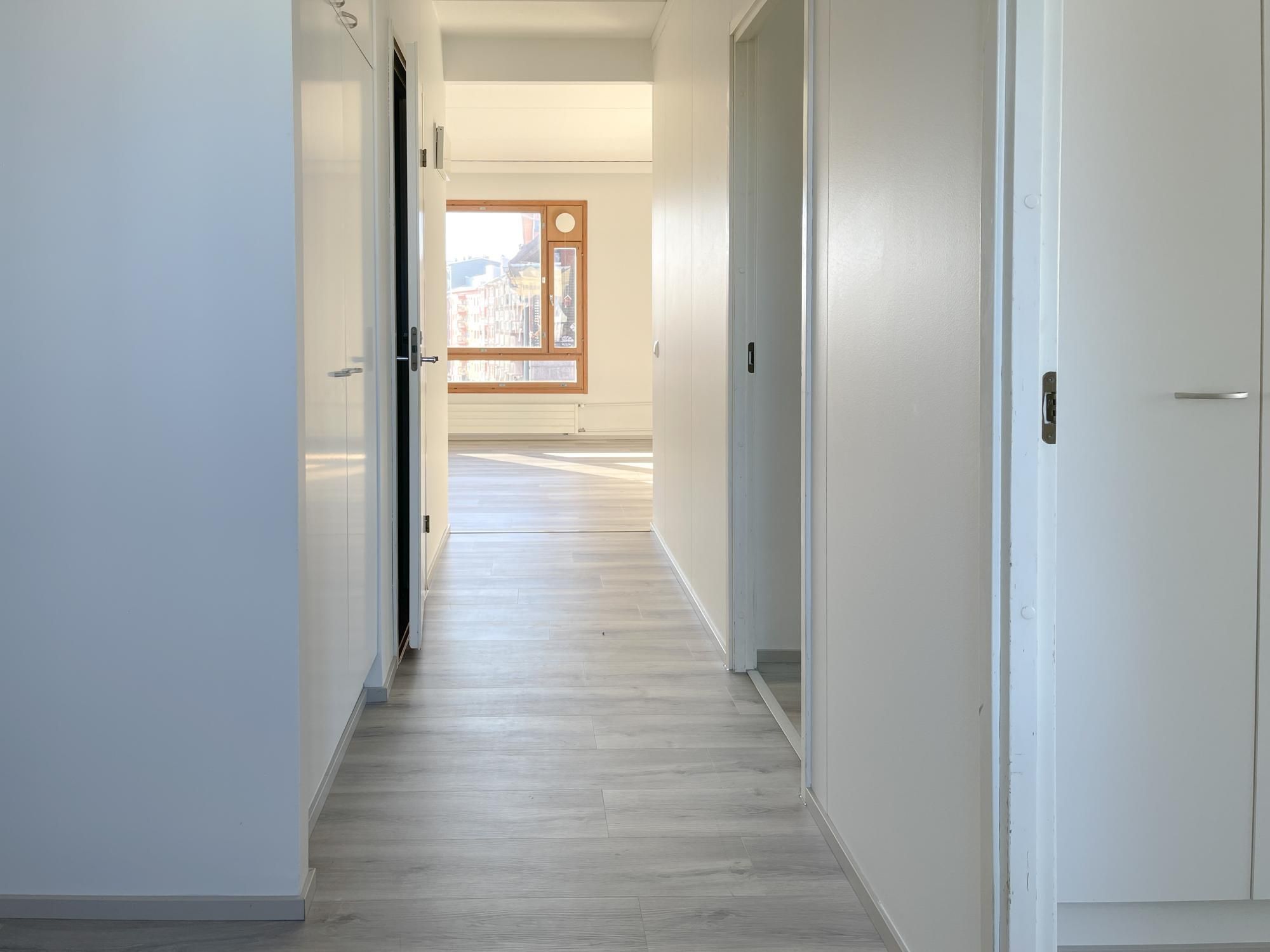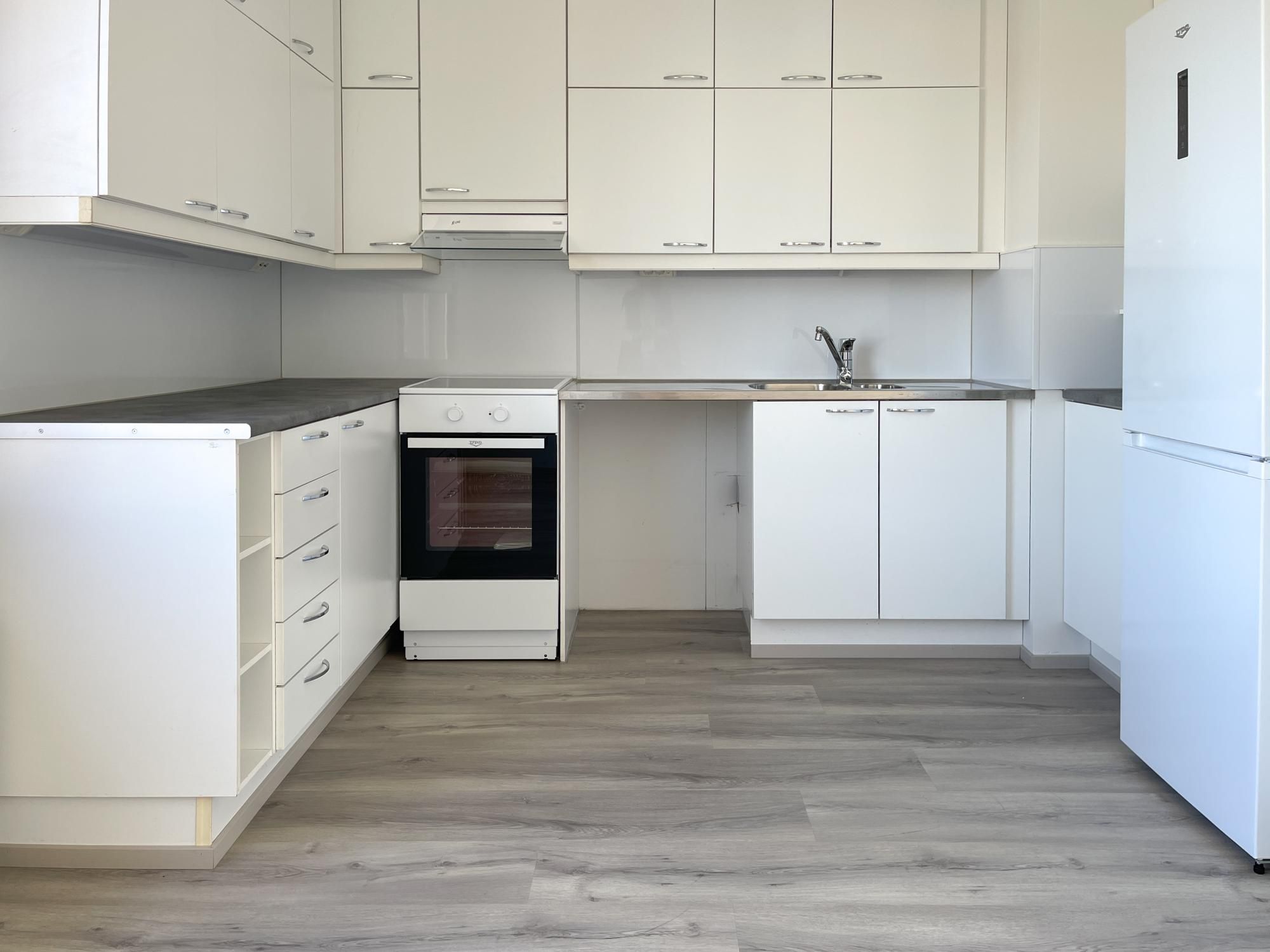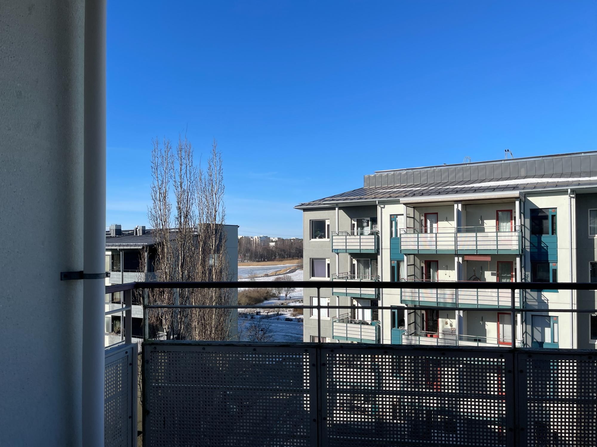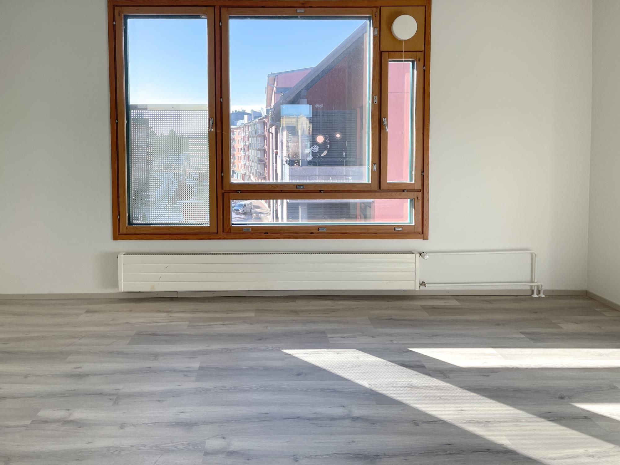 Tilava ja vaaleapintainen ylimmän kerroksen koti odottaa uusia asukkaita Pikku Huopalahdessa.