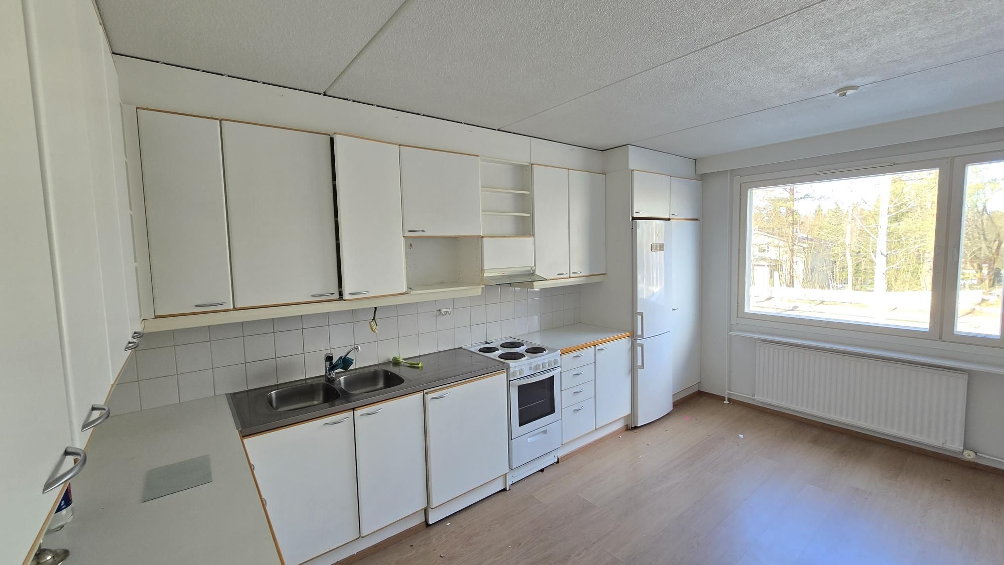 Keittiössä jää/pakastinkaappi, liesi, liesituuletin ja paikka astianpesukoneelle.
