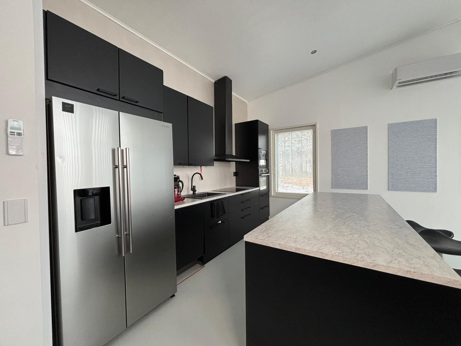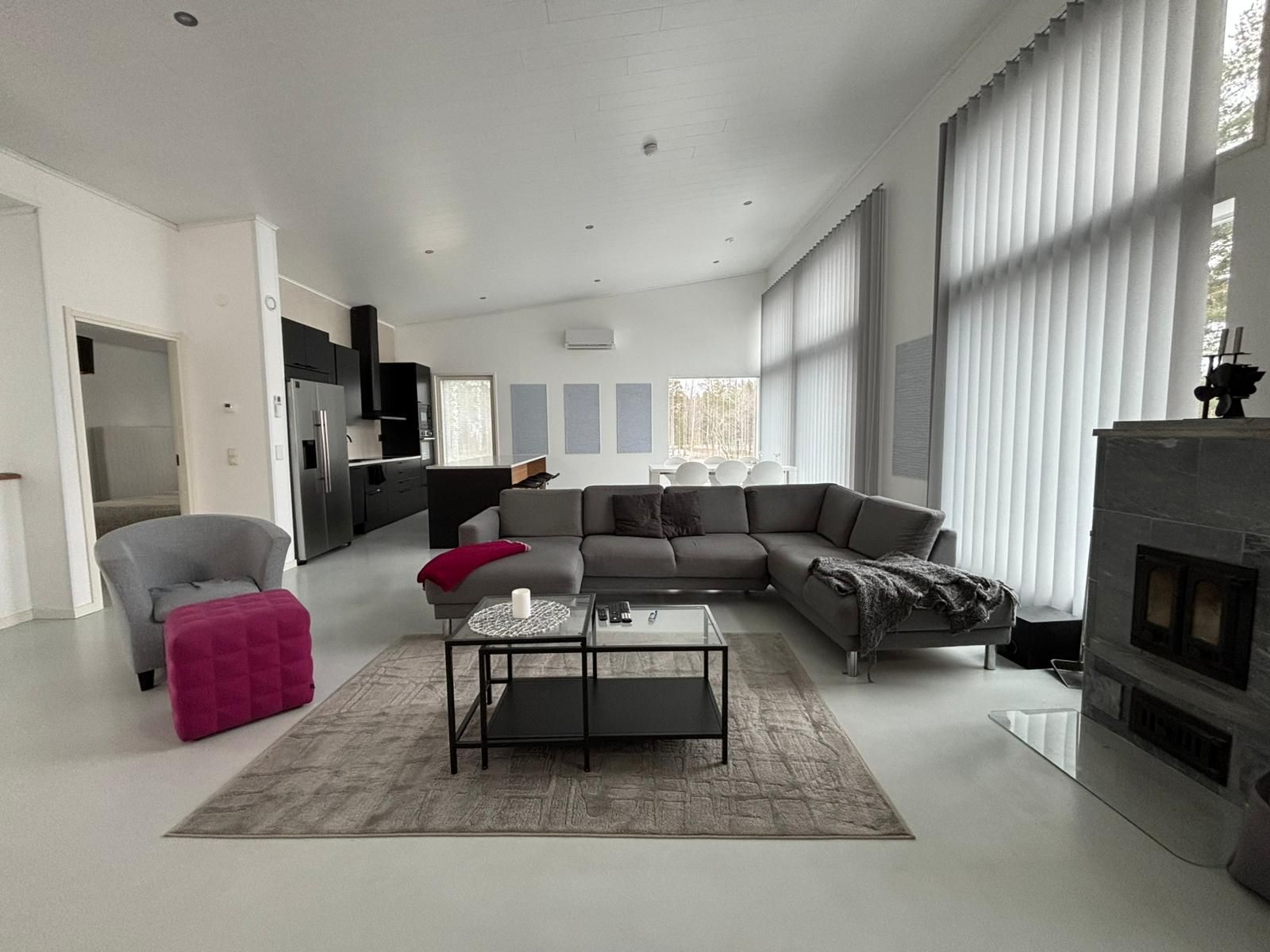 Avoin keittiö ja siihen yhdistyvä olohuone ovat koko talon katseenvangitsija. Keittiöstä löytyy moderneja ratkaisuja kuten keittiösaareke sekä integroidut kodinkoneet. Ruokailutilaan mahtuu suurempikin ruokailuryhmä. Olohuoneen puolella tunnelmaa on luomassa varaava takka, jolla voi myös talvipakkasilla lämmittää suurta oleskelutilaa.