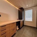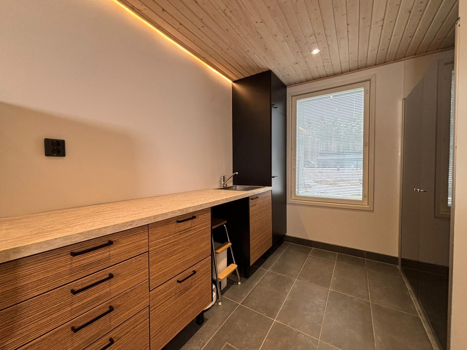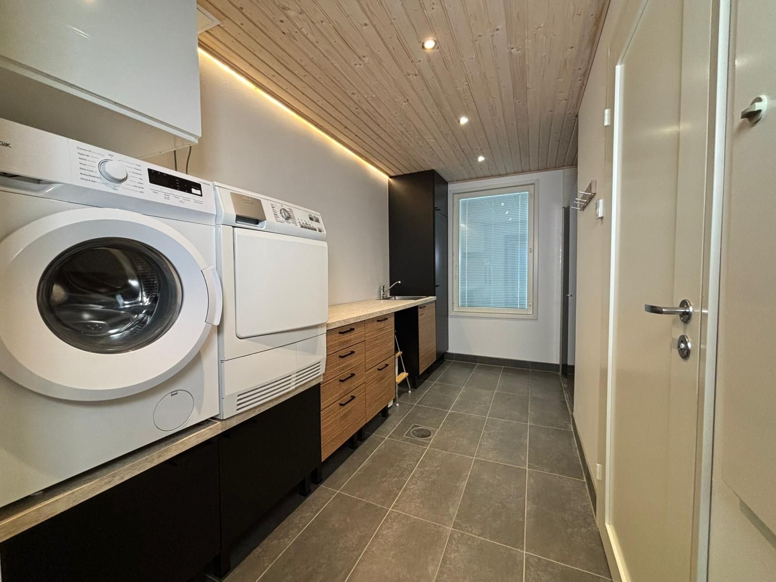 Talosta löytyy useampi wc, joista yläkerran wc on kodinhoitohuoneen yhteydessä. Kodinhoitohuoneeseen on valittu upeat puiset pinnat luomaan lämpöä ja pehmeyttä. Kodinhoitohuoneen perältä löytyy myös walk in -suihku.