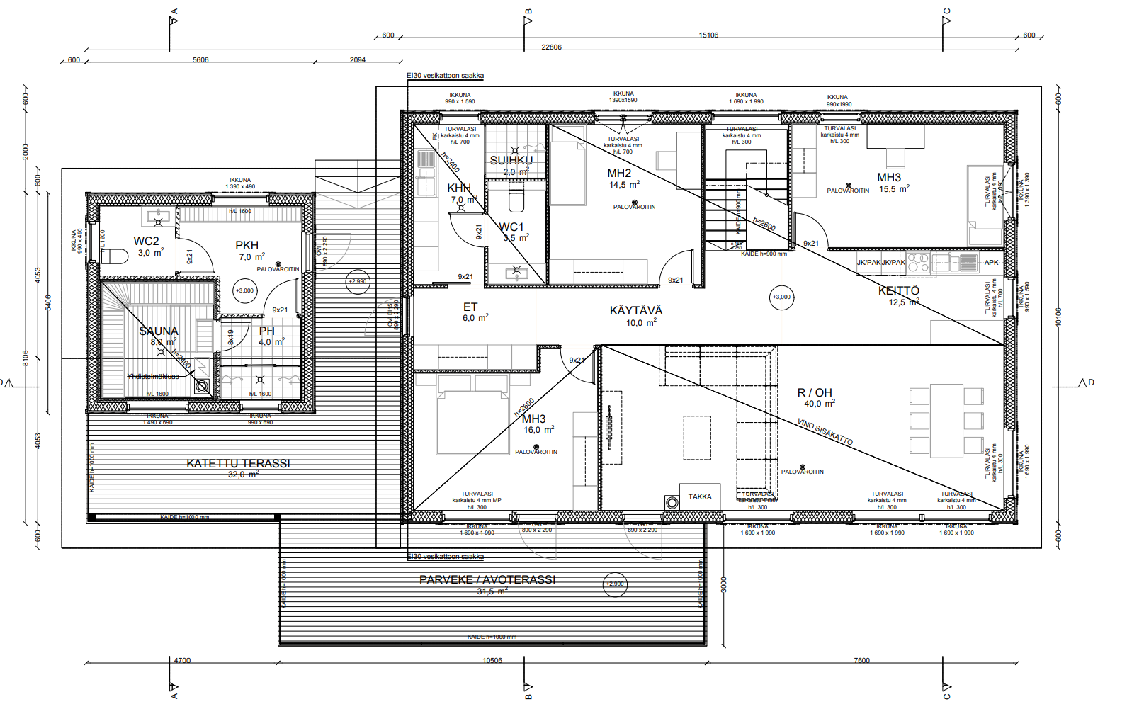 Yhteensä talossa on n.360m2 lämmitettävää tilaa.