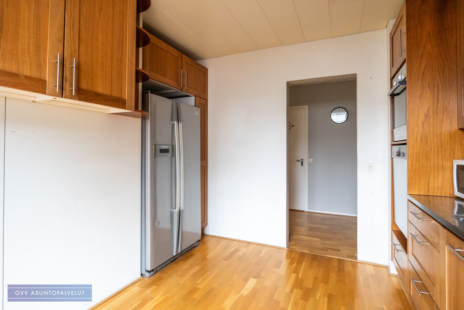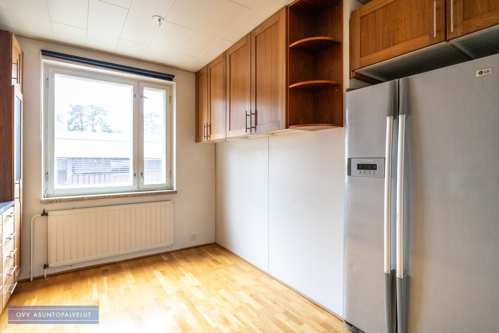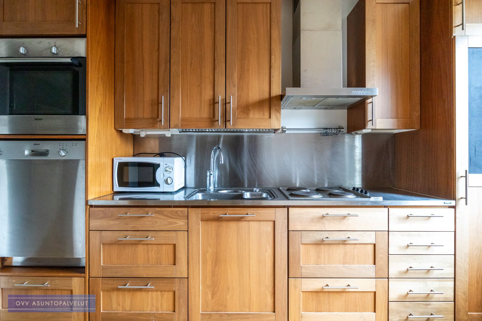 Keittiö nykyaikainen ja tyylikäs, jossa uudet kodinkoneet. Keittiössä sen verran tilaa, että pieni ruokailuryhmä sopii sinne. Olohuoneessa reilusti tilaa suuremmallekin ruokailuryhmälle.