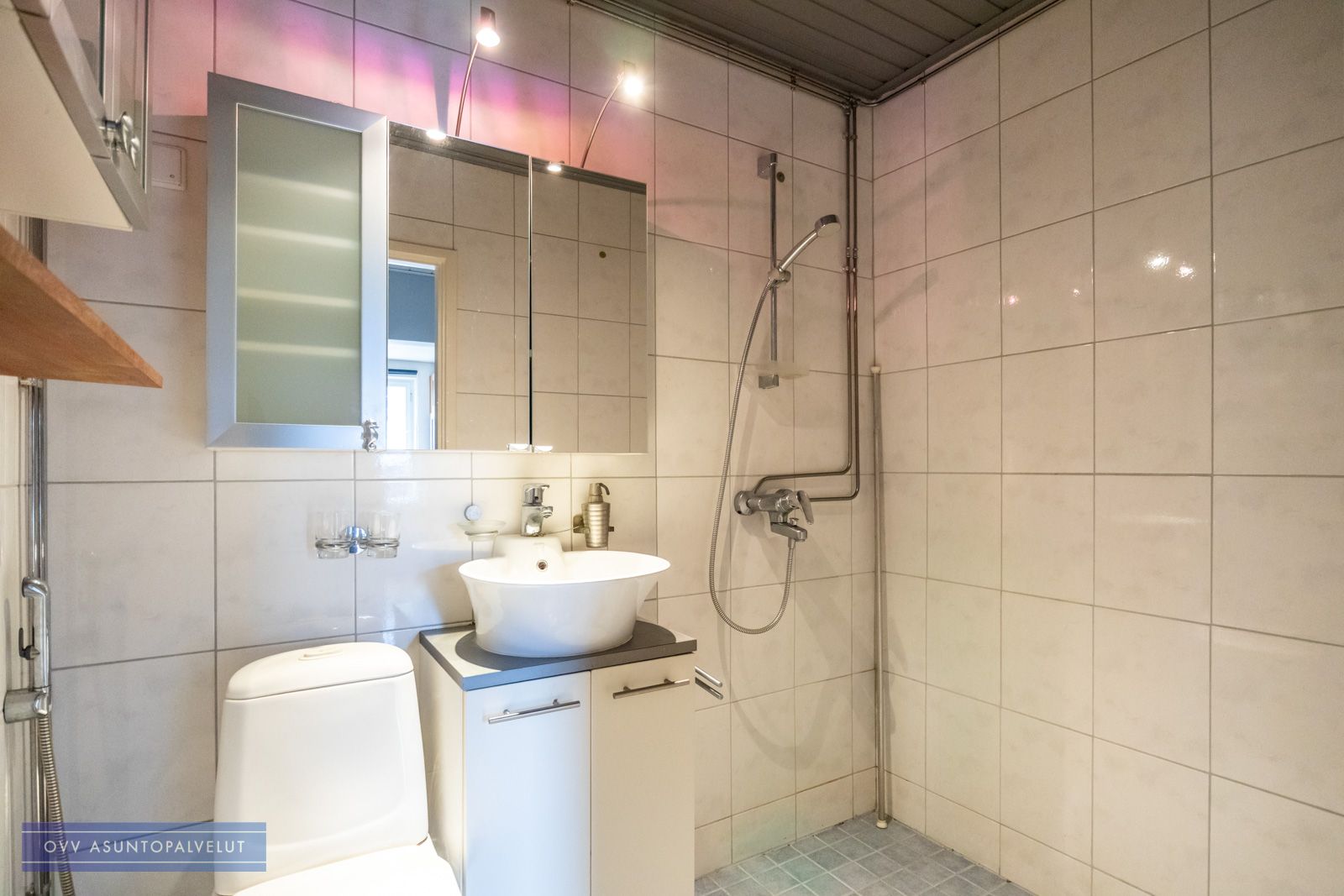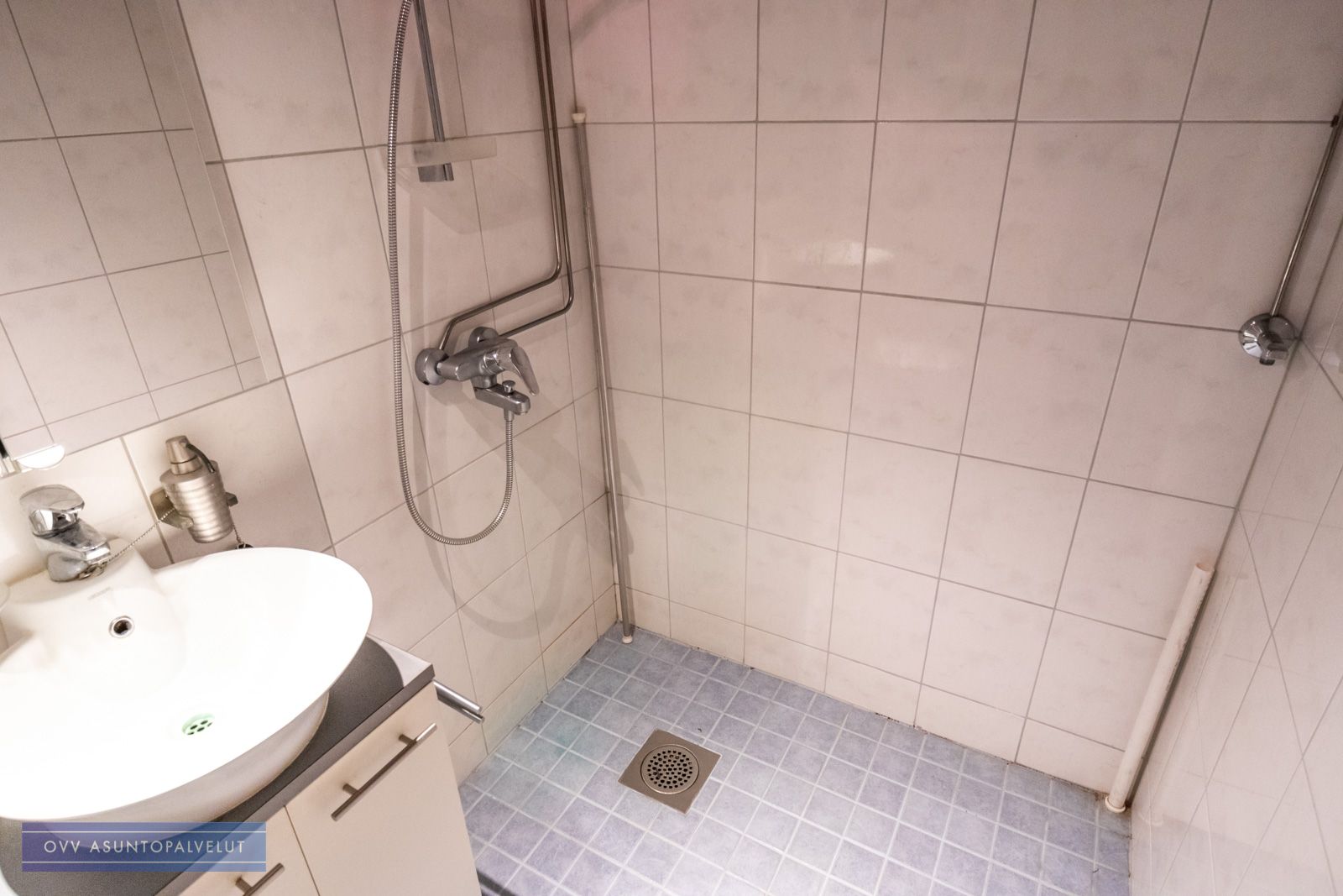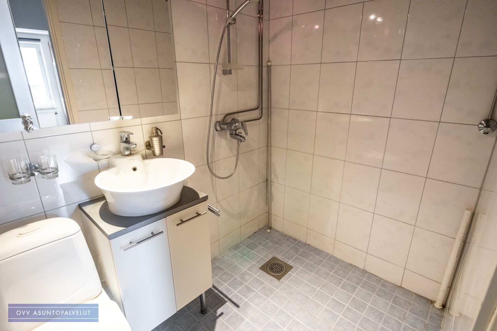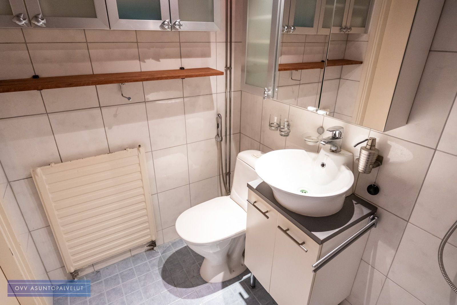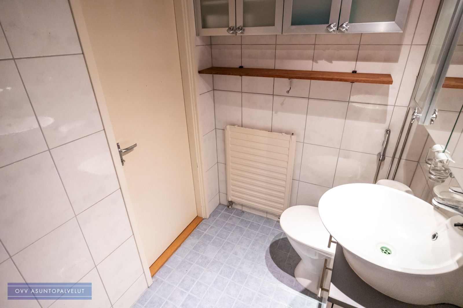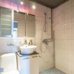 Kylpyhuone kauttaaltaan laatoitettu ja mahdollisuus asentaa pyykinpesukone.