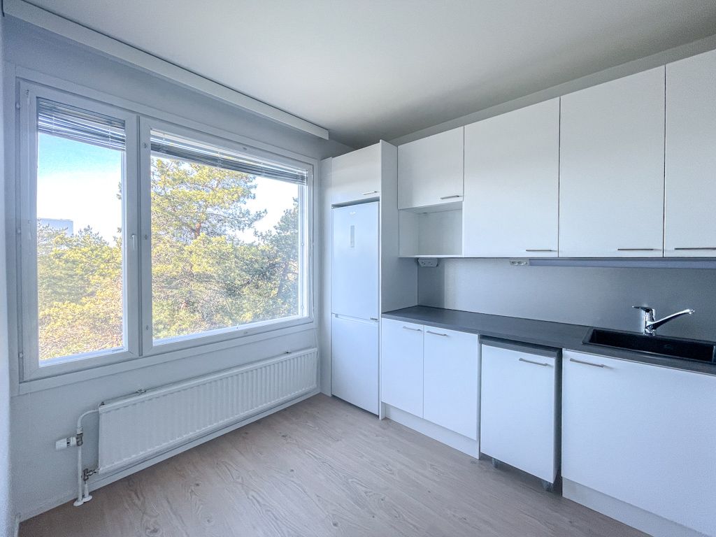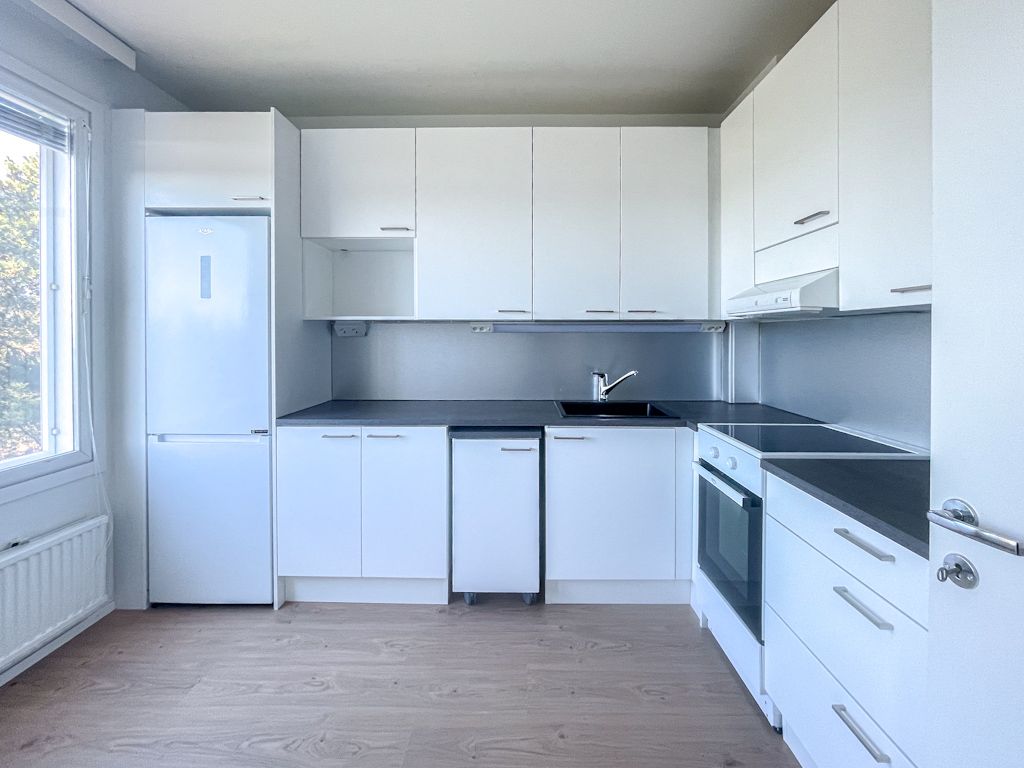 Keittiössä hyvin tilaa ruokaryhmälle ja siellä on valmis paikka astianpesukoneelle. Huoneisto on tyhjillään ja sinne pääsee muuttamaan vaikka heti.