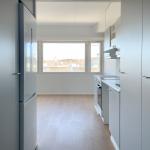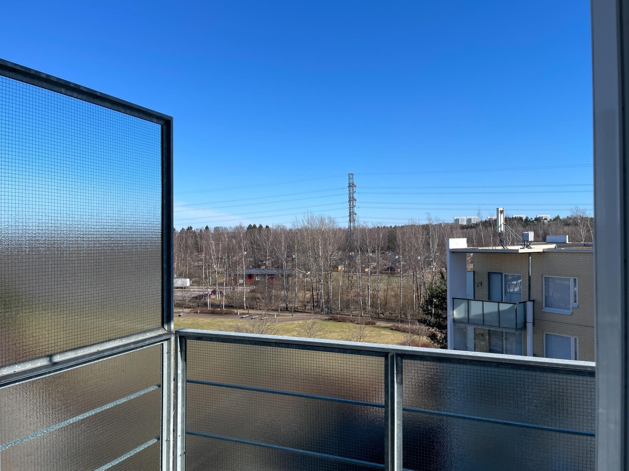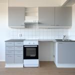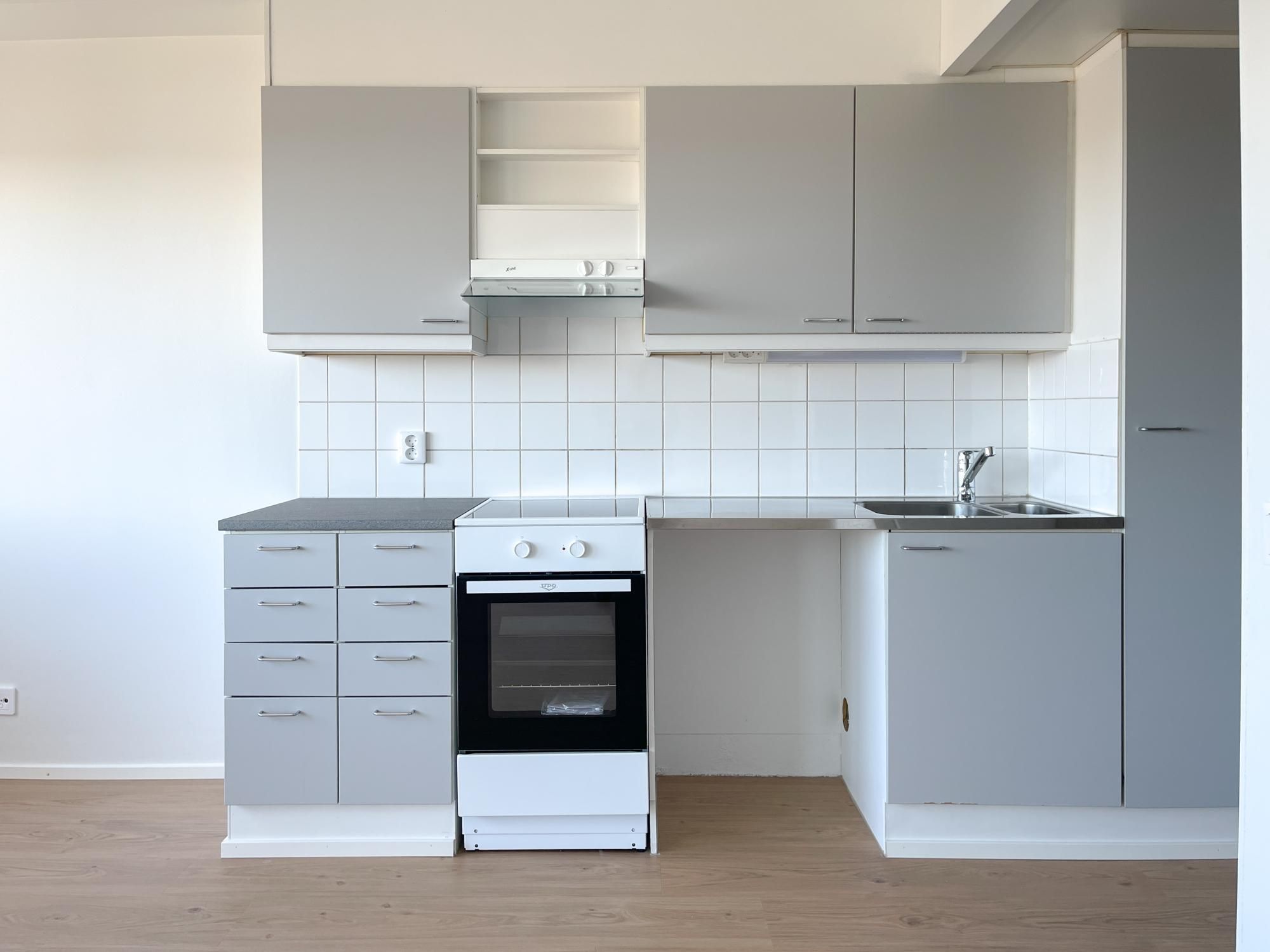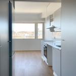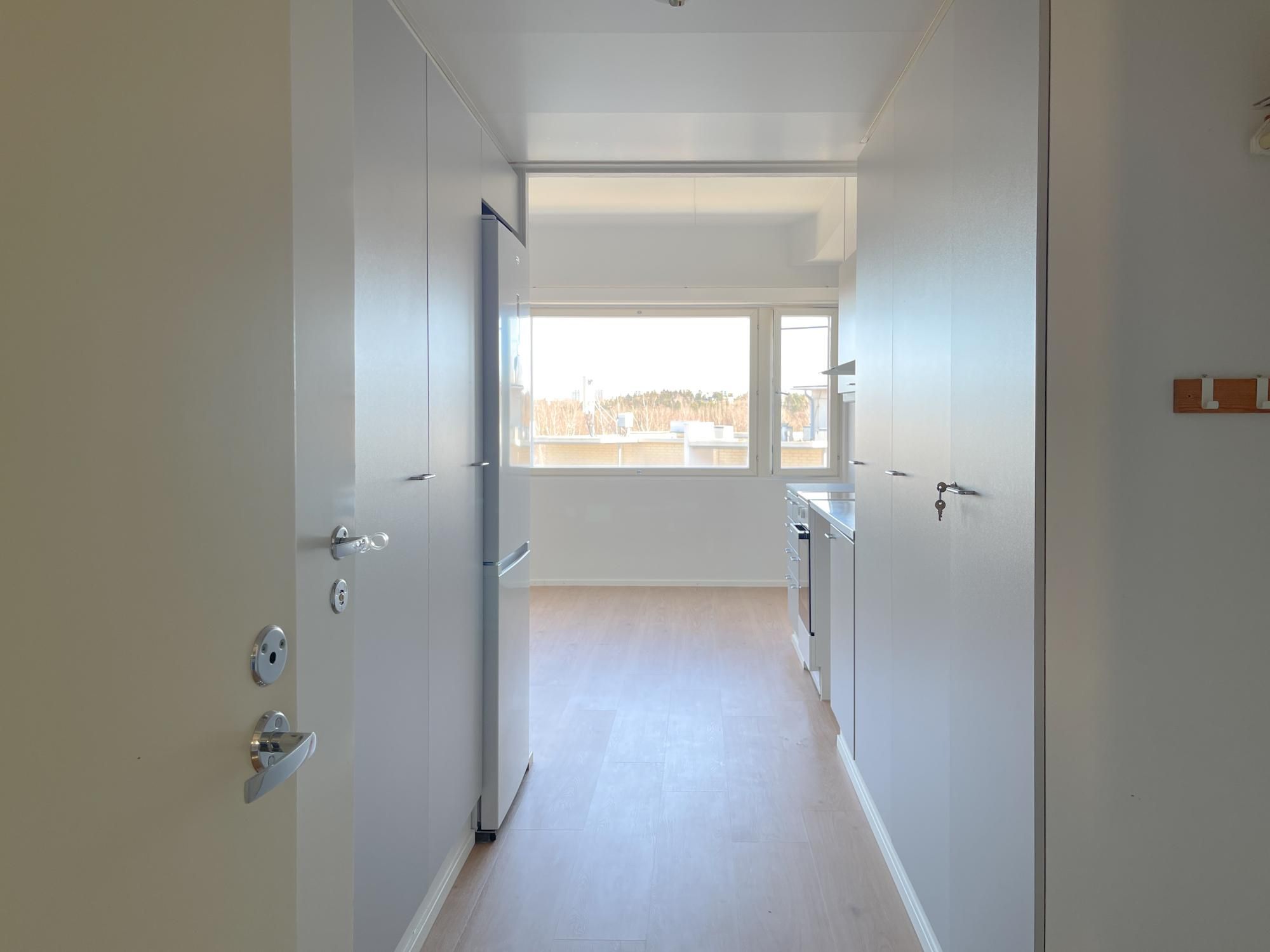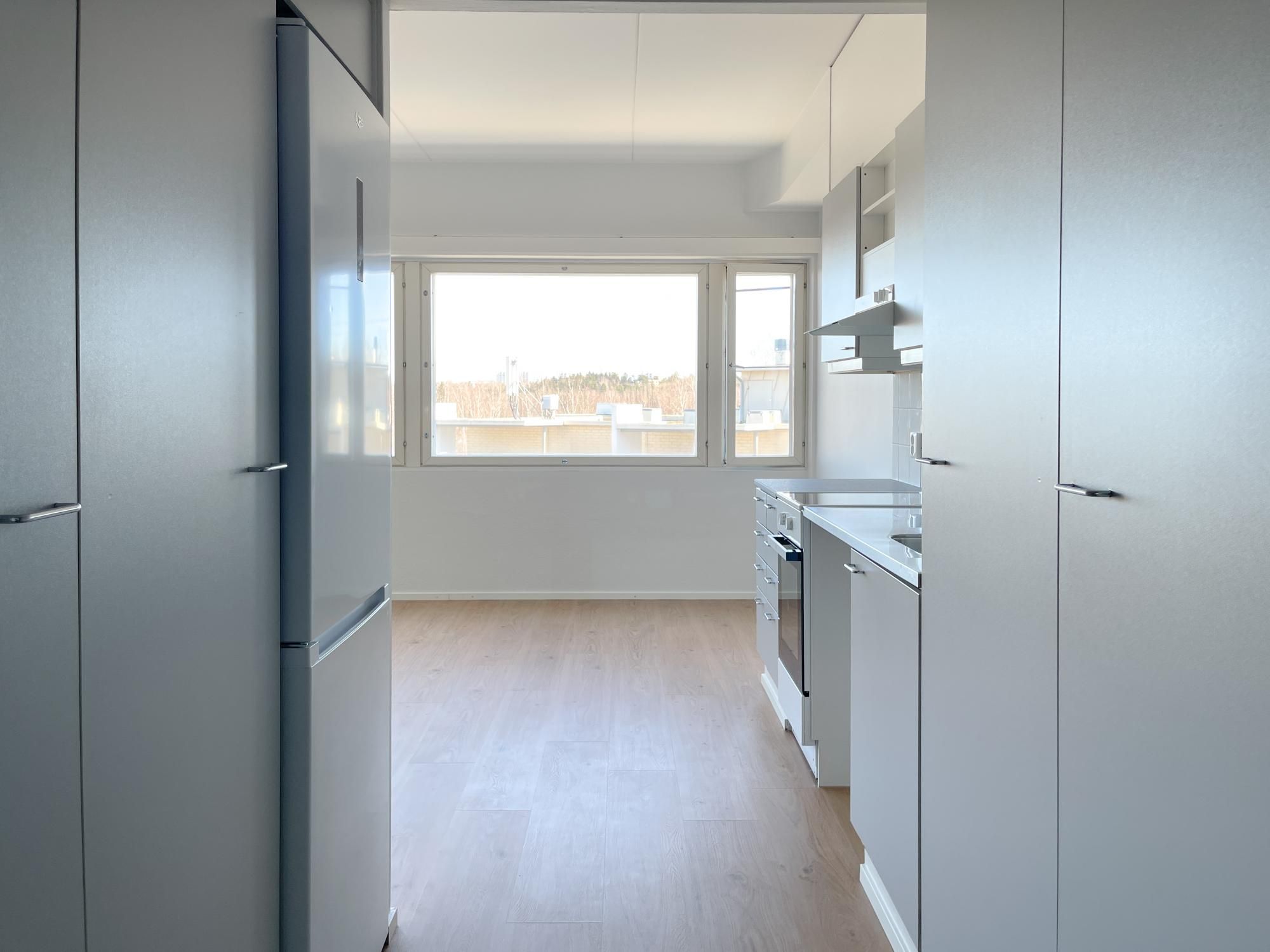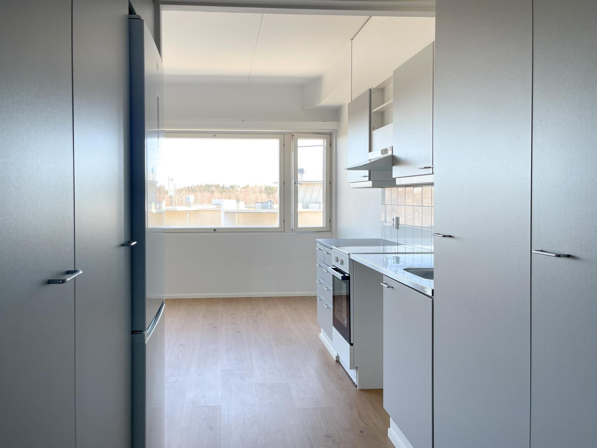 Siisti ja valoisa kuudennen kerroksen koti vehreissä maisemissa Oulunkylässä. Avarassa avokeittiössä on mukavasti kaappitilaa ja paikka astianpesukoneelle.