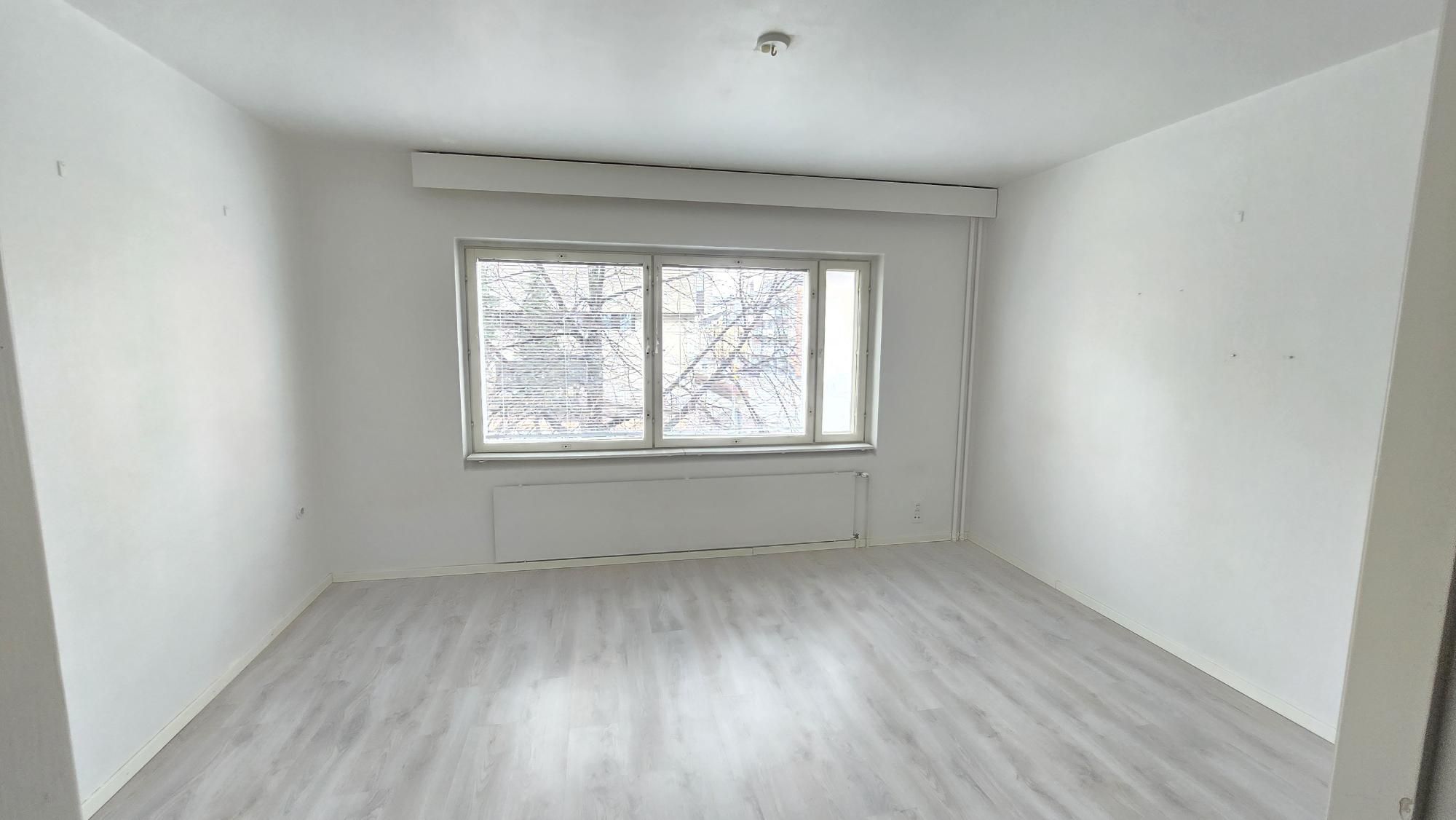 Laminaattilattiat, seinät maalipinnoin, ikkunoissa sälekaihtimet.