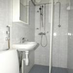 Kylpyhuoneessa paikka 45cm leveälle päältä täytettävälle pyykinpesukoneelle.