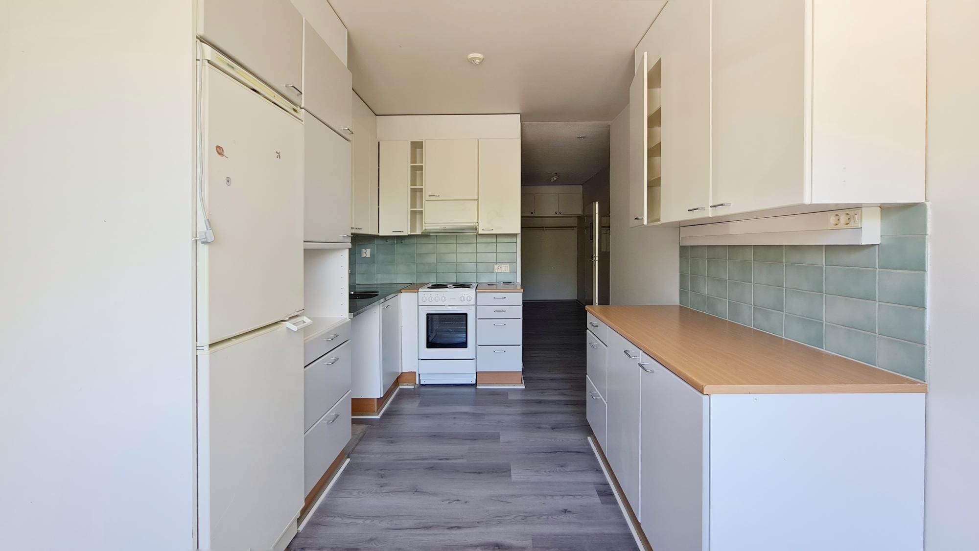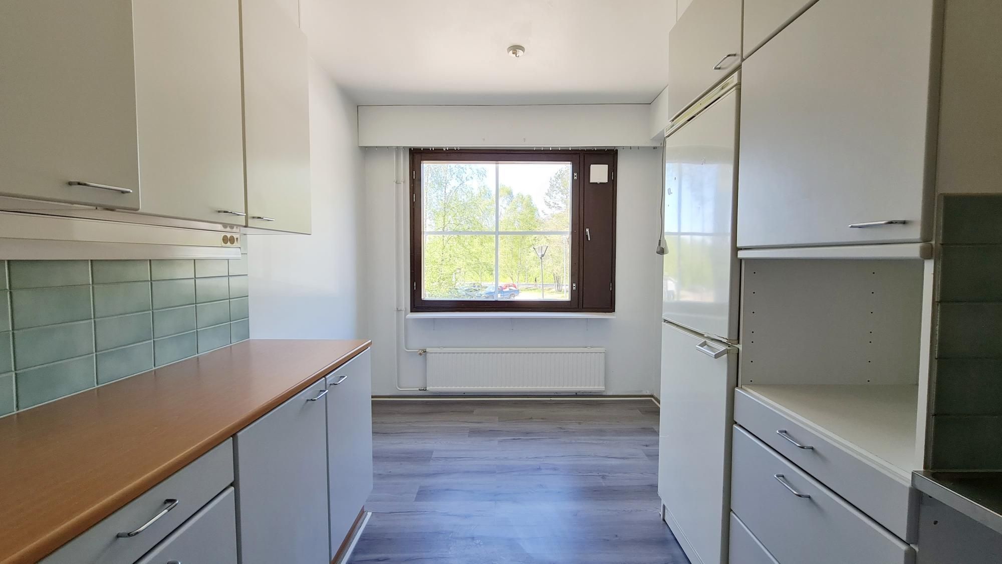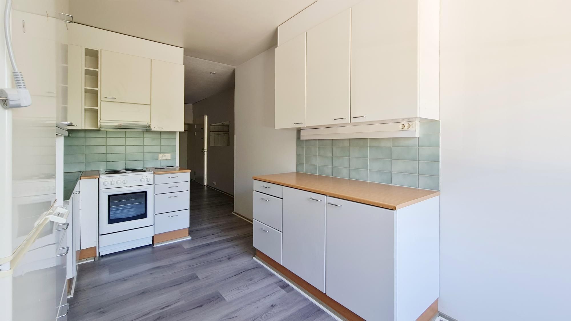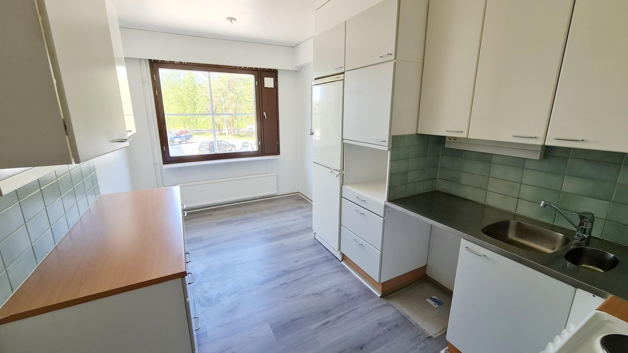 HUOM! Asunnon laminaatit vaihdetaan vielä helmikuun 2026 aikana – kuvissa aiemmat laminaatit. Laminaatit hieman kuprulla, joten vaihdetaan uudet lattiat keittiöön, eteiseen ja olohuoneeseen.
