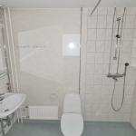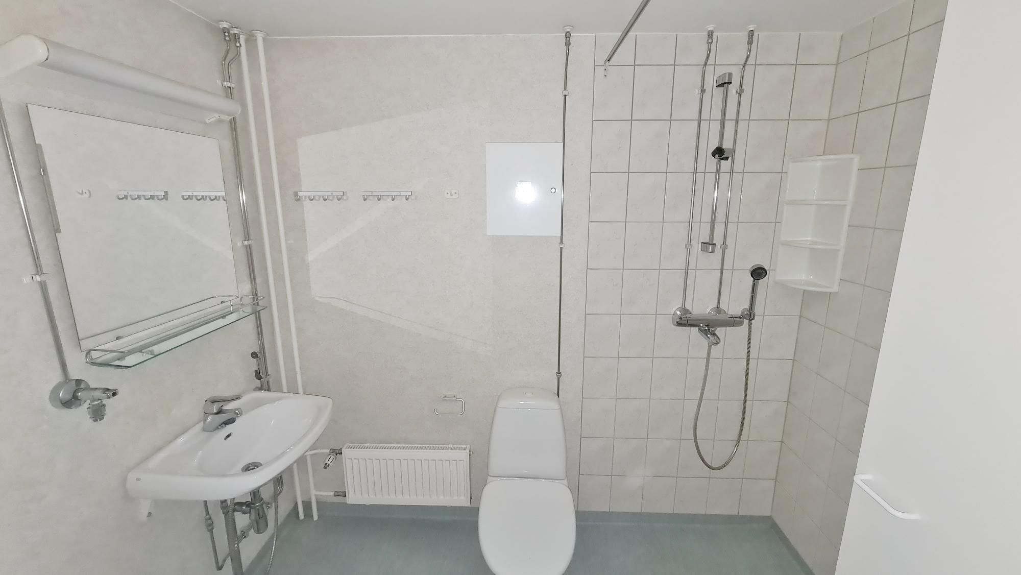 Kylpyhuoneessa suihku sekä tila ja liitäntä pyykinpesukoneelle.