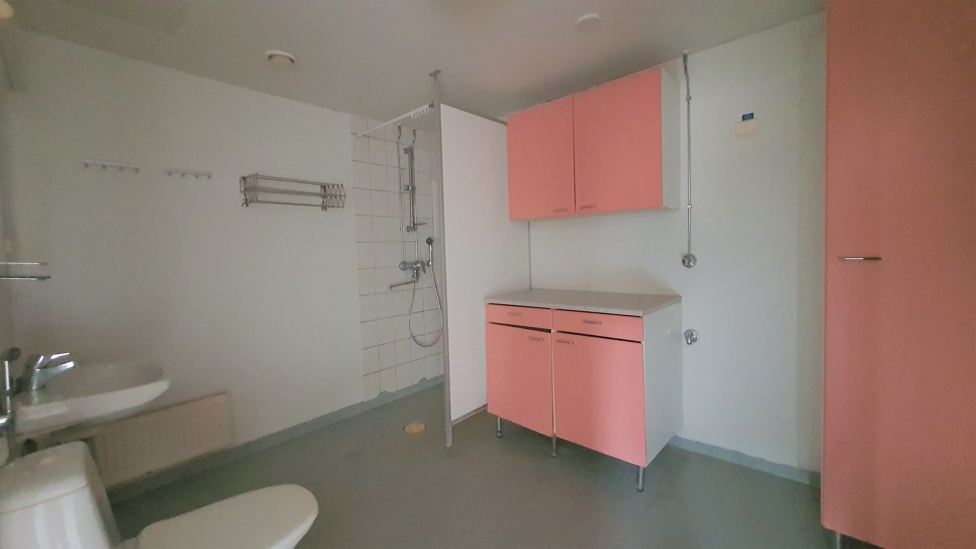 Tilavassa kylpyhuoneessa suihku sekä tila ja liitäntä pyykinpesukoneelle.